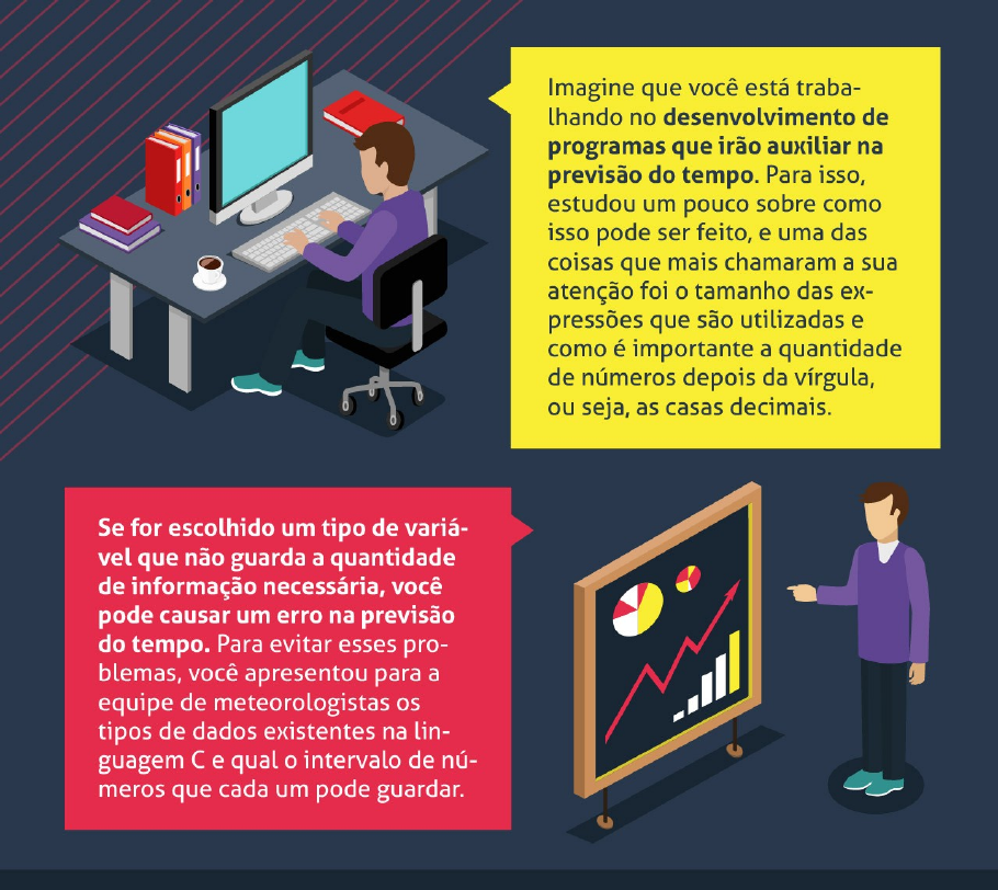 Desafio O seu desafio é escrever os tipos de dados numéricos e o seu range. Você deverá escrever isso de forma que os meteorologistas possam ajudá-lo a escolher o melhor tipo. Uma dica é, em vez de escrever a quantidade de bytes de cada tipo, mostrar qual o menor e o maior número que pode ser armazenado naquele tipo. Para entender melhor os tipos de dados em C e as faixas de valores, acesse: Clique aqui Escreva sua resposta no campo abaixo: Tipos de dados: int: número inteiro ; float: números reais com precisão simples; char: letras, dados alfanuméricos e caracteres; double: números reais com precisão dupla, void: vazio Em primeiro lugar, vamos mostrar o intervalo dos tipos numéricos, sem o uso de modificadores: Além disso, existem os modificadores de tipo: - short: diminui o espaço necessário para guardar a variável e só pode ser usado com o tipo int. - long: aumenta o espaço tomado pela variável e, portanto, aumenta seu valor máximo e/ou sua precisão e pode ser usado com int e double. - signed: indica que o número deverá ser guardado com sinal, ou seja, podem ser guardados números positivos e negativos. - unsigned: indica que o número deverá ser armazenado sem sinal; assim, o maior número aumenta, pois não temos os números negativos. De posse dessas informações, é possível escolher de forma mais consistente os tipo de dados que precisarão ser armazenados para uma boa previsão do tempo.