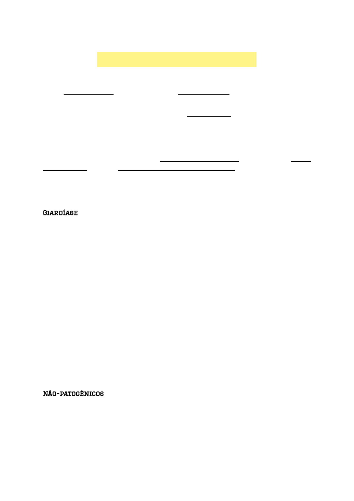 Semana 8, 28/09 Protozoários intestinais: Flagelados e ciliados Flagelados intestinais: Giardia duodenalis | Dientamoeba fragilis | Chilomastix mesnili | Trichomonas hominis ▪ Cavidade bucal: Trichomonas tenax ▪ Trato genitourinário: Trichomonas vaginalis Ciliado intestinal: Balantidium coli ↪ Os estágios usuais de diagnóstico dos protozoários intestinais são os trofozoítos e cistos. Flagelados Protozoários com forma regular piriforme, elipsóide ou oval, geralmente com fibrilas citoplasmáticas visíveis e núcleo próximo a uma das extremidades (identificação via número, presença ou ausência nuclear e distribuição da cromatina periférica). Flagelos com número e disposição variantes entre as espécies, mas morfologicamente característicos. Giardíase Giardia duodenalis (sinonímias: G. lamblia e G. intestinalis) Pode causar quadros gastrointestinais agudos e crônicos, de intensidade variável, podendo chegar à produção de uma síndrome de má absorção. Cisto: 8 x 12 um; oval ou elipsoide; 2 ou 4 núcleos, um número variável de fibrilas, axonemas de flagelos e os corpos escuros em forma de meia-lua. Trofozoíto: 10 x 20 um; perinha com simetria bilateral, dorso convexo e ventral côncavo com disco suctorial, corpos medianos, um axóstilo central e dois núcleos; 4 pares de flagelos. Transmissão: ingestão de cistos em água ou alimentos contaminados e via fecal-oral. Local: intestino delgado. Ciclo biológico: monoxênico. Patogenia: pode ser desde assintomático até causar diarreia grave e má absorção. ▪ Giardíase aguda: desenvolvimento após um período de incubação de 1 a 14 dias e geralmente dura de 1 a 3 semanas. Os sintomas incluem: diarreia, dor abdominal, distensão abdominal, náuseas e vômitos. ▪ Giardíase crônica: sintomas recorrentes, mais suscetível a má absorção e debilitação. Diagnóstico: laboratorial para pesquisa de trofozoítos ou cistos nas fezes e trofozoítos no fluido duodenal. Tratamento: metronidazol, tinidazol, secnidazol, nitazoxanida, furazolidona (inibe a capacidade de adesão da G. duodenalis), paromomicina ou quinacrina. Não-patogênicos Chilomastix mesnili Flagelado não patogênico frequentemente descrito como um organismo comensal no trato gastrointestinal humano. Cisto: 5 x 8 um; limãozinho com um núcleo grande. Trofozoíto: 11 um; limãozinho com caule = flagelos na extremidade oposta ao núcleo. Transmissão: ingestão de cistos em água ou alimentos contaminados e via fecal-oral. Local: intestino grosso e possivelmente delgado. Ciclo biológico: monoxênico. Patogenia: não patogênico, mas pode ser um indicador de contaminação fecal de um alimento ou de água. Diagnóstico: pesquisa de trofozoítos e cistos nas fezes. Tratamento: não patogênico. Ciliados Balantidium coli como maior dos protozoários parasitas humano e o único ciliado patogênico encontrado no cólon. Os trofozoítos vivos possuem um movimento rotatório geralmente rápido e direcional, com superfície revestida por cílios, citoplasma com um núcleo ou macronúcleo, grande e reniforme (parecendo um feijãozinho) + segundo núcleo ou micronúcleo na região deprimida do macronúcleo. Balantidiose Balantidium coli Infecção humana pouco frequente – ulcerações que perfuram a parede intestinal. Cisto: 50 a 70 um; grande e arredondado; com 2 núcleos, sendo um macro e outro micro . Trofozoíto: 40 a 200 um; superfície revestida por cílios, citoplasma com um macronúcleo = feijãozinho e micronúcleo na região deprimida do macronúcleo; parece ter um ânuszinho. Transmissão: ingestão de cistos em água ou alimentos contaminados. Local: intestino grosso (cólon) e apêndice. Ciclo biológico: monoxênico. Patogenia: pode ser desde assintomático, agudo ou crônico com sintomas abdominais. Complicações de diarreia ou disenteria associadas podem ocorrer em infecções prolongadas. Os sintomas podem ser graves ou fatais em imunocomprometidos. Diagnóstico: laboratorial para pesquisa de trofozoítos ou cistos nas fezes ou tecido intestinal. Tratamento: metronidazol e tetraciclina. Protozoários Urogenitais: Flagelados Flagelados do sistema urogenital: Trichomonas vaginalis Os Trichomonas apresentam membrana ondulante característica, mas há certa variedade de espécies de acordo com o local da infecção. tricomoníase Trichomonas vaginalis Cisto: não tem forma cística. Trofozoíto: 7 x 9 um; elipsoide, piriforme ou oval, com 4 flagelos anteriores = Cebolinha com agulha, um grande núcleo, um axóstilo e uma membrana ondulante que se estende ao longo da metade do corpo. Transmissão: infecção sexualmente transmissível. Local: trato genital feminino e uretra e próstata masculinas - produz a infecção e não sobrevive fora do sistema urogenital. Ciclo biológico: monoxênico. Patogenia: desenvolvimento após um período de incubação de 4 a 28 dias, com sintomas surgindo em uma média de 4 a 8 dias. ▪ Vagina: vaginite com secreção purulenta (estado de severa inflamação) é o sintoma proeminente e pode ser acompanhada por lesões vulvar e cervical, dor abdominal, disúria e dispareunia. Presença de corrimento vaginal de cor amarelo-esverdeado, bolhoso, com odor característico e mais frequente no período pós-menstrual; ▪ Uretra e próstata: assintomática; ocasionalmente podem ocorrer uretrite, epididimite e prostatite. Há leve sensação de prurido na uretra e fluxo leitoso ou purulento no meato uretral. Diferente da mulher, o homem pode ter somente uma infecção auto-limitada. Papel crítico na amplificação da transmissão do HIV, sendo um importante cofator na propagação do vírus: causa pontos hemorrágicos na mucosa, permitindo o acesso do vírus para a corrente sanguínea Diagnóstico: laboratorial para pesquisa de trofozoítos na urina, secreções vaginal ou uretral ou esperma. Tratamento: preservativo como medida profilática. Metronidazol, tinidazol, ornidazol, nimarazol, carnidazol e se
