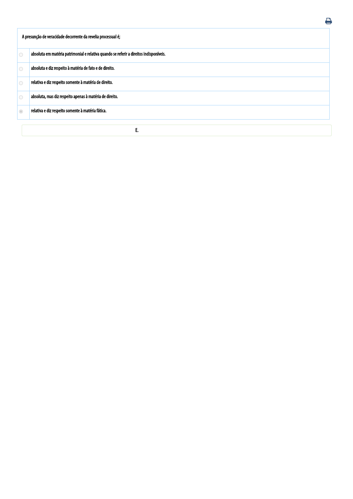 04/03/2022 01:45 Universidade Paulista - UNIP : Disciplina On-line. https://unip.br/aluno/central/sistemas/acesso/138 1/1 A presunção de veracidade decorrente da revelia processual é; A absoluta em matéria patrimonial e relativa quando se referir a direitos indisponíveis. B absoluta e diz respeito à matéria de fato e de direito. C relativa e diz respeito somente à matéria de direito. D absoluta, mas diz respeito apenas à matéria de direito. E relativa e diz respeito somente à matéria fática. Você já respondeu e acertou esse exercício. A resposta correta é: E. 04/03/2022 01:45 Universidade Paulista - UNIP : Disciplina On-line. https://unip.br/aluno/central/sistemas/acesso/138 1/1 Sobre a revelia, é INCORRETO a�rmar: A Os prazos contra o revel que não tenha patrono nos autos �uirão da data de publicação do ato decisório no órgão o�cial. B O revel poderá intervir no processo em qualquer fase, recebendo-o no estado em que se encontrar. C O revel poderá intervir no processo em qualquer fase, recebendo-o no estado em que se encontrar. D Não presumir-se-ão verdadeiras as alegações de fato formuladas pelo autor se o litígio versar sobre direitos disponíveis. E n.d.a. Você já respondeu e acertou esse exercício. A resposta correta é: D. 04/03/2022 01:45 Universidade Paulista - UNIP : Disciplina On-line. https://unip.br/aluno/central/sistemas/acesso/138 1/1 Gabriel, pessoa capaz, foi revel em ação na qual Marcelo formulou pedido de condenação. Gabriel não possui patrono nos autos. Em razão da revelia: A se Gabriel vier a intervir no processo, o Juiz deverá dar nova oportunidade para apresentação de contestação. B o pedido de Marcelo será necessariamente acolhido, pois a revelia induz presunção absoluta de veracidade dos fatos a�rmados na inicial. C o Juiz deverá nomear curador especial para Gabriel, o qual poderá contestar por negativa geral, invertendo-se o ônus da prova. D o Juiz determinará a intimação pessoal de Gabriel a �m de que compareça nos autos, sob pena de confesso. E os prazos, em relação a Gabriel, correrão independentemente de intimação, a partir da publicação de cada ato decisório. Você já respondeu e acertou esse exercício. A resposta correta é: E. 04/03/2022 01:45 Universidade Paulista - UNIP : Disciplina On-line. https://unip.br/aluno/central/sistemas/acesso/138 1/1 De acordo com a legislação processual civil, se o réu não contestar a ação, será considerado revel e presumir-se-ão verdadeiras as alegações de fato formulados pelo autor. Sobre o instituto da revelia, indique qual das assertivas abaixo apresenta informação verídica: A Depois da decretação da revelia, ao réu revel não é permitida a produção de provas. B Não ocorre o efeito material da revelia quando as alegações de fato formuladas pelo autor forem inverossímeis ou estiverem em contradição com prova constante dos autos. C A não apresentação de resposta tem como necessária consequência a decretação da revelia e a procedência do pleito autoral. D Decretada a revelia, o juiz deve julgar antecipadamente os pedidos, sendo desnecessária produção probatória. E n.d.a. Você já respondeu e acertou esse exercício. A resposta correta é: B. 04/03/2022 01:45 Universidade Paulista - UNIP : Disciplina On-line. https://unip.br/aluno/central/sistemas/acesso/138 1/1 O Ministério Público, na qualidade de substituto processual, ajuizou uma ação de investigação de paternidade em face de Carlos, na defesa dos interesses do infante Daniel, que é incapaz. Carlos, regularmente citado, não compareceu à audiência de mediação que fora determinada e sequer apresentou contestação no prazo legal. Nesse cenário, é correto a�rmar que: A Carlos se tornou revel e haverá presunção de veracidade da paternidade a�rmada pelo Ministério Público. B Carlos se tornou revel, mas não haverá presunção de veracidade, por se tratar de direito indisponível. C Carlos se tornou revel, mas não haverá presunção de veracidade, por se tratar de direito indisponível. D não haverá revelia, e o Ministério Público terá o ônus de produzir prova da paternidade a�rmada. E o processo terá que ser extinto, pois o Ministério Público não tem legitimidade extraordinária para a causa. Você já respondeu e acertou esse exercício. A resposta correta é: B. 04/03/2022 01:46 Universidade Paulista - UNIP : Disciplina On-line. https://unip.br/aluno/central/sistemas/acesso/138 1/1 Rodolfo ajuizou ação contra Felipe, versando o litígio sobre direito indisponível. Devidamente citado, o réu não ofereceu contestação no prazo legal, tornando-se revel. Nesse caso, a revelia: A impõe que o pedido seja julgado procedente. B torna precluso o direito de produzir provas. C veda a interposição de recurso contra a sentença. D impede o réu de intervir no processo, salvo na fase de cumprimento de sentença. E não enseja a presunção da veracidade das alegações de fato formuladas pelo autor. Você já respondeu e acertou esse exercício. A resposta correta é: E. 04/03/2022 01:46 Universidade Paulista - UNIP : Disciplina On-line. https://unip.br/aluno/central/sistemas/acesso/138 1/1 Em razão de problemas técnicos no sistema informatizado, a contestação apresentada pelo réu no processo eletrônico não foi juntada aos autos e, posteriormente, foi registrado o andamento de decurso do prazo para esse ato processual de defesa. Acerca das consequências decorrentes do referido problema técnico, é correto a�rmar que, nessa situação hipotética: A extingue-se o direito de praticar o ato processual de defesa e produzem-se os efeitos da revelia. B não se extingue o direito de praticar o ato processual de defesa, mas se produzem os efeitos da revelia. C caracteriza-se hipótese de justa causa, cabendo ao juiz permitir ao réu a prática do ato no prazo que lhe estipular. D não está con�gurada hipótese de justa causa