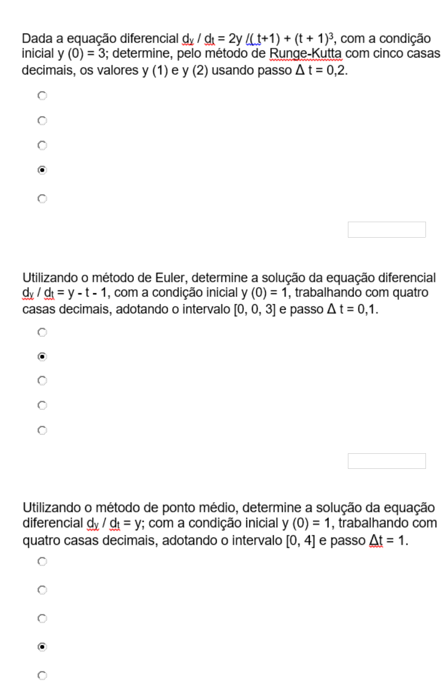 PERGUNTA 1 1. a. y (1) = 4,63654 e y (2) = 6,82025 b. y (1) = 13,10123 e y (2) = 67,16412 c. y (1) = 39,74576 e y (2) = 50,32921 d. y (1) = 17,99838 e y (2) = 62,99581 e. y (1) = 15,95765 e y (2) = 62,67890 0,175 pontos PERGUNTA 2 1. a. 0, 8524 b. 0, 969 c. 0, 3256 d. 0, 9375 e. 0, 6352 0,175 pontos PERGUNTA 3 1. a. 41, 2007 b. 38, 6662 c. 40, 0002 d. 39, 0625 e. 51, 6283 0,175 pontos PERGUNTA 4 1. a. 1,012 b. 2,221 c. 3,003 d. 2,612 e. 2,925