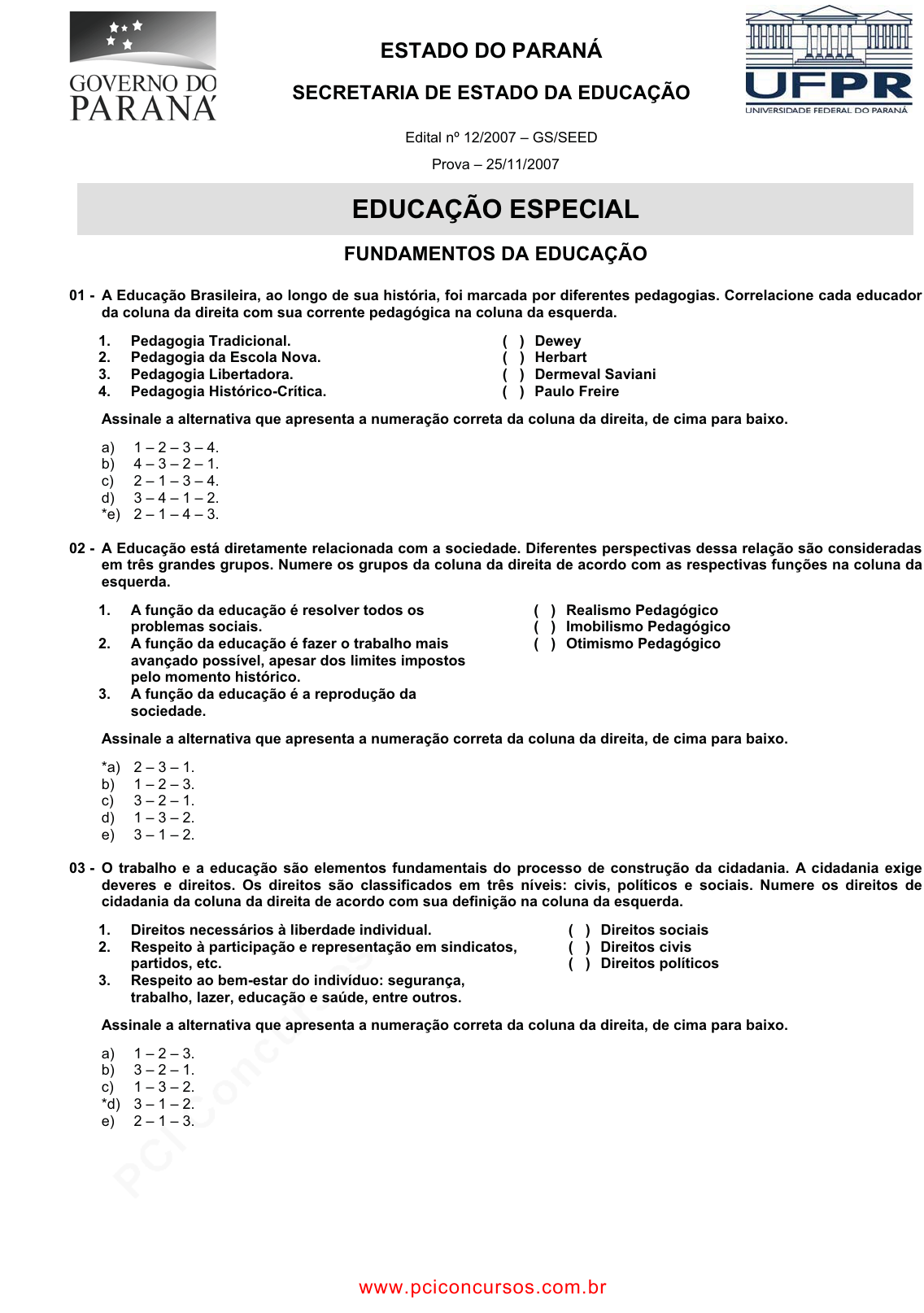pcimarkpci MDAwMDowMDAwOjAwMDA6MDAwMDowMDAwOmZmZmY6YmQ1NTo5YTA3:V2VkLCAxNSBTZXAgMjAyMSAxNDozNzozNCAtMDMwMA== Edital nº 12/2007 – GS/SEED Prova – 25/11/2007 EDUCAÇÃO ESPECIAL FUNDAMENTOS DA EDUCAÇÃO 01 - A Educação Brasileira, ao longo de sua história, foi marcada por diferentes pedagogias. Correlacione cada educador da coluna da direita com sua corrente pedagógica na coluna da esquerda. 1. Pedagogia Tradicional. ( ) Dewey 2. Pedagogia da Escola Nova. ( ) Herbart 3. Pedagogia Libertadora. ( ) Dermeval Saviani 4. Pedagogia Histórico-Crítica. ( ) Paulo Freire Assinale a alternativa que apresenta a numeração correta da coluna da direita, de cima para baixo. a) 1 – 2 – 3 – 4. b) 4 – 3 – 2 – 1. c) 2 – 1 – 3 – 4. d) 3 – 4 – 1 – 2. *e) 2 – 1 – 4 – 3. 02 - A Educação está diretamente relacionada com a sociedade. Diferentes perspectivas dessa relação são consideradas em três grandes grupos. Numere os grupos da coluna da direita de acordo com as respectivas funções na coluna da esquerda. 1. A função da educação é resolver todos os problemas sociais. 2. A função da educação é fazer o trabalho mais avançado possível, apesar dos limites impostos pelo momento histórico. 3. A função da educação é a reprodução da sociedade. ( ) Realismo Pedagógico ( ) Imobilismo Pedagógico ( ) Otimismo Pedagógico Assinale a alternativa que apresenta a numeração correta da coluna da direita, de cima para baixo. *a) 2 – 3 – 1. b) 1 – 2 – 3. c) 3 – 2 – 1. d) 1 – 3 – 2. e) 3 – 1 – 2. 03 - O trabalho e a educação são elementos fundamentais do processo de construção da cidadania. A cidadania exige deveres e direitos. Os direitos são classificados em três níveis: civis, políticos e sociais. Numere os direitos de cidadania da coluna da direita de acordo com sua definição na coluna da esquerda. 1. Direitos necessários à liberdade individual. ( ) Direitos sociais 2. Respeito à participação e representação em sindicatos, partidos, etc. ( ) Direitos civis ( ) Direitos políticos 3. Respeito ao bem-estar do indivíduo: segurança, trabalho, lazer, educação e saúde, entre outros. Assinale a alternativa que apresenta a numeração correta da coluna da direita, de cima para baixo. a) 1 – 2 – 3. b) 3 – 2 – 1. c) 1 – 3 – 2. *d) 3 – 1 – 2. e) 2 – 1 – 3. ESTADO DO PARANÁ SECRETARIA DE ESTADO DA EDUCAÇÃO www.pciconcursos.com.br pcimarkpci MDAwMDowMDAwOjAwMDA6MDAwMDowMDAwOmZmZmY6YmQ1NTo5YTA3:V2VkLCAxNSBTZXAgMjAyMSAxNDozNzozNSAtMDMwMA== 04 - A escola brasileira contemporânea enfrenta um grande desafio, qual seja o de garantir a aprendizagem a todos os seus alunos. Só se consegue atingir esse objetivo, quando a escola assume que as dificuldades de alguns alunos não são apenas deles, mas resultam em grande parte do modo como o ensino é ministrado, como a aprendizagem é concebida e avaliada. A escola precisa se tornar apta para responder às necessidades de cada um dos seus alunos, de acordo com suas especificidades. Nesse sentido, um dos temas mais relevantes a serem considerados na atuação docente é: a) a autonomia da escola. *b) a questão da inclusão e da diversidade. c) a gestão democrática. d) o conselho escolar. e) a direção participativa. 05 - A escola contemporânea tem assumido várias funções sociais, mas não pode deixar de cumprir bem o seu papel fundamental. Que papel é esse? *a) Garantir aos alunos a apropriação dos conhecimentos historicamente acumulados. b) Estabelecer relações humanas satisfatórias. c) Eliminar as diferenças sociais. d) Excluir os incapazes. e) Democratizar a sociedade. 06 - Segundo a Lei 9394/96 (Lei de Diretrizes e Bases da Educação Nacional), a estrutura da educação escolar é composta por: a) I – Ensino fundamental e médio. II – Ensino superior. *b) I – Educação básica, formada pela educação infantil, ensino fundamental e ensino médio. II – Educação superior. c) I – Educação fundamental. II – Ensino médio. III – Educação superior. d) I – Ensino fundamental. II – Ensino médio. III – Ensino superior. IV – Ensino de pós-graduação. e) I – Creches. II – Pré-escola. III – Ensino fundamental. IV – Ensino médio. V – Ensino superior. 07 - Segundo o ECA (Estatuto da Criança e do Adolescente), Lei 8069/90, são considerados crianças e adolescentes os sujeitos dentro das seguintes faixas etárias: a) crianças: até 12 anos de idade completos; adolescentes: entre 13 e 17 anos de idade. b) crianças: até 10 anos de idade incompletos; adolescentes: entre 11 e 18 anos de idade. *c) crianças: até 12 anos de idade incompletos; adolescentes: entre 12 e 18 anos de idade. d) crianças: até 10 anos de idade completos; adolescentes: entre 11 e 17 anos de idade. e) crianças: até 11 anos de idade completos; adolescentes: entre 12 e 16 anos de idade. 08 - Assinale cada afirmativa com V (verdadeira) ou F (falsa). ( ) Paulo Freire, um dos maiores educadores brasileiros, propunha uma concepção pedagógica que articulasse conhecimento e formação política. ( ) A Lei 10639/03 alterou a Lei 9394/96, que estabelece as diretrizes e bases da educação nacional, para incluir no currículo oficial da rede de ensino a obrigatoriedade da disciplina: “Movimento dos Sem-Terra no Brasil”. ( ) A concepção pedagógica denominada Escola Nova foi a expressão educacional do período da ditadura militar no Brasil. ( ) A gestão democrática busca garantir aos diretores escolares a centralização das decisões. Assinale a alternativa que representa a seqüência correta, de cima para baixo. a) F – V – F – V. *b) V – F – F – F. c) V – F – V – F. d) V – V – V – F. e) F – F – F – V. www.pciconcursos.com.br pcimarkpci MDAwMDowMDAwOjAwMDA6MDAwMDowMDAwOmZmZmY6YmQ1NTo5YTA3:V2VkLCAxNSBTZXAgMjAyMSAxNDozNzozNSAtMDMwMA== 09 - Sobre o Projeto Político Pedagógico, considere as seguintes afirmativ