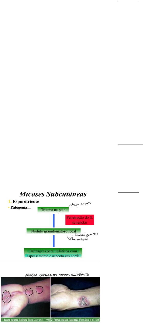 Micoses Subcutâneas São causadas por fungos que crescem no solo e na vegetação sendo introduzido no tecido subcutâneo através de traumas. Esporotricose Agente etiológico: Sporothrix schenckii Fungo dimórfico, que vive em superfície, é encontrado na vegetação Cresce na forma de bolor, produzindo hifas septadas hialinas, ramificadas e conídios Quando introduzido na pele, tipicamente por um espinho, causa uma pústula ou úlcera localizada, com a presença de nódulos ao longo da circulação linfáticas. As lesões podem ser cutâneo-linfática ou extratugmentar ou visceral e são pleomórficas A maioria dos indivíduos apresenta anticorpos específicos a esporotriquina. Os espincemos teciduais revelam leveduras esféricas, apresentam brotamento Quadro clínico Disseminação por via linfática e hematogênica para fígado, baço, sistema nervoso, pulmões… Diagnóstico Amostras: Material de biópsia ou exsudatos de lesões ulcerativas Exame microscópico- Direto com KOH (10-40%): Baixa positividade Corados pelo Giemsa e GRAM Células leveduriformes, ovais, globosas. Sorologia: Aglutinação em partículas de látex, ELISA, FC, IF… Exame histopatologico Abcesso necrótico central granuloma (zona tuberculóide) Tecido granular e fibrosas (Zona Sifilóide) Macrocultivo: Cultura- Período de 4 a 12 dias Microcultivo: Hifas hialinas, septadas Epidemiologia Tem distribuição mundial Frequente em clima tropical e temperado Predominância em sexo masculino Pessoas com atividade associada a terra Tratamento -Iodeto de Potássio v.o. -Itraconazol -Fluconazol, terbinafina e anfotericina b Cromoblastomicose (Cromomicose) É uma infecção granulomatosa de progressão lenta, causada por diversos fungos do solo introduzidos na pele em consequência de traumas. Esses fungos são dematiáceos, fungos que possuem parede mielinizada Os agentes são: Phialophora verrucosa, Fonsecaea pedrosoi, Rhinocladiella aquaspersa, Fonsecaea compacta e Cladosporium carrionii; Quadro clínico As lesões são polimórficas, caracterizando-se por nódulos, lesões papulosas, eritemato- descamativas, verrugosas ou sem ulceração As lesões se localizam principalmente nos membros inferiores. Diagnóstico Amostras: Raspados ou biópsia das lesões. Exame microscópico- Direto com KOH (10-40%) Cultura em meio de Sabouraud por 7-15 dias Fonsecaea pedrosoi: Colônias de maturação lenta(14 dias), veludosa, marrom-escuro, verde- oliva ou negro, plano ou rugoso Cladosporium carrionii: Colônias de maturação muito lenta (21 dias), veludosa, marrom ou verde- oliva escuro, recobertas por micélio algodonoso e cinza. Rhinocladiella aquaspersa: Colônias de maturação rápida (7 dias), veludosa, verde escuro ou preto. Epidemiologia Tem distribuição mundial Pacientes do sexo masculino são os mais acometidos Ocorre principalmente em indivíduos com atividades associadas ao campo Micetoma Penetram nos pés, nas mãos ou no dorso através de ferimentos e causam abscessos, com secreção purulenta através dos sinus. Causadas por acitnomicetos: actinomicetoma Causada por fungos: eumicetoma agregado de hifas Aumento de volume com microabcessos purulento- granuloso Agente etiológico Actinomicetos: Actinomyces Nocardia Streptomyces Actinomadura Tratado com antibióticos, já que são bactérias. Fungos Madurella Allescheria Cephalosporium Acremonium Tratado com antifúngicos, já que são fungos Grãos brancos > fungos hialinos Grãos negros > fungos dematiáceos Diagnóstico Material coletado das fístulas Centrifugação em salina Exame direto: observação de grãos eumicóticos: hifas septadas com clamidoconídios actinomicóticos: hfas finas, não septados KOH 10-20% e corante Cultivo: Sabouraud histopatológico: não permite identificação Tratamento Eumicetoma- Cetoconazol diário (400-800mg) Itraconazol (400mg/dia) Epidemiologia Típico de regiões tropicais e subtropicais Cinturão do micetoma: latitudes Estações secas, quentes e úmidas Homens mais afetados Não transmissível Paracoccidioidomicose Paracoccidioides brasiliensis causa paracoccidioidomicose, também referida como blastomicose da América do Sul. Fungo dimórfico, que se apresenta como bolor no solo e como levedura nos tecidos. Os esporos são inalados e ocorrem lesões iniciais nos pulmões. A infecção assintomática é comum. Alternativamente, podem ocorrer lesões na membrana mucosa oral, linfadenopatia, e algumas vezes, disseminação a vários órgãos Nos tecidos ou secreções observam-se células esféricas ou ovais de tamanhos variáveis com paredes grossas, dupla membrana, múltiplos brotos ligados por bases estreitas à célula- mãe Diagnóstico Exame microscópico direto do espécime clínico (Pus, escarro) Células leveduriformes com 10 a 60, birrefringentes, 3 ou mais brotamentos que se ligam a célula- mãe por base estreita Criptococose Cryptococcus neoformans causa criptococose, especialmente meningite criptocóccica. A criptococose é a doença fúngica de risco à vida mais comum em pacientes com AIDS. Variação neoformans (Sorotipo A, D, AD) Variação Gattii (Sorotipo B,C) Meninges Micose oportunista Essa levedura é amplamente distribuída na natureza e cresce abundantemente em solo contendo dejetos de aves (especialmente pombos). As aves não são infectadas. A infecção humana resulta da inalação do organismo. Não ocorre transmissão entre humanos. Diagnóstico No liquor misturado à tinta nanquim, a célula de levedura é visualizada microscopicamente envolta por uma cápsula larga e não corada. O aparecimento do organismo na coloração de Gram não é confiável.. O organismo pode ser cultivado a partir do liquor e outros espécimes. As colônias são intensamente mucoides, reflexo da grande quantidade de polissacarídeos capsulares produzidos pelo organismo Histoplasmose Histoplasma Capsulatum causa histoplasmose É um fungo dimórfico presente no solo na forma de bolor e nos tecidos com levedura. A tran