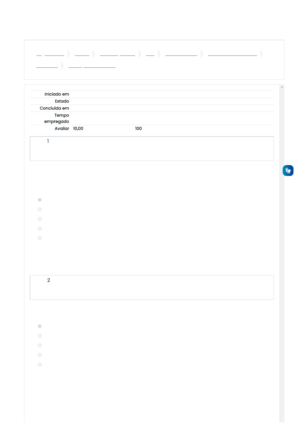 07/03/2022 14:22 Avaliação - Unidade III: Revisão da tentativa https://ambienteonline.uninga.br/mod/quiz/review.php?attempt=560270&cmid=111285 1/6 Página inicial Cursos GRADUAÇÃO EAD 2021 Módulo 2 - 2021 2021/2 - Saúde Coletiva UNIDADE III Avaliação - Unidade III Iniciado em quinta, 22 jul 2021, 16:52 Estado Finalizada Concluída em quinta, 22 jul 2021, 16:59 Tempo empregado 7 minutos 27 segundos Avaliar 10,00 de um máximo de 10,00(100%) Questão 1 Completo Atingiu 1,00 de 1,00 Questão 2 Completo Atingiu 1,00 de 1,00 A Atenção Básica descreve alguns fundamentos e diretrizes, quais são eles. Assinale a alternativa correta.I)Principal porta de entrada no SUS II) Centro de comunicação da rede de atenção à saúde III)Contato preferencial dos usuários a. I, II e III b. II c. I, III d. I, II e. II, III A resposta correta é: I, II e III De acordo com as funções dos ACS, este deverá realizar o que? Assinale a alternativa correta. a. Todas as alternativas estão corretas. b. realizar atividades educacionais, c. realizar o cadastramento e diagnóstico, mapeamento entre outros. d. deverá realizar visitas domiciliares pelo menos uma vez por mês em cada família, e. identificar as situações de risco, programas relacionados a amamentação, puericultura, A resposta correta é: Todas as alternativas estão corretas. https://ambienteonline.uninga.br/ https://ambienteonline.uninga.br/course/index.php https://ambienteonline.uninga.br/course/index.php?categoryid=1 https://ambienteonline.uninga.br/course/index.php?categoryid=6 https://ambienteonline.uninga.br/course/index.php?categoryid=8 https://ambienteonline.uninga.br/course/view.php?id=7136 https://ambienteonline.uninga.br/course/view.php?id=7136§ion=6 https://ambienteonline.uninga.br/mod/quiz/view.php?id=111285 07/03/2022 14:22 Avaliação - Unidade III: Revisão da tentativa https://ambienteonline.uninga.br/mod/quiz/review.php?attempt=560270&cmid=111285 2/6 Questão 3 Completo Atingiu 1,00 de 1,00 Questão 4 Completo Atingiu 1,00 de 1,00 De acordo com ATENÇÃO BÁSICA - ATENDIMENTO PRIMÁRIO, o que preconiza o atendimento? Assinale a alternativa correta. a. ofertar para os usuários alguns serviços como por exemplo: Consultas, exames, vacinas b. possui uma equipe multidisciplinar e com níveis de atendimento c. todas as alternativas estão corretas d. ofertar para todos, uma assistência preconizada na prevenção e. capaz de filtrar e direcionar o atendimento para outras instâncias A resposta correta é: todas as alternativas estão corretas Dentro da atenção básica à saúde, existe inúmeros programas, entre eles: o PACS, ACS, ESF. De acordo com os programas, principalmente no que diz respeito ao ACS é correto afirmar que: a. o contato com a equipe, os vínculos são diretos e proporciona para todos um melhor atendimento. b. Tem um papel muito importante e único no que diz respeito ao ACOLHIMENTO c. O Programa de Agentes Comunitários de saúde (PACS), deu-se início em 1991, onde sua implantação buscou alternativas para melhorar as condições de saúde local de suas comunidades. d. O ACS é uma profissão que tramita todos os espaços- governo e comunidade. e. Todas as alternativas estão corretas. A resposta correta é: Todas as alternativas estão corretas. 07/03/2022 14:22 Avaliação - Unidade III: Revisão da tentativa https://ambienteonline.uninga.br/mod/quiz/review.php?attempt=560270&cmid=111285 3/6 Questão 5 Completo Atingiu 1,00 de 1,00 Questão 6 Completo Atingiu 1,00 de 1,00 O artigo 4º da Lei Federal 8.080/90, o Sistema Único de Saúde, descreve o que? De acordo com as alternativas, assinale a correta. a. Todas as alternativas estão corretas. b. 1996- NOB 01/96, define novo modelo de financiamento para a atenção básica à saúde c. o SUS passa a ser promovido a prevenção dos agravos. d. Fatores determinantes e condicionantes ao meio físico como por exemplo, (condições geográficas, água, alimentação, habitação e. é o conjunto de ações e serviços de saúde prestados por órgãos e instituições Públicas Federais, Estaduais e Municipais, da Administração Direta e Indireta e das Fundações mantidas pelo Poder Público." A resposta correta é: é o conjunto de ações e serviços de saúde prestados por órgãos e instituições Públicas Federais, Estaduais e Municipais, da Administração Direta e Indireta e das Fundações mantidas pelo Poder Público." O PSF (Programa Saúde da Família) foi inspirado em experiências de prevenção de doenças por meio de informações e orientações à saúde. As ações são descritas, fundamentadas e realizadas pelos agentes comunitários de saúde, no entanto, pelas portarias ministeriais, o ACS deverá ser contemplado por um mínimo de pessoas; as ações determinantes para cada localidade deverão ser levantadas e descritas de acordo com a necessidade local, por meio de um levantamento dos dados da comunidade e suas particularidades. É correto afirmar que esse número descrito pode ser: a. 500 a 1200 pessoas b. de 400 a 750 pessoas c. 1800 a 2300 pessoas d. todas as alternativas estão corretas e. de 1000 a 1500 pessoas A resposta correta é: de 400 a 750 pessoas 07/03/2022 14:22 Avaliação - Unidade III: Revisão da tentativa https://ambienteonline.uninga.br/mod/quiz/review.php?attempt=560270&cmid=111285 4/6 Questão 7 Completo Atingiu 1,00 de 1,00 Questão 8 Completo Atingiu 1,00 de 1,00 O SUS foi criado pela lei orgânica 8080/90, com qual finalidade. De acordo com as alternativas, assinale a correta. a. devendo atender a todos, de forma racional b. sendo o mesmo eficaz c. descentralizado e democrático. d. a finalidade de alterar a situação de desigualdade e. todas as alternativas estão corretas. A resposta correta é: todas as alternativas estão corretas. O SUS não é um serviço ou uma instituição, mas sim um sistema de saúde, os seus objetivos estão pautados nos modelos de atenção à saúde. De acordo com es