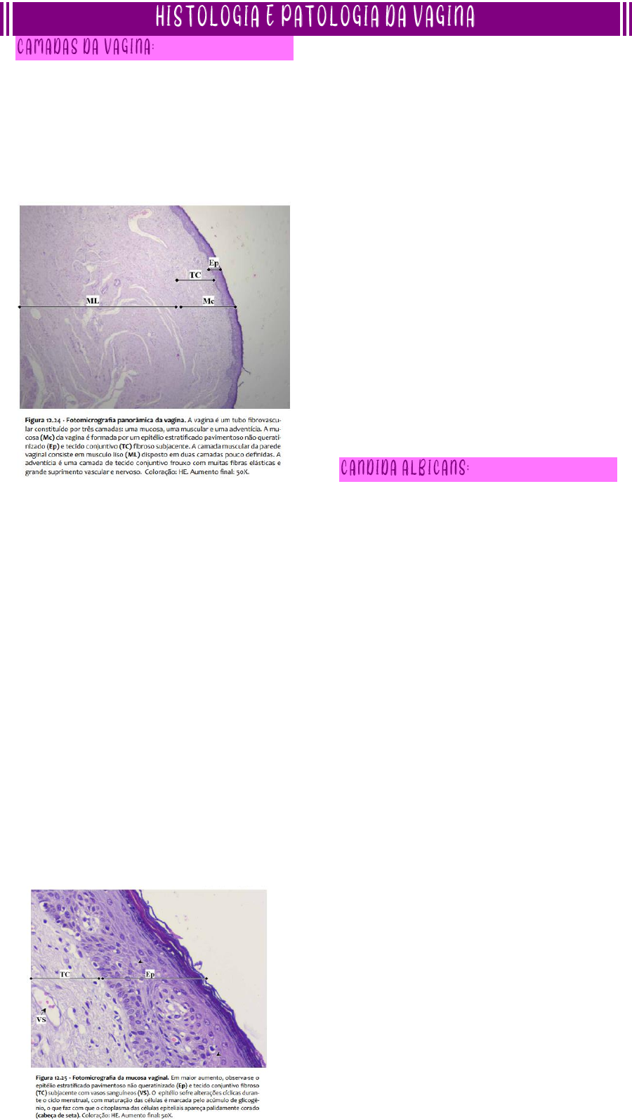 A vagina é o tubo fibromuscular distensível do trato reprodutor feminino que conecta a cérvice uterina ao exterior do corpo, composta por três camadas concêntricas a mucosa, muscular e adventícia. → Mucosa: possui um proeminente epitélio estratificado pavimentoso não- queratinizado que repousa sobre uma lâmina própria subepitelial, constituída por tecido conjuntivo frouxo rico em fibras elásticas e vasos sanguíneos. O muco para a lubrificação e proteção da mucosa vaginal é derivado das glândulas tubulares mucosas localizadas na endocérvice, uma vez que a túnica mucosa não possui glândulas. Apresenta células basais, intermediárias e superficiais em seu epitélio. Conforme essas células amadurecem, produzem glicogênio (serve de substrato para os lactobacilos produzirem ácido láctico e manterem o pH ácido da vagina), morrem e descamam. → Muscular: é formada por duas camadas mal definidas de tecido muscular liso. → Adventícia: separa a vagina dos órgãos vizinhos. É composta por tecido conjuntivo frouxo com abundantes fibras elásticas espessas, vasos sanguíneos, nervos e agregados ganglionares. A diferenciação do epitélio vaginal é estimulada por estrógenos, sofrendo modificações cíclicas durante o ciclo menstrual. No período da ovulação, o epitélio estratificado encontra-se completamente diferenciado e abundantes células pavimentosas acidófilas podem ser vistas no exame de Papanicolau. A maioria das infecções por Candida origina-se quando a flora comensal normal rompe a pele ou as barreiras mucosas. Residindo normalmente na pele, boca, trato gastrointestinal e vagina, as espécies de Candida usualmente vivem como comensais benignos e raramente produzem doença em indivíduos saudáveis. Em cortes teciduais, a C. albicans pode aparecer como leveduras, pseudo-hifas, e, menos comumente, hifas verdadeiras, definidas pela presença de septos. Mais comumente, a candidíase toma a forma de uma infecção superficial nas superfícies mucosas da cavidade oral (sapinho). A proliferação florida do fungo cria pseudomembranas branco- acinzentadas com aspecto sujo, compostas de organismos emaranhados e restos inflamatórios. Profundamente à superfície há hiperemia da mucosa e inflamação. Essa forma de candidíase é vista em neonatos, pessoas debilitadas, crianças recebendo esteroides por via oral para tratamento de asma, e após um tratamento com antibióticos de amplo espectro, os quais destroem a flora bacteriana normal competidora. O outro grande grupo de risco inclui os pacientes HIV-positivos; pessoas com sapinho oral sem razão óbvia devem ser avaliadas para infecção pelo HIV. A vaginite por Candida é comum, especialmente em mulheres diabéticas, gestantes, ou que utilizam contraceptivos orais. Ela normalmente está associada a intenso prurido e a um corrimento espesso tipo coalhada. Além disso, a mulher apresentará mucosa hiperêmica. Neisseria são diplococos Gram- negativos que são achatados nos lados contíguos, dando ao par o formato de um grão de café. Essas bactérias aeróbicas possuem necessidades nutricionais rigorosas e crescem melhor em meios enriquecidos, como o ágar sangue de ovelha lisado. A N. gonorrhoeae é uma causa importante de doença sexualmente transmissível (DST). A infecção no homem causa uretrite. Em mulheres, a infecção por N. gonorrhoeae é frequentemente assintomática e, portanto, pode ocorrer sem ser notada. A gonorreia não tratada pode levar à doença inflamatória pélvica, que pode causar infertilidade ou gestação ectópica. Embora a infecção por N. gonorrhoeae usualmente manifeste-se localmente nas mucosas genital ou cervical, da faringe ou anorretal, infecções disseminadas podem ocorrer. Infecções disseminadas de adultos e adolescentes usualmente causam artrite séptica acompanhada de exantema com pápulas e pústulas hemorrágicas. A infecção neonatal por N. gonorrhoeae causa conjuntivite e pode levar à cegueira e, raramente, à sepse. A infecção ocular, que pode ser prevenida através da instilação de nitrato de prata ou antibióticos nos olhos do recém-nascido, permanece uma causa importante de cegueira em algumas nações em desenvolvimento. • Livro - Robbins – Patologia: bases patológicas das doenças. • Bizotto Thais Santana Gastardelo, et al. HISTOLOGIA: Texto e Atlas. 1st ed. São José do Rio Preto, SP: THS Editora; 2021. 12, Sistema Reprodutor Feminino: Vagina; p. 407 – 410.