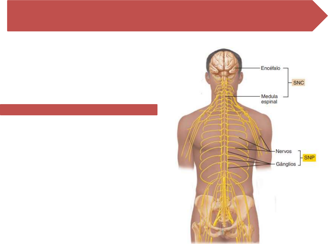 O sistema nervoso é o principal sistema de controle e comunicação do corpo. Cada pensamento, ação, instinto e emoção refletem a sua atividade. Suas células comunicam-se por meio de sinais elétricos, que são rápidos e específicos e, normalmente, produzem respostas quase imediatas. Funções do sistema nervoso 1. Utiliza seus milhões de receptores sensitivos para monitorar as mudanças que ocorrem dentro e fora do corpo. Cada uma dessas mudanças chama-se estímulo e a informação reunida chama-se entrada (aferência) sensitiva. 2. Processa e interpreta a entrada sensitiva e toma decisões a respeito do que fazer em cada momento: um processo chamado integração. 3. Indica uma resposta ativando os órgãos efetores, nossos músculos ou glândulas; a resposta chama-se saída (eferência) motora. Divisões básicas do sistema nervoso O ser humano possui um sistema nervoso altamente integrado. No entanto, por uma questão de conveniência, podemos considerar que ele tenha duas partes anatômicas: o sistema nervoso central e o sistema nervoso periférico. O sistema nervoso central, ou parte central do sistema nervoso, (SNC) é formado pelo encéfalo e pela medula espinal, que ocupam o crânio e o canal vertebral, respectivamente. O SNC é o centro de integração e comando do sistema nervoso, pois recebe sinais sensitivos, interpreta-os e determina as respostas motoras com base em experiências pregressas, reflexos e condições atuais. O sistema nervoso periférico ou parte periférica do sistema nervoso, (SNP), a parte do sistema nervoso fora do SNC, consiste principalmente nos nervos que se estendem do cérebro e da medula espinal. Os nervos cranianos levam e trazem sinais para o encéfalo, enquanto os nervos espinais transmitem sinais de/para a medula espinal. Os nervos periféricos servem como linhas de comunicação que ligam todas as regiões do corpo ao sistema nervoso central. No SNP também estão incluídos os gânglios, que são áreas onde os corpos celulares dos neurônios ficam agrupados. Conforme foi mencionado, o sistema nervoso recebe entradas (informações) sensitivas e determina saídas (respostas) motoras. Os sinais sensitivos, ou aferentes, são capturados pelos receptores sensitivos localizados no corpo inteiro e transmitidos pelas fibras nervosas do SNP para o SNC (aferente significa “levar em direção a”). Os sinais motores, ou eferentes, são levados do SNC pelas fibras nervosas do SNP, inervando os músculos e as glândulas e fazendo que esses órgãos se contraiam ou secretem (eferente significa “levar embora”). Tanto as entradas (aferências) sensitivas quanto as saídas (eferências) motoras são subdivididas de acordo com as regiões do corpo que atendem: a região somática do corpo consiste nas estruturas externas à cavidade ventral do corpo — em outras palavras, as estruturas do tubo externo (pele, musculatura esquelética e ossos). A região visceral do corpo consiste basicamente nas vísceras dentro da cavidade ventral do corpo — ou seja, as estruturas do tubo interno do corpo (tubo digestório, pulmões, coração, bexiga etc.). Esse esquema resulta em quatro subdivisões principais do SNP: (1) sensitiva somática (a inervação sensorial do tubo externo: pele, parede corporal e membros); (2) Sistema nervoso Organização funcional do sistema nervoso sensitiva visceral (a inervação sensorial das vísceras); (3) motora somática, ou motora voluntária (a inervação motora do tubo externo, especificamente dos músculos esqueléticos); e (4) motora visceral, também chamada sistema nervoso autônomo (SNA)1 (a inervação motora involuntária do tubo interno, especificamente do músculo liso, músculo cardíaco e glândulas, bem como de algumas estruturas do tubo externo: o músculo eretor do pelo e o músculo liso nos vasos e glândulas sudoríferas). Tipos de fibras sensoriais e motoras do sistema nervoso periférico Sensitiva somática (SS) Os sentidos somáticos gerais são aqueles cujos receptores estão amplamente espalhados por todo o tubo externo do corpo. Entre eles, temos os muitos sentidos (sensações) experimentados na pele e na parede corporal, como o tato, a dor, a pressão, a vibração e a temperatura. A textura áspera da lixa, o calor de uma caneca de chocolate quente e a dor de uma contusão ou de um músculo distendido são exemplos de sensação somática geral. Outro tipo de sensação somática geral é a propriocepção (“sentir o próprio corpo”), um sentido que detecta a quantidade de alongamento nos músculos, tendões e cápsulas articulares. A propriocepção informa a você a posição e o movimento do seu próprio corpo no espaço, fornecendo-lhe um “sentido corporal”. Os sentidos somáticos especiais são aqueles cujos receptores estão confinados em áreas relativamente pequenas em vez de estarem espalhados pelo corpo inteiro. A maioria dos sentidos especiais está confinada na cabeça, incluindo a audição e o equilíbrio (com os receptores nas orelhas internas) e a visão (com os receptores nos olhos). Sensitiva visceral (SV) Os sentidos viscerais gerais incluem o alongamento, a dor e a temperatura, que podem ser amplamente sentidos nos tratos digestório e urinário, nos órgãos reprodutores e em outras vísceras. As sensações como a fome e a náusea também são sensações viscerais gerais. O paladar e o olfato são considerados sentidos viscerais especiais. Esses sentidos (também conhecidos como sentidos químicos) têm seus receptores sensitivos localizados na língua e na cavidade nasal, respectivamente. Motor somático (MS) A parte motora somática do SNP estimula a contração dos músculos esqueléticos. Como temos o controle voluntário sobre a contração desses músculos, o sistema motor somático costuma ser chamado de sistema nervoso voluntário. Motor visceral (MV) A parte motora visceral do SNP regula a contração do músculo liso e do músculo cardíaco, além da 