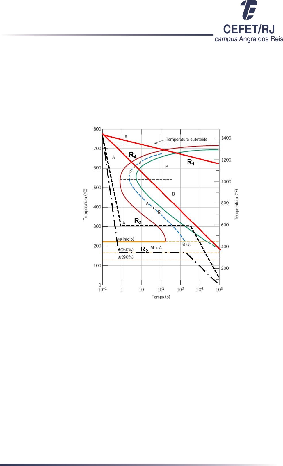 Rua do Areal, 522, Pq. Perequê (Mambucaba) - Angra dos Reis/RJ – 23953-030 Tel.: (24) 3362-3526 / 3362-3533 / 3362-3611 Atividade 3 _ Diagramas de Fase, Fases e Microconstituintes, Tratamentos Térmicos. Engenharia Mecânica Questão 1 (2,0 pontos) – Após se realizar tratamentos térmicos em um aço eutetóide (com resfriamento até a temperatura ambiente), com os ciclos indicados na curva TTT apresentada na Figura 1 (R1, R2, R3 e R4) quais são as microestruturas geradas e suas respectivas porcentagens volumétricas? Figura 1 - Diagrama de transformação isotérmica (curva TTT) completo para um aço eutetóide: A, austenita; B, bainita; M, martensita; P, perlita. RESPOSTA: R1: 100% Perlita Grosseira R2: 90% Martensita 10% Austenita R3: 100% Bainita R4: 100% Perlita Fina Questão 2 (2,0 pontos) – A Figura 2 apresenta o diagrama de fases Fe-Fe3C, sendo assim, responda: Rua do Areal, 522, Pq. Perequê (Mambucaba) - Angra dos Reis/RJ – 23953-030 Tel.: (24) 3362-3526 / 3362-3533 / 3362-3611 Figura 2 - Diagrama de fases Fe-Fe3C (a) Qual a máxima solubilidade de carbono nas fases ferrita e austenita? RESPOSTA: Ferrita α: 0,022% C Ferrita δ: 0,09%C Austenita: 2,14% C (b) Quais as temperaturas, teores de carbono e reações de transformações ocorrendo para os pontos eutético, peritético, eutetóide, peritetóide e monotético? RESPOSTA: Eutético: 1147°C; 4,30%C; L -> Austenita + Cementita Peritético: 1493°C; ~0,2%C; S+L (ferrita δ + líquido) -> Austenita Eutetóide: 727°C; 0,76%C; S(Austenita) -> Ferrita + Cementita Peritetóide: Não existe neste diagrama Monotético: Não existe neste diagrama Rua do Areal, 522, Pq. Perequê (Mambucaba) - Angra dos Reis/RJ – 23953-030 Tel.: (24) 3362-3526 / 3362-3533 / 3362-3611 (c) Além das fases e microconstituintes indicados no diagrama da Figura 2, por qual motivo não se aparece a fase martensita e o microconstituinte bainita? RESPOSTA: A fase martensita, por ser obtida para condições de resfriamento fora de equilíbrio, um resfriamento rápido (têmpera), o que não é prevista no diagrama de equilíbrio. E a microconstituinte bainita pode ser obtido tanto por tratamento térmico com resfriamento contínuo, como por tratamento térmico isotérmico o que também não é previsto no diagrama de equilíbrio. Questão 3 (1,0 ponto) – Por qual(is) motivo(s) a atmosfera do interior do forno deve ser levada em consideração durante um tratamento térmico? RESPOSTA: Quando não se tem uma atmosfera adequada pode acontecer de ter uma pequena variação dimensional (“empenar”) e/ou uma oxidação/corrosão superficial, que não é um resultado que se espera, então a atmosfera do forno deve ser considerada para não haver essas variações. Questão 4 (1,0 ponto) – Um engenheiro mecânico precisa fazer um tratamento térmico em um determinado aço, para que este atinja as propriedades necessárias para sua utilização. Quais são os fatores a serem levados em consideração neste tratamento térmico, para que se obtenha o melhor resultado? Explique cada um deles. RESPOSTA: Qual o metal ou liga a ser tratada; A geometria da peça; Objetivo a ser alcançado, quais propriedades são desejadas no final; Planejamento de uma etapa adicional de usinagem em alguns casos: Pode ser que dependendo da liga, temperatura e tempo, chegar de ter uma camada de até 2mm de oxidação. Ou para evitar essa adversidade usar uma atmosfera controlada (elevando o valor da execução). Questão 5 (2,0 pontos) – A curva TTT de uma determinada liga é uma ferramenta fundamental para a previsão de fases / microconstituintes formados em metais e suas ligas. Para um determinado metal, quais são os fatores que influenciam na modificação da forma / deslocamento (para direita ou para esquerda) da curva TTT? RESPOSTA: Os elementos de liga, precisam ser recolocados quando a austenita se decompõe, todos os elementos de liga deslocam a curva TTT para direita, com exceção somente do cobalto que a desloca para a esquerda. Os tamanhos de grão, quanto menor o tamanha mais regiões estão propicias as transformações, logo a curva se desloca para a esquerda. E a homogeneidade da austenita, quanto mais homogênea mais para a direita a curva se desloca, quanto menor a quantidade de imperfeições mais para a direita a curva se move. Questão 6 (2,0 pontos) – Um engenheiro mecânico tem em estoque uma barra redonda com 3 polegadas e com 30 cm de comprimento de aço com 0,78 % em peso de carbono, sem elementos de liga. Sabendo-se que ele irá usinar esta barra para fazer uma punção de 1,5 polegadas de diâmetro com ponta reta, indique qual o tratamento térmico mais adequado a ser realizado para as seguintes situações, e quais são as fases / microconstituintes gerados. Rua do Areal, 522, Pq. Perequê (Mambucaba) - Angra dos Reis/RJ – 23953-030 Tel.: (24) 3362-3526 / 3362-3533 / 3362-3611 (a) Ductilidade máxima para se usinar esta peça, sem desgastar muito a ferramenta de usinagem; RESPOSTA: Esferoidização Gerado: ferrita e a carbonetos esferoizados ou ferrita e perlita. (b) Após a usinagem da punção, para eliminar tensões residuais vindas da usinagem; RESPOSTA: Recozimento Gerado: Perlita grosseira (c) Para a obtenção da máxima resistência / dureza superficial da punção. RESPOSTA: Têmpera Gerado: Martensita