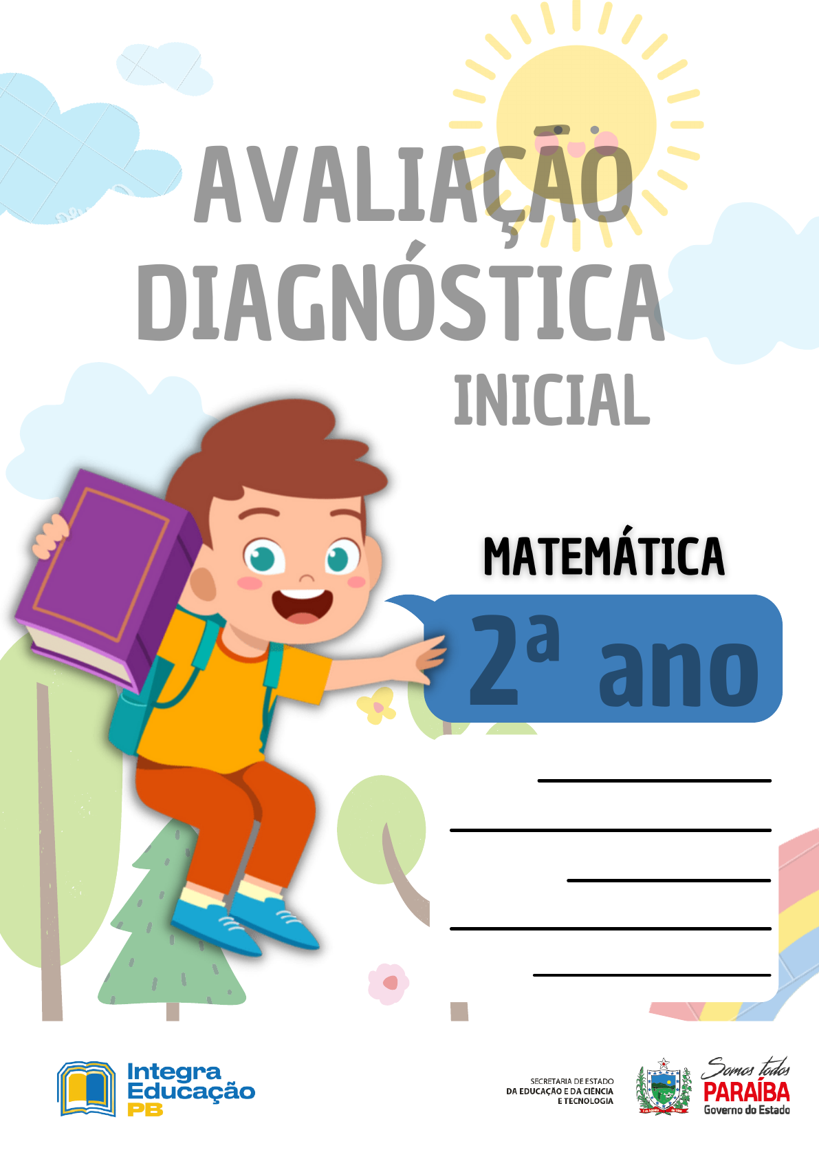 AVALIAÇÃOAVALIAÇÃO DIAGNÓSTICADIAGNÓSTICA INICIALINICIAL 2ª ano2ª ano ESCOLA:ESCOLA: ESTUDANTE:ESTUDANTE: TURMA:TURMA: Questão 1 - (EF01MA04) Veja quantos peixinhos coloridos há no quadro a seguir: Qual o total de peixes dentro desse quadro? A) 12 C) 24 B) 20 D) 30 Questão 2 - (EF01MA04) Mariana teve uma ótima pontuação no jogo de dados. Os pontinhos a seguir representam a pontuação total dela no final do jogo. Conte os pontinhos de todas as faces e indique o total de pontos de Mariana nessa brincadeira. A) 12 C) 24 B) 33 D) 30 Questão 3 - (EF01MA08) Thiago possui 16 carrinhos em sua coleção, como ilustrado a seguir: Sabendo que ele deu 5 desses carrinhos para seu primo Rafael no Natal, com quantos carrinhos ele ficou agora em sua coleção? A) 14 C) 11 B) 16 D) 22 Questão 4 - (EF01MA08) Veja a quantidade de bolinhas de gude que Isaque e Nelsinho possuem. Eles resolveram juntar as bolinhas de gude. Com quantas bolinhas de gude os dois juntos ficaram no total? A) 20 C) 30 B) 24 D) 25 Questão 5 - (EF01MA10) Na reta abaixo qual número está faltando? A) 27 C) 29 B) 28 D) 30 Questão 6 - (EF01MA10) Observe a sequência de figuras a seguir e indique qual a próxima figura da sequência: A) B) C) D) Questão 7 - (EF01MA12) Qual objeto se encontra à direita de Naruto? A) C) B) D) Questão 8 - (EF01MA12) Na imagem abaixo, veja as pegadas saindo da casa de Maria: Avalie o percurso que Maria fez ao sair de casa. Ela passou em frente à SORVETERIA e ao HOSPITAL e depois: A) virou à esquerda C) seguiu em frente B) virou à direita D) voltou para casa Questão 9 - (EF01MA14) Observe o quadro as seguir contendo desenhos de três figuras planas: Essas figuras que estão no interior do quadro recebem o nome de : A) Quadrados C) Triângulos B) Círculos D) Retângulos Questão 10 - (EF01MA14) Observe a lata a seguir: Se contornarmos o fundo dessa lata, qual figura iremos obter? A) Um quadrado C) Um triângulo B) Um retângulo D) Um círculo