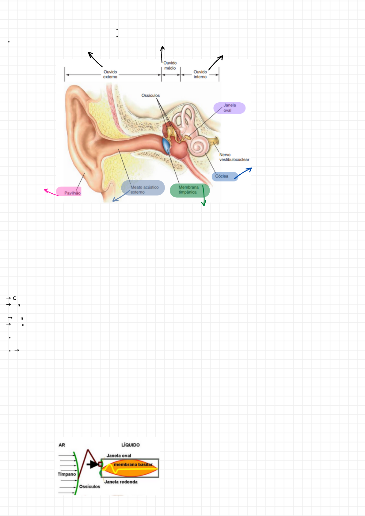 ✦ cartilagem coberta por pele ✦formado tipo ' funil' ✦ permite capturar o som oriundo de uma extensa área sistema auditivo e vestibular Isabella Nepomuceno - M7 estrutura DO OUVIDO ✦ é a entrada para o ouvido interno ✦ se estende-se cerca de 2, 5 cm para o lado interno do crânio até terminar na membrana timpânica ✦ conhecida com tímpano ✦na sua superfície medial esta conectada uma serie de ossos, que são chamados de ossículos ✦ estão localizados em uma pequena câmera preenchidos de ar ✦ esses ossículos vão fazer movimentos da membrana timpânica para uma 2º membrana que cobre um orifício no crânio que se chama janela oval ✦ atrás dessa janela, está a cóclea preenchida por fluido, a qual transforma o movimento físico da membrana da janela oval em uma resposta neural pavilhão ate a memb. timpânica memb. timpânica e os ossículos √ martelo √ Bigorna √ Estribo√ Mastoide √ tuba auditiva vai da região da estrutura medial até a janela oval Janela oval: abaixo do estribo ( separa a escala vestibular da orelha media) janela redonda : separa a escala timpânica da orelha média escala (rampa) vestibular escala media escala timpânica Membrana de Reissner : separa a escala vestibular da escala média Membrana Basilar: separa a escala timpânica da escala média escala media: preenchida por endolinfa escala vestibular e tmpânica pela perilinfa ✦ parte da orelha interna ✦constituída dentro do labirinto membranoso, que por sua vez encontra dentro do labirinto ósseo, na porção petrosa do osso temporal ✦ tem uma forma de espiral, que lembra uma concha de caracol ✦a sua parte oca é formada por ossos que se enrolam em torno de um pilar central da coclea é uma estrutura cônica chamada de MODÍOLO ✦ Na base da cóclea, há 2 orifícios cobertos por membrana: 1. 2. ✦ quando cortamos a cóclea de uma forma transversal, vemos que o tubo está dividido em 3 câmeras preenchidas por fluido: 1. 2. 3. que vão se enrolar ao redor da porção interna da cóclea, como uma escada em espiral ✦ Há 2 membranas que separa essas escalas: 1. 2. ✦apoiando na membrana basilar, encontramos o ÓRGÃO DE CORTI, formando por neurônios receptores auditivos com uma membrana tectorial suspensa sobre ele ✦No ápice da cóclea, a escada média está fechada, e a escala timpânica tem continuidade com a escala vestibular através de um orifício nas membranas chamado de HELICOTREMA ✦as escalas, ou rampas, são preenchidas por liquidos, sendo que a : 1. 2. Essa diferença na concentração iônica e gerada por processos de transporte ativo que ocorrem na estria vascular , o endotélio que recobre a parede da escala media . → A estria vascular reabsorve sódio e secreta potássio contra seus gradientes de concentração. Por conta da diferença de concentração iônica e à permeabilidade da membrana de Reissner, a endolinfa tem um potencial elétrico, que é 80 mV mais positivo que o da perilinfa, chamado de potencialendococlear A perilinfa tem uma constituição iônica semelhando à do fluido cefalorraquidiano: → Concentrações baixas de K+ (7 mM) →Concentrações altas de Na+ (140 mM) Já a endolinfa é caracterizada como um fluido extracelular incomum por apresentar: → Concentrações altas de K+ (150 mM) → Concentrações baixas de Na+ (1 mM) continuação da coclea: Fisiologia da Cóclea O movimento dos ossículos atua com o pistão fazendo um movimento para dentro na janela oval que empurra a perilinfa na escala vestibular. Devido ao aumento da pressão do fluido na janela oval, a janela redonda se projeta para fora como resposta ao movimento da janela oval para o interior da cóclea, uma vez que a pressão do fluido não tem outro lugar para escapar, sendo necessário a manutenção do equilíbrio. Então a onda sonora entra pela janela oval percorrendo a escada vestibular passando para a escada timpânica e terminando na janela redonda ⁘ a orelha externa da media : membrana timpânica ⁘ orelha media da interna : labirinto membranoso Isabella Nepomuceno - M7 os primeiros estágios da via auditiva: Depois que é gerada uma resposta neural ao som, o sinal é transferido para uma série de núcleos no tronco encefálico, que depois são enviados a um núcleo de retransmissão no tálamo (o NÚCLEO GENICULADO MEDIAL), para só assim, ser projetado no córtex auditivo primário, ou AI, localizado no lobo temporal. É importante ressaltar que a combinação da maior força na janela oval devido ao sistema de alavancas dos ossículos mais a menor área da janela oval tornam a pressão na janela oval 20 vezes maior do que a pressão na membrana timpânica, sendo esse aumento suficiente para m over o fluido no ouvido interno Reflexo de Atenuação Os dois músculos ligado aos ossículos desempenham um papel significativo sobre a transmissão do som, principalmente protetor. Há dois músculos que se ligam aos ossículos: O músculo tensor do tímpano e o músculo estapédio. O músculo tensor do tímpano se encontra ligado de um lado a parte do osso da cavidade do ouvido médio e do outro ao martelo, já o músculo estapédio vai estar ligado da fixação no osso até o estribo. A importância desses músculos está no fato de que quando se tem a exposição a uma onda sonora barulhenta, ocorre a contração deles e, consequentemente, uma diminuição da flexibilidade da cadeia dos ossículos que se torna rígida, fazendo com que seja diminuída a condução do som a o ouvido interno. Esse processo é chama do de REFLEXO DA ATENUAÇÃO O reflexo da atenuação é visto como uma forma de adaptar o ouvido ao som contínuo de alta intensidade para que seja identificados outros sons, não saturando a respostas dos receptores do ouvido somente com esse som de alta intensidade, aumentando, assim, a faixa dinâmica em que podemos escutar. Além disso, é um importante mecanismo de proteção contra sons barulhentos que poderiam causar algum pro
