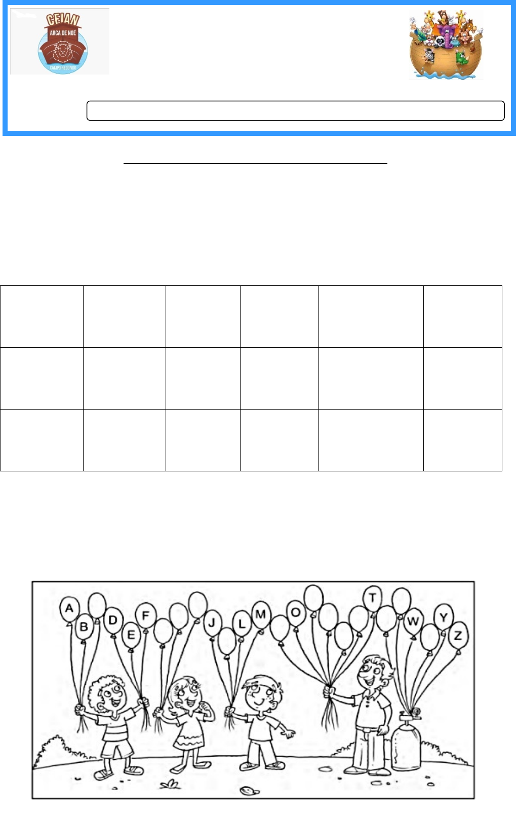 CENTRO EDUCACIONAL INFANTIL ARCA DE NOÉ. DATA: ___/___/2022 TURMA: 2º ANO PROFESSORA:______________________ ALUNO (A): REVISAO DE LÍNGUA PORTUGUESA REVISÃO DE LÍNGUA PORTUGUESA NOSSO 1º SIMULADO ESTÁ SE APROXIMANDO. VAMOS REVISAR! FAÇA COM ATENÇÃO! 1. DURANTE AS NOSSAS AULAS DE LÍNGUA PORTUGUESA APRENDEMOS QUE UTILIZAMOS A LETRA MAIÚSCULA PARA ESCREVER NOMES DE PESSOAS, CIDADES E INICIO DE FRASES. E A LETRA MINÚSCULA PARA ESCREVER NOMES DE OBJETOS. OBSERVE OS NOMES ABAIXO E CIRCULE OS QUE COMEÇAM COM LETRA MAIÚSCULA E FAÇA UM X EM QUAL COMEÇA COM A LETRA MINÚSCULA. Dina tinta lagoa Paulo Rio de Janeiro ditado boneca Brasil papel dedo Luana Mala escola pipoca navio Bia João Casa 2. COMPLETE O ALFABETO COM AS LETRAS QUE ESTÃO FALTANDO. a) PINTE DE AMARELO AS VOGAIS. b) PINTE DE AZUL AS CONSOANTES. 3. EM UMA PALAVRA, PODEMOS ENCONTRAR DUAS OU MAIS VOGAIS JUNTAS. A ESSE GRUPO DE VOGAIS CHAMAMOS DE ENCONTRO VOCÁLICOS. ESCREVA O NOME DAS IMAGENS E CIRCULE O ENCONTRO VOCÁLICOS. 4. DUAS CONSOANTES JUNTAS NA MESMA PALAVRA FORMAM UM ENCONTRO CONSONANTAL. OBSERVE AS IJMAGENS ABAIXO E ESCREVA SEPARANDO EM SÍLABAS, EM SGUIDA CIRCULE OS ENCONTROS CONSONANTAIS. 5. UTILIZAMOS A LETRA DO ALFABETO PARA FORMAR PALAVRAS. OBSERVE AS SÍLABAS ABAIXO E FORME PALAVRAS. 1.________________________ 6. _____________________ 2.________________________ 7. _____________________ 3.________________________ 8. _____________________ 4.________________________ 9. _____________________ 5.________________________ 10. ____________________ CENTRO EDUCACIONAL INFANTIL ARCA DE NOÉ. DATA: ___/___/2022 TURMA: 2º ANO PROFESSORA:______________________ ALUNO (A): REVISAO DE LÍNGUA PORTUGUESA REVISÃO DE MATEMÁTICA 1. OS NÚMEROS FORAM CRIADOS HÁ MUITOS ANOS POR CAUSA DA NECESSIDADE DO SER HUMANO DE CORTAR, REGISTRAR E REPRESENTAR QUANTIDADES.OBSERVE A QUANTIDADE EM CADA PEÇA DO DOMINÓ E ESCREVA POR EXTENSO O NÚMERO. ____________ ______________ ______________ _____________ ____________ _______________ ______________ _____________ _____________ ____________ 2. NUMERE OS BALÕES ABAIXO E DEPOIS COLOQUE EM ORDEM CRESCENTE E DECRESCENTE. · ORDEM CRESCENTE ________________________________________________ · ORDEM DECRESCENTE ________________________________________________ 3. O MATERIAL DOURADO AUXILIA NA COMPREENSÃO DO SISTEMA DE NUMERAÇÃO DECIMAL.UTILIZAMOS O CUBINHO DO MATERIAL DOURADO PARA REPRESENTAR 1 UNIDADE E A BARRA PARA REPRESENTAR 1 DEZENA. ATRAVÉS DAS REPRESENTAÇÕES ABAIXO, DESCUBRA AS QUANTIDADES. 4. AJUDE MARIANA SEPARAR SUA COLEÇÃO DE BONECAS EM GRUPOS DE 10 a) QUANTOS GRUPOS DE 10 VOCÊ FORMOU? _______ b) A QUANTIDADE DE DEZENAS QUE MARIANA FORMARÁ É: ( ) 3 DEZENAS ( ) 2 DEZENAS ( ) 1 DEZENA c) SOBROU QUANTAS BONECAS? ___________ d) QUANTAS BONECAS FALTAM PARA FORMAR MAIS UMA DEZENA? ____________ 6. QUEM SOU EU? a) 1 DEZENA E 6 UNIDADES _________ d) 2 DEZENAS E 1 UNIDADE_________ b) 3 DEZENAS E 7 UNIDADES _________ e) 1 DEZENA E 3 UNIDADES _________ c) 2 DEZENAS E 5 UNIDADES_________ f) 3 DEZENAS E 1 UNIDADE_________ 7. PREENCHA COM O ANTECESSOR E SUCESSOR DO NÚMEROS ABAIXOS. _____11_____ _____ 15 ______ ____ 9 _____ _____16_____ _____ 12 _____ _____ 14 _____ _____13_____ _____ 19 ______ _____ 17_____ CENTRO EDUCACIONAL INFANTIL ARCA DE NOÉ. DATA: ___/___/2022 TURMA: 2º ANO PROFESSORA:______________________ ALUNO (A): REVISAO DE LÍNGUA PORTUGUESA REVISÃO DE CIÊNCIAS LEIA A LETRA DA CANÇÃO E SIGA O CAMINHO DA PULGUINHA EM CADA PARTE DO CORPO. 1. ESCREVA CADA PARTE DO CORPO CITADA NA LETRA DA CANÇÃO. ________________________________________________________________________________ ________________________________________________________________________________ 2. COMPLETE AS FRASES COM O NOME DE PARTES DO CORPO. · OS _________________________________ SÃO USADOS PARA ABRAÇAR. · AS _________________________________ SÃO USADAS PARA ESCREVER. · OS _________________________________ SÃO USADOS PARA ANDAR 3. OBSERVE AS FIGURA ABAIXO E LOCALIZE EM QUAL PARTE DO CORPO CADA FIGURA PODE SER USADA. __________ ________ _________ ___________ 4. AGORA, ESCREVA UM OBJETO QUE PODEMOS USAR NAS PARTES DO CORPO: · · CABEÇA - ________________ · TRONCO _________________ · MEMBROS SUPERIORES - ___________________ · MEMBROS INFERIORES - ____________________ PODEMOS PERCEBER O NOSSO CORPO E O MUNDO QUE NOS RODEIA PELOS SENTIDOS. O CORPO HUMANO POSSUI CINCO SENTIDOS E CADA UM DELES FUNCIONA A PARTIR DE UM DETERMINADO ÓRGÃO. 5. INDIQUE O NOME DO SENTIDO E DO ÓRGÃO QUE ESTÁ SENDO USADO: ÓRGÃO SENTIDO COMER LANCHE SENTIR O CHEIRO DO CAFÉ OUVIR MÚSICA SEGURAR UM ANIMAL VER UMA PAISAGEM 6. COLOQUE V PARA VERDADEIRO E F PARA FALSO. ( ) O ÓRGÃO DO ALFATO É O NARIZ. ( ) COM O TATO PODEMOS OUVIR SONS. ( ) COM A LÍNGUA SENTIMOS OS SABORES DOS ALIMENTOS. ( ) O NARIZ É O ORGÃO DO TATO. ( ) OS OLHOS SÃO OS ÓRGÃOS DO PALADAR. ( ) COM O NARIZ SENTIMOS OS CHEIROS DOS ALIMENTOS. ( ) A LÍNGUA É O ÓRGÃO DO PALADAR. 7. ESTABELEÇA A RELAÇÃO ENTRE CADA ÓRGÃO E SEU SENTIDO. ( )AUDIÇÃO ( ) TATO ( ) OLFATO ( )PALADAR ( ) VISÃO CENTRO EDUCACIONAL INFANTIL ARCA DE NOÉ. DATA: ___/___/2022 TURMA: 2º ANO PROFESSORA:______________________ ALUNO (A): REVISÃO DE HISTÓRIA COSTUMAMOS DIZER QUE TEMOS HORA PARA TUDO: ALMOÇAR, IR À ESCOLA, TOMAR BANHO, BRINCAR, VER TELEVISÃO, DORMIR, ETC... 1. LEIA O TEXTO ABAIXO: 2 – REGISTRE CORREMENTE DE ACORDO: 3- O RÉLOGIO É UM OBJETO QUE FOI INVENTADO PARA MEDIR A PASSAGEM DAS HORAS E MINUTOS DURANTE O DIA, QUE DURA 24 HORAS. OBSERVE ALGUNS ACONTECIMENTOS DO DIA DE PEDRO E MARQUE NO RELÓGIO A HORA CERTA. EU ACORDO AS 8H DA MANHÃ. JOGO FUTEBOL AS 10:30H DA MANHÃ. EU ALMOÇO AS 12H HORAS OU MEIO-DIA. 4 – COLOQUE OS PONTEIROS E REGISTRE AS HORAS MARCADAS NOS RELÓGIOS DIGITAIS: 5- PODEMOS DIVIDIR O DIA EM TRÊS PERÍODOS: MANHÃ, TARDE E NOITE. ESCREVA EM QUAL PERÍODO VOCÊ GERALMENTE REALIZA CADA UMA DAS ATIVIDADES APRESENTADAS NAS CENAS. ___