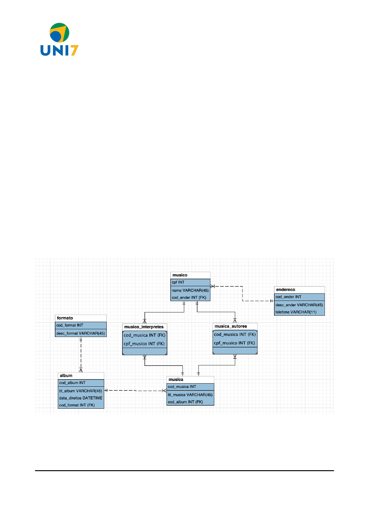 CENTRO UNIVERSITÁRIO 7 DE SETEMBRO Curso: Análise e Desenvolvimento de Sistemas Disciplina: Banco de Dados I Professor: Fernando Siqueira 5º. Exercício – Modelo Relacional 1. A Siqueira Music Records (SMR) decidiu armazenar informações sobre músicos que tocam em seus álbuns (assim como outros dados da empresa) em um banco de dados. A empresa escolheu sabiamente contratar você como projetista de banco de dados. Elabore o diagrama relacional considerando os requisitos de dados descritos a seguir. a. Cada músico que grava na SMR tem um CPF, um nome, um endereço, e um número de telefone. b. Músicos que não ganham muito normalmente compartilham o mesmo endereço, e nenhum endereço tem mais do que um telefone de contato. c. Cada álbum com o selo SMR tem um título, uma data de direitos autorais, um formato (por exemplo, CD, DVD, BlueRay, etc), e um identificador de álbum. d. Cada música gravada na SMR tem um título e pode ter mais de um autor. Assim como um autor pode ter várias músicas gravadas. e. Cada álbum tem um número de músicas gravadas, mas nenhuma música pode aparecer em mais de um álbum. f. Cada música é interpretada por um ou mais músicos, e um músico pode interpretar mais de uma música. MISSÃO INSTITUCIONAL “Contribuir para o desenvolvimento da sociedade, educando para a cidadania, propiciando a formação de profissionais competentes, felizes e éticos.”