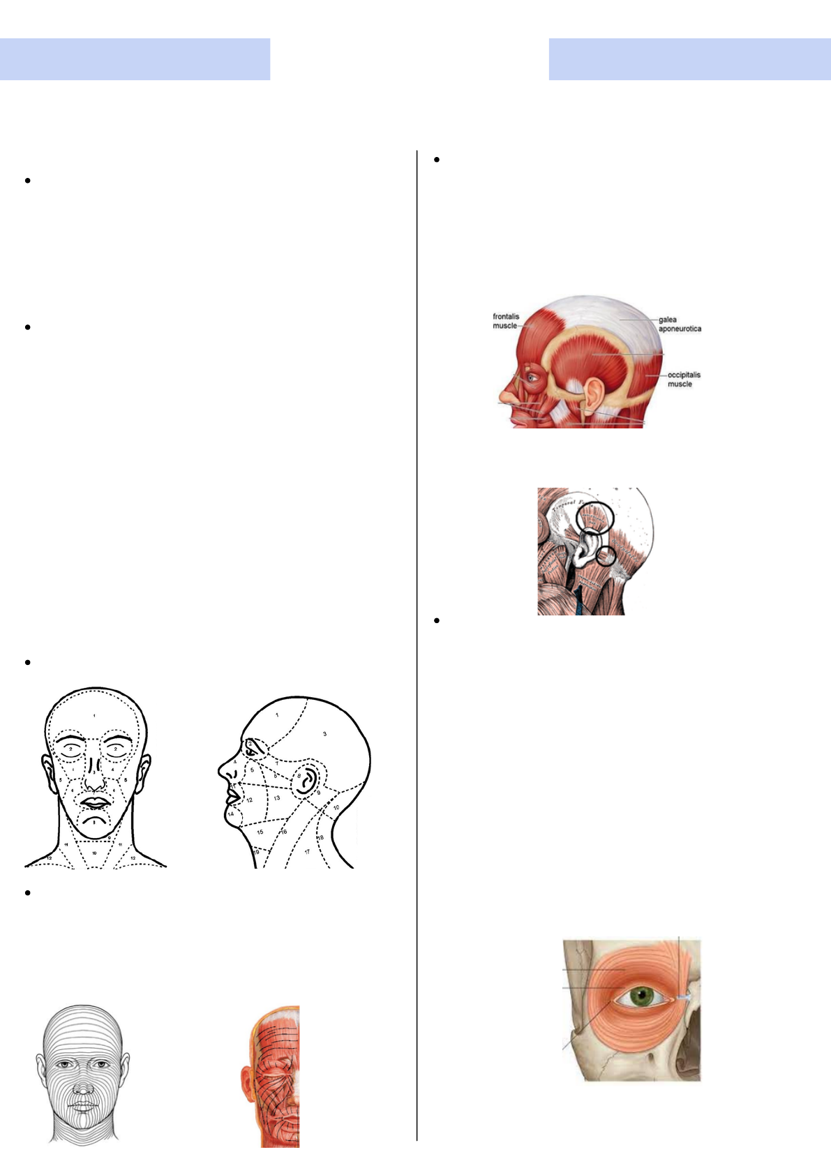 Músculos origem (osso) inserção (camadas profundas da pele) ação inervação vascularização Músculos da expressão facial: Regiões da face (delimitadas por sulcos) Linhas cutâneas de tensão 1. 2. 3. 4. 5. -São músculos delgados, intimamente relacionados com o couro cabeludo, face, pescoço, e que não estão fixados, em partes esqueléticas pelas suas duas extremidades, mas sim à camadas profundas da derme. -São caracterizados por apresentarem pelo menos uma de suas inserções na pele, localizando-se superficialmente na face. -Se fixam à derme e são capazes de mover a pele do couro cabeludo, face e do pescoço -Possuem a capacidade de exprimir estados emocionais *Todos os músculos da expressão facial são inervados motoramente (contração e relaxamento) pelo par VII (nervo facial) *A vascularização é promovida por ramos da carótida externa *Os músculos da expressão facial são músculos delgados e superficiais que muitas vezes não tem fáceas musculares e expressão facial -As rugas obedecem as principais linhas faciais (linhas de langers) Anatomia Músculos da expressão facial *DICA DE OURO* Nas expressões faciais a direção das rugas é sempre perpendicular a direção das fibras musculares Músculo do couro cabeludo: Músculos das pálpebras: Occipofrontal - Músculo occipitofrontal *Ventre frontal se origina na gálea aponeurótica e sua inserção é na pele das sobracelhas *Ventre occipital se origina na linha nucal superior e sua inserção na gálea aponeurótica - Músculos auriculares são músculos pequenos, delgados e muitas vezes na espécie humana ausentes 1. 2. Orbicular do olho -Ações: fechamento do olho, dilatar o saco lacrimal e proteção da bulbo do olho -Circunda o olho -Possui 3 feixes: Feixe palpebral: palpebra superior (se origina no ligamento palpebral medial e se insere no lateral) Feixe orbital: origem no processo frontal da maxila e se insere na sutura frontomaxilar Feixe lacrimal: localizado ao redor do saco e ductor lacrimal, ele fica por baixo do orbital, possui a função de contrair o saco lacrimal na drenagem da lágrima, se insere próximo ao saco lacrimal e se origina no osso. Músculos do nariz: Músculos da boca: Músculo constritor: 3. Corrugador do supercílio: -Músculo delgado de fibras horizontais -Se origina na região óssea no canto medial do arco superciliar -Inserção: pele do supercílio (lateral) -Ação: aproxima as sobrancelhas para a linha média -Expressões de reflexão, fome, dor, raiva (frangir a testa) -Prócero: Músculo delgado, longo e vertical Origem: osso nasal Inserção: pele da glabela e supercílio Ação: abaixa a pele entre as sobrancelhas, prega transversal na base do nariz. Expressão: imprime na face um aspecto ameaçador, expressa agressão -Nasal Origem na base do processo alveolar Duas porções: *Transversa origina na saliência do canino superior e a inserção no dorso do nariz (porção inferior do dorso do nariz) *Alar origina na saliência do incisivo lateral superior e a inserção na cartilagem alar (circunferência lateral das narinas) -Ação antagônica: porção alar dilata as narinas e a porção transversa estreita o diâmetro da narina -Expressões: desprezo -Depressor do septo nasal Origem nas eminências alveolares do incisivos superiores Inserção no septo nasal Ação: abaixa a asa do nariz 1. -Orbicular da boca Origem: linha mediana anterior da maxila e da mandíbula Possui dois feixes: superior e inferior, esses feixes se unem formando o nódulo tendinoso formando o ângulo da boca, possui pequena depressão (arco do cupido) que é o filtro do lábio. Inserção: pele dos lábios Ação: fechamento da rima da boca, movimentar os lábios, propulsão dos lábios, soprar, sugar, beijar e assobiar Expressão: raiva e ira 2.Músculos dilatadores: -Levantador da asa do nariz e do lábio superior Origem: processo frontal da maxila Inserção: pele da borda posterior da asa do nariz e na pele do lábio superior e ele contribui para formar o sulco nasolabial Ação: elevação e reversão do lábio superior e dilatação das narinas Expresão: nojo -Músculo levantador do lábio superior: Origem: entre o bordo infraorbital e forame infraorbital Inserção: pele do lábio superior e contribui para formar o sulco nasolabial Ação: levantar o lábio superior, ressaltando o sulco nasolabial Expressão: desprezo -Músculo levantador do ângulo da boca Origem: fossa canina Inserção: nódulo tendinoso Ação: move o lábio superior, põe o canino a mostra Expressão: riso -Músculo zigomático maior: Origem: processo temporal do osso zigomático Inserção: ângulo da boca Ação: puxa comissura labial supero-lateralmente Expressão: risada verdadeira -Músculo zigomático menor Origem: porção mais saliente do corpo do osso zigomático Inserção: pele do lábio superior (abaixo da asa do nariz) Ação: eleva o lábio superior Expressão: sorriso falso -Músculo risório É um músculo tênue, ou seja, muito fino e frequentemente ausente Origem: fáscia do músculo masséter Inserção: pele e ângulo da boca Ação: Mover lateralmente a comissura dos lábios Expressão: riso grácil -Músculo depressor do ângulo da boca: Bastante superficial Origem: linha oblíqua da mandíbula Inserção: ângulo da boca Ação: abaixar infero-lateralmente a comissura dos lábios Expressão: atua no pranto, tristeza -Músculo depressor do lábio inferior: Origem: acima da inserção do m. depressor do ângulo da boca Inserção: pele e mucosa do lábio inferior, pele do mento Ação: aumenta a largura do vermelho dos lábios e abaixa/desloca o lábio inferior para fora Expressão: soberba -Músculo mentual: Origem: área ovalar na profundidade da fossa mental Inserção: pele do mento e m. orbicular do lábio Forma as covinhas central do queixo Expressão: desprezo -Músculo bucinador profundo Origem: processos alveolares da maxila e mandíbula e rafe pteriomandibular Inserção: ân