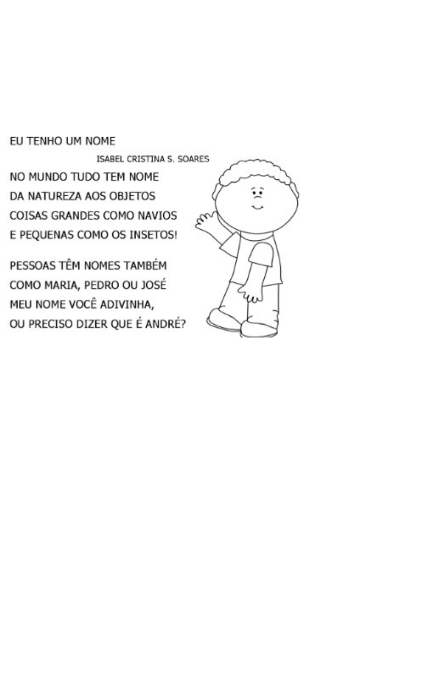 TEMA:IDENTIDADE "QUEM SOU EU?" ATIVIDADES SOBRE O TEMA. 1ºMOMENTO: POEMA "EU TENHO UM NOME" 1) Ler o poema e depois conversar sobre o nome da criança e seus familiares: · Qual o seu nome? Ele começa com qual letra? · Qual o nome da mamãe? Do papai? Dos avós...irmaõs...(É comum as crianças responderem que o nome da mamãe é mamãe! Nesse momento dever ser explicado que cada mamãe/pessoa tem um nome próprio). 2) Conversar sobre o nome dos objetos , brinquedos...Cada coisa tem seu nome! ATIVIDADES DE AUTONOMIA DA CRIANÇA · Ouvir o poema e repetir as estrofes. · Conversar sobre o próprio nome e nome dos familiares. · Responder com autonomia quando lhe perguntar: Qual é o seu nome? 2ºMOMENTO: MÚSICA "O MEU NOME EU VOU FALAR! 1) Cantar a música, junto a criança, falando o nome dela, depois dos outros familiares. O MEU NOME EU VOU FALAR É TÃO FÁCIL DE DIZER FAZ SILÊNCIO PRA ESCUTAR QUE VOCÊ VAI APRENDER! (Dizer o nome) 2) Usar a ficha para observar o nome, depois montar o nome com as tampinhas/alfabeto móvel. · Contar quantas letrinhas tem o nome. · Com qual letrinha começa?E com qual termina? · Falar o nome das letras que formam o nome . 3) Registrar o próprio nome , com letra maiúscula, igual a ficha (iniciando pela primeira letrinha e gradativamente irá conseguir registrar). Observação: Lembrar sempre a posição correta de pegar no "lápis" ATIVIDADES DE AUTONOMIA DA CRIANÇA · Cantar com autonomia a música do nome próprio. · Observar a ficha e montar o próprio nome. · Apontar com o dedinho a letrinha inicial e final. · Escrever sozinha o nome, como conseguir. 3ºMOMENTO: ABRINDO O ÁLBUM DE FAMÍLIA/ HISTÓRIA DO NOME 1) Sente-se com sua criança, mostre fotos da chegada dela na família! Fale sobre essa espera especial! 2) Conte como foi a escolha do nome dela.Quem escolheu? 3) Por que escolheu esse nome? Falar sobre o significado/história do mesmo? - Mostre que assim como sua criança, o nome dela é lindo e especial 4) Apresentar para a criança a sua certidão de nascimento. Deixar ela localizar o próprio nome. Falar sobre a certidão! (A certidão é muito importante! É o primeiro documento de um cidadão. Nela consta o nome da criança, a sua filiação: mãe, pais, avós, a data e o local onde a criança nasceu...) 4) Fazer um desenho da família( Como conseguir). ATIVIDADES DE AUTONOMIA DA CRIANÇA · Observar as fotos e conhecer a própria história. · Recontar fatos sobre o seu nome .Quem escolheu? · Desenhar a família e colocar o desenho em seu quarto, para apreciação. Explicar o que desenhou. · 4ºMOMENTO: QUEM SOU EU? 1) Assistir ao vídeo , observando os personagens e suas cores. 2) Em frente ao espelho,observar a própria imagem, a cor da pele, dos olhos cabelos...enfim as características que lhes deixam único e especial. 3) Conversar sobre com quem se parece, fisicamente, na família e sobre o jeitinho de ser/personalidade lembra alguém ? 4) Usar massinha de modelar para esculpir o próprio corpinho .Fazer outras pessoas da família.(A mamãe pode brincar de fazer o próprio bonequinho também, depois comparar se ambos estão parecidos) ATIVIDADES DE AUTONOMIA DA CRIANÇA · Observar suas características, · Sentir-se bem com ela mesma. · Modelar o próprio corpinho com massinha. 5ºMOMENTO: : HISTÓRIA "JACAREZINHO EGOÍSTA" 1) Conversar sobre a história: · Quem são os personagens? Quantos são? Quem teve atitude egoísta? · O jacarezinho não gostava de dividir as coisas...O que ele fez com os patinhos? · No final da história,ele aprendeu dividir ...Assim ele ficou mais triste ou mais feliz? · O que aconteceu quando o jacarezinho dividiu a lagoa com os patinhos? · E você meu filho/ filha sabe dividir? Empresta os brinquedos ? Divide os alimentos/lanche com o irmão, colegas? "É aprender os momentos de fazer as coisas sozinho e em grupo.Ser uma criança educada, respeitar os mais velhos(mamãe/papai, vovó/vovó...) , saber o momento de brincar e o momento de estudar!" ATIVIDADES DE AUTONOMIA DA CRIANÇA · Falar quais são os personagens. · Recontar partes da história. · Aprender que é interessante dividir o espaço, objetos, alimentos. · Entender que o tempo também precisa ser dividido, entre brincar e estudar , um pouco a cada dia! ATIVIDADES PARA FAZER E ENTREGAR À PROFESSORA! DATA DE ENTREGA: ___/___/____ ORIENTAÇÕES SOBRE A ATIVIDADE/LIVRINHO NOME. SENHORES PAIS! 1) VOCÊS ESTÃO RECEBENDO, UMA ATIVIDADE IMPRESSA, CONVERSE COM A CRIANÇA PARA QUE FAÇA COM ATENÇÃO E CARINHO! 2)INICIE COLORINDO OS DESENHOS DA CAPA.ENFEITE COMO DESEJAR (COLE PAPÉIS PICADOS, RASPA DE LÁPIS,LANTEJOULAS)! 1ª PRIMEIRA ATIVIDADE: PROCURAR EM JORNAIS E REVISTAS A LETRINHA INICIAL DO NOME, RECORTAR E COBRIR O TELHADO DA CASINHA. O MEU NOME COMEÇA COM A LETRINHA.... 2ª ATIVIDADE: OBSERVE A LETRINHA INICIAL, COLORA A LETRA COM A COR QUE DESEJAR. COLOQUE A FOLHA SOBRE UM PEDAÇO DE PAPELÃO OU ISOPOR, PARA QUE A CRIANÇA FAÇA AS PERFURAÇÕES, USANDO UM PALITINHO E CANTANDO: "FURANDO FURANDO COM MEU NOME EU VOU BRINCANDO". 3ª ATIVIDADE: OBSERVE AS ESTRELINHAS COM O SEU NOME E O NOME DOS COLEGAS. LOCALIZE E COLORA A ESTRELINHA QUE CONTÉM O SEU NOME. JÁ CONSIGO LOCALIZAR O MEU NOME! 4ª ATIVIDADE: ENFEITE O SEU NOME COM BOLINHAS DE PAPEL CREPOM.