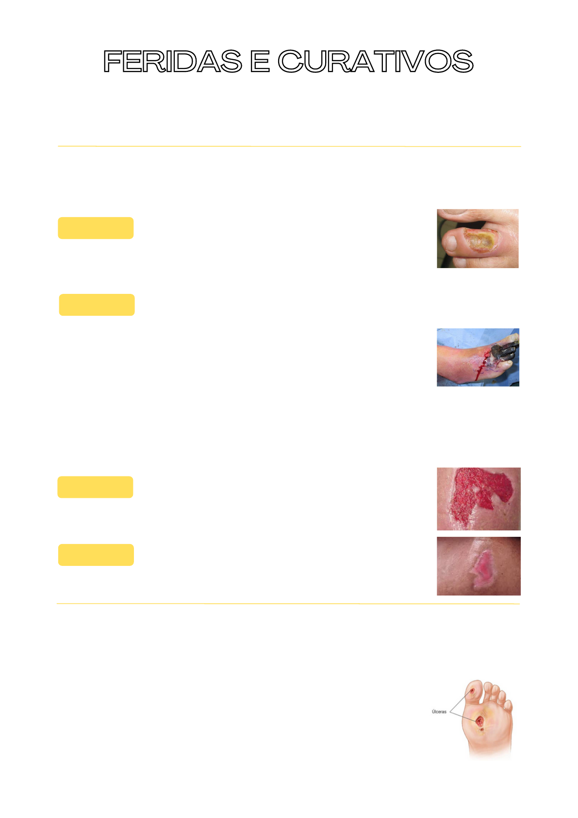 As feridas são consequências de uma agressão por um agente ao tecido vivo. Qualquer interrupção de qualquer tecido corpóreo. Podem ser classificadas de várias maneiras: pelo tipo do agente causal, de acordo com o grau de contaminação, pelo tempo de traumatismo, pela profundidade das lesões, sendo que as duas primeiras são as mais utilizadas. Elaborado por Giovanna Nery Sanches FERIDAS E CURATIVOSFERIDAS E CURATIVOS TIPOS DE TECIDOS Refere-se ao tecido necrosado de consistência delgada, mucoide, macia e de coloração amarelada, bronzeada ou cinza. É formado por bactérias, fibrina, elastina, colágeno, leucócitos, fragmentos celulares, exsudato e grande quantidade de ácido desoxirribonucleico (DNA). Esfacelo TECIDO INVIÁVEL Tecido morto, que perdeu suas propriedades físicas e atividades biológicas. É descrito como uma capa/crosta de camadas de tecidos comprimidos, de consistência dura e seca. Apresenta coloração cinza, marrom ou preta e firme aderência ao leito da ferida. Na medida que a escara é hidrata ocorre, gradativamente, o amolecimento. Elas surgem em pessoas que permanecem muito tempo na mesma posição, geralmente em pessoas acamadas ou com mobilidade reduzida. As lesões da escara se desenvolvem à pressão constante em pontos com proeminências ósseas que ficam em contato com a superfície. Os locais mais afetados são a região sacral (acima do cóccix), a parte superior e lateral do fêmur, o osso lateral dos pés e os calcanhares. Escara TECIDO VIÁVEL Tecido formado no processo de cicatrização que reconstitui a área lesionada. O tecido de granulação é vivo, viável, tem aparência rósea/avermelhado, liso e se caracteriza pela formação de pequenos novos vasos sanguíneos (vascularizado). Sinal de boa evolução do processo de cicatrização. Granulação Indica que o processo de cicatrização está chegando no fim. Tem como característica a coloração rosada e, geralmente, surge a partir das bordas da lesão e se desenvolve para o centro. Epitelização FERIDAS AVALIAÇÃO Toda ferida deve ser avaliada em sua profundidade, altura e largura. Essas medidas devem ser realizas com uma régua descartável/papel (caso não haja, utilizar uma pinça estéril para medição do local). ULCERATIVA São lesões escavadas, circunscritas na pele, formadas pela morte e expulsão do tecido, resultantes de traumatismo ou doenças relacionadas com o impedimento do suprimento sanguíneo, que podem ser decorrentes de pressão, alterações vasculares ou complicações do Diabetes Mellitus. Elaborado por Giovanna Nery Sanches INCISIVA As feridas incisas ou cirúrgicas são aquelas produzidas por um instrumento cortante (faca, bisturi, lâminas). As feridas limpas geralmente são fechadas por suturas. PERFURANTE Ferida ocasionada por agentes longos e pontiagudos como prego e alfinete. É grave pois atravessa tecidos/órgãos. Ao verificar a cor azulada ao redor da perfuração, significa que a perfusão não está boa. Por isso, é necessário sempre verificar a pressão arterial. CONTUSA Ferida ocasionada por contusão causando a ruptura de capilares, ficando arroxeado. Conhecido como hematoma. TRAUMÁTICAS Feridas provocadas acidentalmente. Ferimento por arma de fogo. Agentes perfurantes Superfícies ásperas (abrasão e laceração).Atrito Aranha, cobra, escorpião. Inoculação de veneno Queimaduras: térmica, química, elétrica ou radioativa. Exposição a agentes Vidro, navalhas ou facas. Agentes cortantes FISIOLOGIA DA CICATRIZAÇÃO FASE INFLAMATÓRIA (1 A 5 DIAS) Imediata resposta vascular e celular após a lesão. Vasoconstrição (hemostasia). Vasodilatação. Neutrófilos e monócitos penetram na ferida. Inicio da multiplicação celular para regeneração tecidual. A cicatrização é um processo complexo, que envolve mecanismos celulares, moleculares e bioquímicos, visando a restauração da função e estruturas normais dos tecidos. Envolve três etapas básicas. FASE PROLIFERATIVA (2 A 20 DIAS) Repitalização. Angiogênese. Nova rede vascular. Formação do tecido de granulação. Síntese de colágeno. FASE MATURAÇÃO (21 DIAS A MESES/ANOS) Aumento da resistência da ferida; Elaborado por Giovanna Nery Sanches FATORES QUE INTERFEREM NA CICATRIZAÇÃO Cuidados com a ferida. Presença de corpos estranhos e/ou de tecido necrótico. Localização. Idade avançada. Dimensão e profundidade da lesão. Tipo de tecido lesado. Falta de oxigenação. Má nutrição. Estado imunológico. Tabagismo. TIPOS DE CICATRIZAÇÃO PRIMEIRA INTENÇÃO Incisão limpa em que as bordas estão aproximadas devido a pouca perda de tecido. Pouco ou nenhum exsudato. O edema é mínimo, não há infecção ou corpo estranho. O tecido de granulação não é visível, e a mobilização da lesão é pequena. SEGUNDA INTENÇÃO É aquela que permanece aberta. Onde existe uma perda significante de tecido e onde as fases de cicatrização são bastante marcadas. Resposta inflamatória bastante evidente, com necessidade maior de tecido de granulação, com epitelização visível. A cicatrização acontece tardiamente, muitas vezes com infecção associada, formação de tecido de granulação e posterior epitelização. TERCEIRA INTENÇÃO Ferida que fica aberta por um tempo determinado. Ela ficará aberta só enquanto estiver com uma infecção real e depois ela irá se fechar. AVALIAÇÃO DA FERIDA Verificar se é um local de tração. Localização Anatômica Negra, amarela e vermelha.Coloração Transudato e Exsudato.Secreção Medir altura, comprimento e profundidade.Extensão Verificar as características do tecido ao redor da ferida: maceração, inflamação, cianose ou palidez. Pele circundante Elaborado por Giovanna Nery Sanches TRATAMENTO Para cada tipo de ferida é necessário um tratamento diferente. Sempre que se tratar de uma ferida aberta é necessário manter o ambiente úmido. Ferida aberta Oclusão obrigatória nas primeiras 24/48 horas. Necessário man