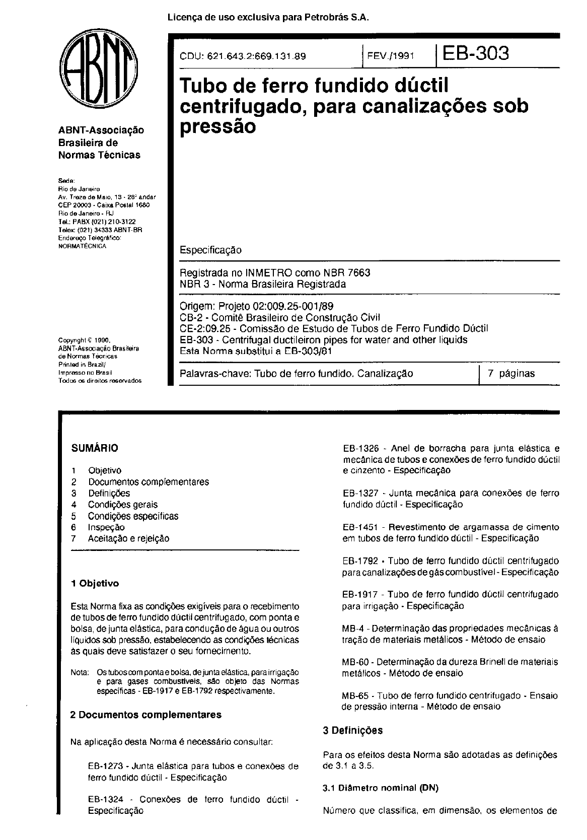 Licenca de us.0 exclusiva para Petrobrks S.A. ABNT-Associa@o Bmsileira de Normas TCcnicas CDU: 621.643.2:669-l 31.89 FEV./1991 1 EB-303 Tubo de ferro fundido dtictil centrifugado, para canaliza@es sob press50 Especifica@o Registrada no INMETRO coma NBR 7663 NBR 3 - Norma Brasileira Registrada Ofigem: Projeto 02:009.25-001/89 GE-2 - Comite Brasileiro de Constru@o Civil CE-2:09.25 - Comissao de Estudo de Tubos de Ferro Fundido Dtktil EB-303 - Centrifugal ductileiron pipes for water and other liquids Esta Nonnasubstitu a EB-303181 Palavras-chave: Tubo de ferro fundido. Canaliza@o 7 paginas SUMhI 1 Objetivo 2 Documentos complementares 3 Defini&s 4 Condig& gerais 5 Condigdes especificas 6 Inspe@o 7 Aceitagao e rejeigao 1 Objetivo Esta Norma fixa as condig& exigiveis para o recebimento de tubas de fen0 fundido dtictil centrifugado, corn ponta e balsa, de juntaelastica, paracondugaodeaguaou outros liquidossob pressao, estaklacendo as ccnd@ks tecnicas as quais deve satisfazer o seu fornecimento. Nota: Ostubosmmpon~aebolsa,dejuntael~fica. parairriga@ e para gases mmbustlveis. Sao obkto das Normas espacificas EB-1917 e EE-1792 raspectivamente. 2 Documentos complementares Na aplicagao desta Norma e necessario consultar: EB-1273 -Junta elastica para tubos e conex&?s de ferro fundido dtictil - Especificagao EB-1324 - Conex&?s de ferro fundido dljctil - Especificagao EB-1326 - Anel de borracha para junta elastica e mecanica de tubas e conex&s de ferro fundido doctil e cinzento - Especificagao EB-1327 - Junta mecanica para COnex&?S de ferro fundido dirctil - Especificagao EB-1451 Revestimento de argamassa de cimento em tubos de ferro fundido dljctil Especificagao EB-1792 . Tubo de ferro fundido dljctil centrifugado paracanaliza~esdegascombustivel- Especifica@o EB-1917 Tuba de ferro fundido dtictil centrifugado para irrigagao - Especificagao MB-4 Determinagao das propriedades mecanicas a tragHo de materiais metalicos - Metodo de ensaio MB-60 - Determinagao da dureza Brine11 de materiais metalicos - Metodo de ensaio MB-65 Tub0 de ferro fundido centrifugado - Ens&o de press&o interna Metodo de ens&o 3 Defini$des Para OS efeitos desta Norma sao adotadas as definigdes de 3.1 a 3.5. 3.1 Diametro nominal (DN) Nornero que classifica. em dimensao. OS elemenlos de Licenp de use exclusiva para Petrobrks S.A. 2 EB-303/1991 tubula@es (tubas, Conexdes, etc.) a qua corresponde aproximadamente ao diametro interno da tubulagao em milimetros. 0 diamelro nominal nao dew ser objeto de medi@o nem ser utilizado para fins de calculo hidraulico. 3.2 Ferro fundido dtictil ou nodular Ferro fundido que apresenta, ap6s solidifica@o, grafita primariaem formadeesferasoun~ulos(grafitaesferoidal 0” nodular). 3.3 Junta elAstica, ponta e balsa Junta de montagem deslizante, constituida pelo conjunto formadopelapontadeumtuboouconexHo(EB-1324)com a balsa contigua de outro tub0 ou COnexaO e pel0 anel de vedagao(EB-1326). montadosconformeascondi@esda EB-1273. 3.4 Comprimento titil (L) Distancia expressa em metros que vai da extremidade da ponta do tuba ate o esbarro ou batente de sua balsa (ver Figura). 3.5 Espelho da balsa Par@ externa da b&a, de forma anelar. perpendicular ao eixo do tuba (ver Figura). \ Espelho da bolao Flgura 4 CondiqBes gerais 4.1 Requisites de’fabrica@o 4.1.1 Tipodejunta EStaNormaerelativaa tubosde juntaelasticaquepodem, p&m, ser acoplados a tubas elou conexdes corn outros tipos de juntas coma, por exemplo, a junta mecanica da EB-1327.Acompatibilidadesedeveaofatodeodiametro externo da ponta e was tolerancias serem OS mesmos para todos os tipos de junta. 4.12 Espessura nominal de parade 4.t2.1 A espessura nominal de pa&e dos tubas e c&&da em rela@o ao diametro nominal DN, pela formula: 4.1.2.2 A Tab& 1 indica os valores das espessuras para asclassesK-6,K-7eK-9,ques~oasdeusomaiscomum. Notas: a) Exlstem tras excepaes para a formula geral indicada em 4.1.2.1: K-7 e - 4.3 + 0,CWDN para OS DN 50 ata 80 e - 437s + O,W3DN para OS DN 100 ala ml K-9: e = 5.8 + 0.003DN. mm valor mlnimb da Bmm para OS DN 50 ata 200 b) OS diametros extemos 00s tubas, para urn determinado diametro nominal, tam o mesmo valor dimen%snal para todas as da%S. Fica garaotida, assim, a sua interoambiabilidade. A varia@o de espessura acarreta a varla@o correspondem do diknew interno. e = K (0.5 + 0,001 DN) Onde: OS tubas de ferro fundido drktil centrifugado devem trazer, no minimo, as seguintes mamas: e - espessura de parede, em mm a) marcas de fundi@ na balsa, DN = diametro nominal - valor do diametro nominal; identificagao do fabricante; K - coeficiente adimensional, escolhido na seqtiencia dos nbmeros inteiros 6, 7, 8. 9, - ano de fabrica@o; 10, 11, 12, e caracteristico da classe do tuba. letras: FD (material ferro dtictil); Licenp de USCI exclusiva para Petrobrks S.A. b) marcas a frio no espelho da balsa, . classe do tuba. POT exemplo: K-6, K-7 ou K-9; c) marcas a linta em todo o espelho da balsa, - classe K-6: car branca; - classe K-7: car amarela; claw? K-9: car aluminio. 4.1.4 Qualidade dos fubos OS lubes de ferro lundido dirctil devem satisfazer as condi@?s a segulr: a) ser iacilmente cort&eis, rasqueaveis, broqt&veis e limaveis. Em case de contesla@o sobre a usinabilidade dos tubas, pode-se recorrer ao teste de entalhe de uma lima bastards, chata ou quadrada, atuando na superficie externa dos tubas 0” a0 teste de dureza superficial. OS tubas corn dureza superficial menor que 230HB devem ser aceitos; b) apresentar superficies interna e externa convenientemente lisas e ser isentw de defeitos de superficie e outros, EB-303/1991 3 - cerlcs defeitos podem %?r reparados par processo aprovado de cornurn awrdo entre comprador e fabricante, coma, por exemplo, a soldagem. 4.1.6 Reveslimento dos tubas OS tubas de ferro fundido dtictil devem ser revestidos: a) internamente, . corn argamassadecimentoconforme E&1451, pcdendo receber urn impermeabilizante (‘Seal coat’) sobre a argamassa de cimento que n?~o altere as condi@es do liquid0 transportado; b)