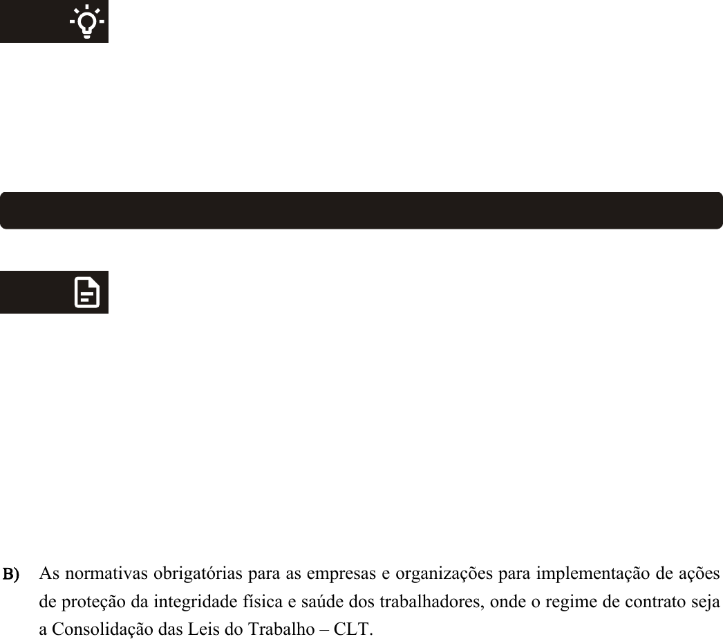 DICA DO PROFESSOR Referem-se às leis que regulamentam o vínculo empregatício, regendo o acordo de trabalho entre funcionários e empresas.O vídeo mostra como a segurança e a saúde ocupacional começaram a ser inseridas nas atividades laborais. Conteúdo interativo disponível na plataforma de ensino! EXERCÍCIOS 1) As Normas Regulamentadoras, estabelecidas pelo Ministério do Trabalho, referem-se a qual tópico de atuação nas indústrias e organizações? A) As diretrizes básicas para avaliação e concessão de benefícios sociais referente à doença e acidente relacionado ao trabalho. B) As normativas obrigatórias para as empresas e organizações para implementação de ações de proteção da integridade física e saúde dos trabalhadores, onde o regime de contrato seja a Consolidação das Leis do Trabalho – CLT. C) Referem-se às leis que regulamentam o vínculo empregatício, regendo o acordo de trabalho entre funcionários e empresas. D) A descrição da formação mínima necessária para os profissionais da segurança e saúde ocupacional atuantes nas organizações. E) Definição dos tópicos de avaliação de concessão de bolsas de apoio ao desenvolvimento dos trabalhadores no Programa Nacional de Valorização do Trabalhador. Em relação às doenças ocupacionais, inerentes à realização de qualquer tipo de 2) atividade laborar, podemos afirmar que: A) Todos os trabalhadores estão expostos em menor ou maior grau, sendo que medidas de prevenção e controle devem ser adotadas para evita-las. B) Com a Revolução Digital a incidência destas doenças ocupacionais foi reduzida, em função das atividades realizadas pelos trabalhadores. C) Os trabalhadores devem escolher trabalho em locais onde existam menos riscos, estando assim protegidos das doenças ocupacionais. D) Somente a pressão por realizar uma determinada tarefa gera doenças ocupacionais E) As doenças ocupacionais estão controladas nos ambientes de trabalho, em função da grande evolução tecnológica e competitividade global. 3) Em relação às doenças ocupacionais apresentadas, os Distúrbios osteomusculares relacionados ao trabalho (DORT) estão associados a: A) Ruído, onde um trabalhador fica exposto a diversas máquinas em operação sem a devida proteção sonora. B) Poeira, onde um trabalhador fica em ambiente com material em suspensão no ar sem a devida proteção respiratória. C) Estresse, relacionado à carga de trabalho muito superior a que um determinado trabalhador consegue realizar. D) Câncer, onde um trabalhador fica exposto a compostos químicos carcinogênicos. E) Repetição de uma tarefa, como por exemplo, um operador de computador que utiliza o teclado durante períodos de tempo longos. 4) As condições nos locais de trabalho levam a riscos ocupacionais nestes ambientes. Exemplos de atividade que envolvem a presença de riscos biológicos são: A) Costura de peças de vestuário em fábricas têxteis. B) Manuseio de material contendo vírus em laboratórios de analise clínicas. C) Corte e dobra de chapas de aço em metalúrgicas. D) Mistura de componentes químicos em indústrias químicas. E) Trabalho em temperatura baixa em câmaras frias de frigoríficos. 5) A Síndrome de burnout, termo utilizado inicialmente por Freudenberger (1974), caracteriza um esgotamento físico e mental, causado por: A) Exposição a risco relacionado às temperaturas e pressões anormais (altas ou baixas) no ambiente de trabalho. B) Dificuldade de atendimento das normas regulamentadoras impostas pelo Ministério do Trabalho. C) Sentimento de fracasso e exaustão, causado por excessivo desgaste de energia e recursos, ligados a situações de trabalho. D) Dificuldades respiratórias relacionadas à asma causada por poeiras no local de trabalho. E) Carregamento e movimentação excessiva de peso nos ambientes de trabalho.