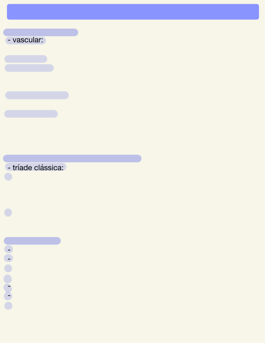HEPATOESPLENOMEGALIA Funções do fígado: - vascular: suprimento sanguíneo pela artéria hepática e veia porta (muito vascularizado) - digestiva: produção e secreção de bile - metabólica: metabolismo de carboidratos, lipídios e proteínas (albumina, fatores de coagulação, globulinas, transformar amônia em uréia, metabolizar vitaminas e ferro - hematopoietica: hematopoiese extramedular, reativação quando necessário e processo hemoliticos - imunológica: parte do sistema retículo endotelial (defesa para microrganismos e remoção de imunocomplexos - endotélio sinusoidal: células de Kupffer - capazes de eliminar germes e fragmentos de células mortas Síndrome colestática do RN e lactente - tríade clássica: icterícia, colúria e acolia fecal - 40% dos RN com BD aumentada = atresia de vias biliares (diagnóstico de urgência, cirurgia de Kasai) *hepatite transinfecciosa: infecção do ITU por gram- que produzem toxinas que afetam o fígado, resultando na hepatite transinfecciosa - outras causas: deficiência de alfa-1-antitripsina, erro inato de metabolismo e infecções congênitas, idiopática Alerta amarelo - RN com icterícia maior ou igual a 14 dias - checar coloração das fezes e urina + HMG, reticulócitos, BTF - acolia/colúria e/ou aumento de BD - encaminhar para especialista - BD >1 mg/dL se BT <5 mg/dL - BD>2 mg/dl ou >20% do total se BT>5 mg/dl - objetivo é melhorar o prognóstico da atresia de vias biliares Doença de gaucher - autossômica recessiva - deficiência hereditária da enzima glucosidase, causa acumulo da substância tóxica , glucosilceramida, no fígado, baço, osso e medula ossea -> manifestações clinicas - osteopenia, dor ossea e fraturas patológicas - anemia, trombocitopenia e leucopenia - esplenomegalia marcada e hepatomegalia - hepatócitos são ricos em citocromo P450 (família de enzimas) - capaz de metabolizar, inativar e facilitar a eliminação pelos rins de diversas substâncias Provas de função hepática - eletroforese de proteínas : albumina ↓; ↓alfa-1 globulina (85-90% = alfa-1-antitripsina); gamaglobulina - enzimas hepáticas e canaliculares: FA-fosfatase alcalina e gama-GT- gamaglutamiltransferase em processos colestáticos - eilirrubinas: BD - 20% do total sugere colestase -*coagulograma (fatores de coagulação: fibrinogênio, protrombina, fatores V,VII,IX,X....) - glicemia Tamanho normal do fígado - borda superior do fígado: 4-6 EID (espaço intercostal direito) - até 6 meses: 3,5 cm RCD na linha hemiclavicular - 6m-2anos: até 2 -3cm - 2-10 anos: até 2 cm - 10 anos: média de 6,1 cm meninos/5,4 cm em meninas * rebaixamento pelos quadros respiratórios Funções do baço - polpa branca: compartimento linfóide - polpa vermelha: sistema de filtração (fagócitos/cemitério das hemácias/armazenamento de componentes sanguíneos) Tamanho do baço - primeiro mês: ponta de baço palpável em 14% - até 10 anos: 7% - adultos: até 3% Etiopatogenia - inflamação - depósito excessivo - infiltração celular - congestão do fluxo sanguíneo - obstrução biliar esplenomegalia Hepatoesplenomegalia - lactentes: infecção urinaria/ trato respiratorio + hepatoespleno discreta (regressão depois do fim do quadro) - hiperbilirrubinemia direta - maioria é discreta ou moderada, curta duração, febre, estado geral preservado - processos infecciosos - produção de toxina extra hepática - infiltração de cels inflamatórias no fígado e/ou baço e hiperplasia das cels de kupffer - evolução benigna, resolução espontânea em menos de 2 meses -> hepatite transinfecciosa Causas infecciosas -> sd de loeffler: NASAT - fase larvária pulmonar, pode apresentar passagem da larva pelo fígado Hepatite A - aguda - incubação: 15-50 dias - sintomas inespecíficos 5-10 dias antes da icterícia - transmissão fecal-oral - transmite 15 dias antes dos sintomas até 7 dias do início da icterícia - hepatoesplenomegalia, colúria, acolia e icterícia : prevalência aumenta com a idade ( 70% > 14 anos) - < 6 anos - 70% assintomáticos - insuficiência hepática aguda ou fulminante: 0,1-0,3% (*suspeitar se tp prolongado, alt sensório e rapida deteriorização clinica - tratamento: suporte - diagnóstico: sorologia Anemias hemolíticas -> tríade clássica: anemia, icterícia e esplenomegalia - esplenomegalia mais acentuada na esferocitose/ talassemia maior - esplenomegalia na anemia falciforme: autoesplenectomia após 5 anos de idade -> achados nos exames:hemoglobina, bilirrubina, transaminases e enzimas canaliculares, DHL *** aumento importante de enzimas hepáticas —> hepatite infecciosa (A, B, C) e hepatite medicamentosa Exposição a medicamento ou agentes hepatotóxicos - maioria é reversível com a suspensão - toxicas em doses elevadas: acetaminofeno, salicilatos, vit A e ferro - em doses terapêuticas: isoniazida 10% - smt/tmp/ difenil-hidantoína: reações sistêmicas de hipersensibilidade (febre, artralgia, exantema, linfonodomegalia, eosinofilia) - eritronicina, esteroides anabolizantes e fenotiazinas: colestase - hepatotoxiciddade: metotrexato, azatioprina, ciclosporina, ac valpróico, tetracloreto de carbono, fósforo e arsenico Primeiros meses de vida - processos hemolíticos - infec congênitas (sifilis, toxoplasmse, rubéola, hep b, hiv, herpes, cmv) - sepse - atresia de vias biliares, doenças metabólicas e sd colestáticas < 2 anos - itu/ infec resp viral ou bact - itu: causa mais comum de hepatoesplenomegalia febril - pode ter aumento de bd (hep transinfecciosa) - desnutrição e anemia carencial: hepatoesplenimegalia discreta - tumores hepáticos: rara > 2 anos - anemia ferropriva e hemolítica - desnutrição - infecciosa: hep A, sd mono-like - leptospirose, dengue, febre amarela - toxocaríase, doença da arranhadura do gato - esquistossomose/ leishmaniose - hiv, tuberculose - doenças metabólicas ou de depósito * he isolado: def de alfa-1-antitripsina, doença de gaucher e de wilson - neoplasias, into