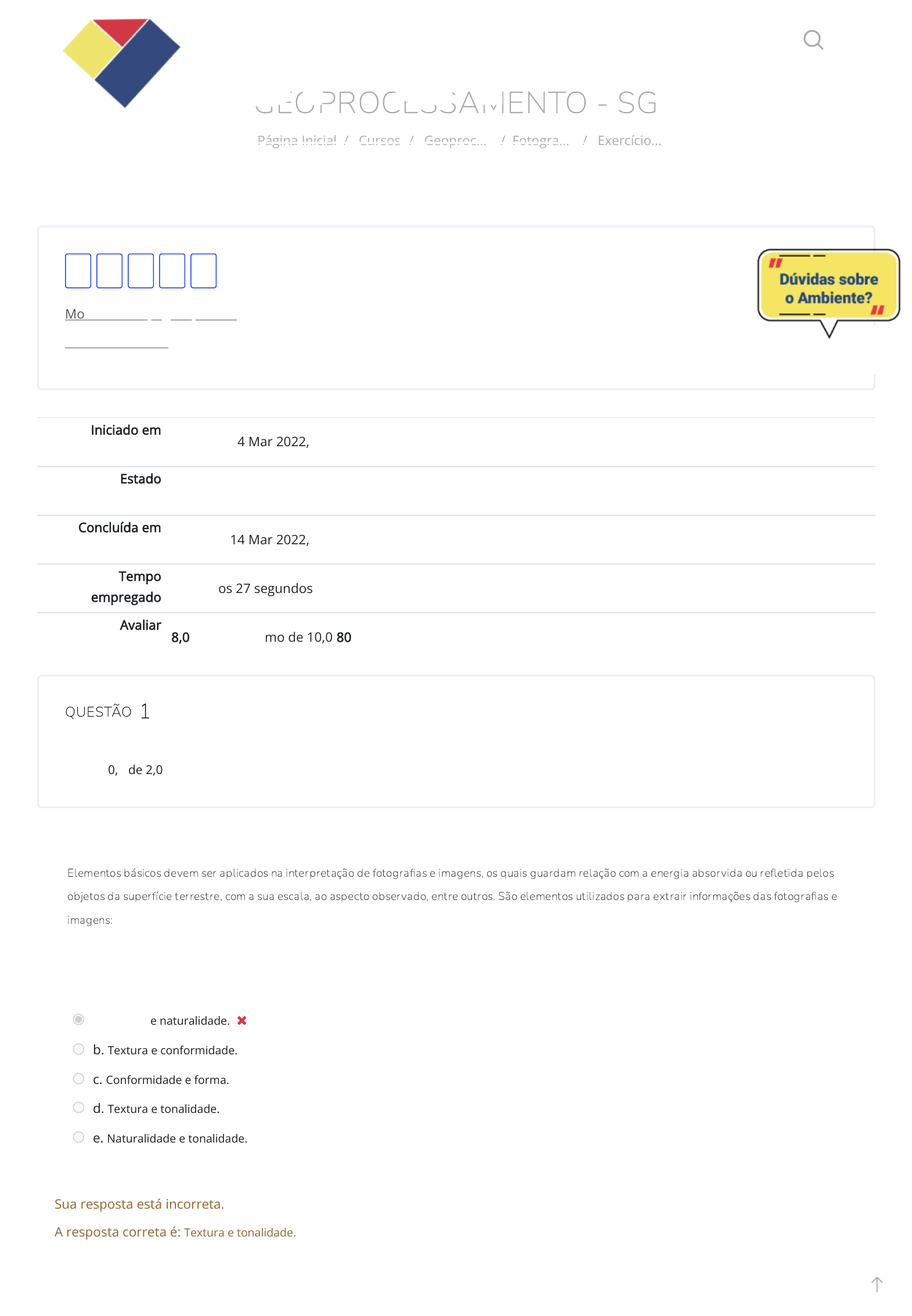 GEOPROCESSAMENTO - SG Página Inicial / Cursos / Geoproc… / Fotogra… / Exercício… Iniciado em segunda, 14 Mar 2022, 16:41 Estado Finalizada Concluída em segunda, 14 Mar 2022, 16:50 Tempo empregado 8 minutos 27 segundos Avaliar 8,0 de um máximo de 10,0(80%) QUESTÃO Incorreto Atingiu 0,0 de 2,0 Mostrar uma página por vez Terminar revisão 1 2 3 4 5 1 Elementos básicos devem ser aplicados na interpretação de fotogra�as e imagens, os quais guardam relação com a energia absorvida ou re�etida pelos objetos da superfície terrestre, com a sua escala, ao aspecto observado, entre outros. São elementos utilizados para extrair informações das fotogra�as e imagens: Escolha uma opção: a. Textura e naturalidade. b. Textura e conformidade. c. Conformidade e forma. d. Textura e tonalidade. e. Naturalidade e tonalidade. Sua resposta está incorreta. A resposta correta é: Textura e tonalidade. https://cpetead.com.br/ https://cpetead.com.br/course/index.php https://cpetead.com.br/course/view.php?id=2187 https://cpetead.com.br/mod/quiz/view.php?id=53446 https://cpetead.com.br/mod/quiz/review.php?attempt=2051672&cmid=53446&showall=0 https://cpetead.com.br/mod/quiz/view.php?id=53446 https://cpetead.com.br/ QUESTÃO Correto Atingiu 2,0 de 2,0 QUESTÃO Correto Atingiu 2,0 de 2,0 2 As habilidades são aprimoradas em cada repetição no exercício de interpretação das imagens, fazendo com que se identi�que com maior facilidade diferentes objetos no terreno a cada realização. Portanto, a prática proporciona maior experiência ao observador, sendo indicado que no começo dos trabalhos sejam utilizadas escalas com maior detalhe do terreno e em áreas que já se conheça. Para tanto, a determinação dos objetos na superfície terrestre é facilitada em: Escolha uma opção: a. pequenas escalas. b. médias escalas. c. grandes escalas. d. baixas escalas. e. altas escalas. Sua resposta está correta. A resposta correta é: grandes escalas. 3 A determinação da escala das fotogra�as aéreas é necessária para de�nir a área de recobrimento do terreno. Dessa forma, para uma fotogra�a aérea tomada a uma altura de 3.285 m, com uma objetiva normal de 219 mm, qual seria a escala correspondente? Escolha uma opção: a. 1:5.000. b. 1:500.000. c. 1:15.000. d. 1:15. e. 1:1.500. Sua resposta está correta. A resposta correta é: 1:15.000. QUESTÃO Correto Atingiu 2,0 de 2,0 4 A combinação de elementos utilizados na interpretação de fotogra�as e imagens forma as chaves de interpretação para determinados objetos. Observe a imagem a seguir: Com base na sistematização e no estabelecimento de chaves de interpretação, especialmente, considerando os padrões da imagem, pode-se identi�car os objetos A, B e C da imagem anterior, respectivamente, como: Escolha uma opção: a. Bairro popular, favela e condomínios de alto padrão. b. Condomínios de alto padrão, favela e bairro popular. c. Condomínios de alto padrão, bairro popular e favela. d. Favela, bairro popular e condomínios de alto padrão. e. Bairro popular, condomínios de alto padrão e favela. Sua resposta está correta. A resposta correta é: Bairro popular, favela e condomínios de alto padrão. http://lrq.sagah.com.br/uasdinamicas/uploads/layouts/927972853_1574713173e63bf7f0aab011656cb4e5d2a7bbdabbc14e1bd7.jpg QUESTÃO Correto Atingiu 2,0 de 2,0 5 O desenvolvimento da fotogrametria teve início no �nal do século XIX e foi se aprimorando ao longo das duas grandes guerras. Recentemente, teve seu impulso vinculado ao avanço tecnológico e à informática. Para atender aos seus objetivos, a fotogrametria está dividida em: Escolha uma opção: a. Métrica e interpretativa. b. Oblíqua e vertical. c. Vertical e métrica. d. Métrica e náutica. e. Interpretativa e vertical. Sua resposta está correta. A resposta correta é: Métrica e interpretativa. ◄ Conteúdo de Estudo - Fotogrametria e fotointerpretação Seguir para... Conteúdo de Estudo - Processamento digital de imagens: vantagens e limitações ► Quem somos Cursos Certi�cação Unidades Contato Copyright © 2021 CPET - Centro de Pro�ssionalização e Educação Técnica https://cpetead.com.br/mod/lti/view.php?id=53440&forceview=1 https://cpetead.com.br/mod/lti/view.php?id=53441&forceview=1 https://www.cpet.com.br/quem-somos-cpet-cursos-tecnicos-a-distancia-ead/ https://www.cpet.com.br/course-cat/cursos/cursos-online/ https://www.cpet.com.br/certificacao-cpet/ https://www.cpet.com.br/unidades-cpet/ https://www.cpet.com.br/contato/ https://www.facebook.com/CPET-Centro-de-Profissionaliza%C3%A7%C3%A3o-e-Educa%C3%A7%C3%A3o-T%C3%A9cnica-1039179026236475/ https://twitter.com/soucpet/ https://www.instagram.com/soucpet/