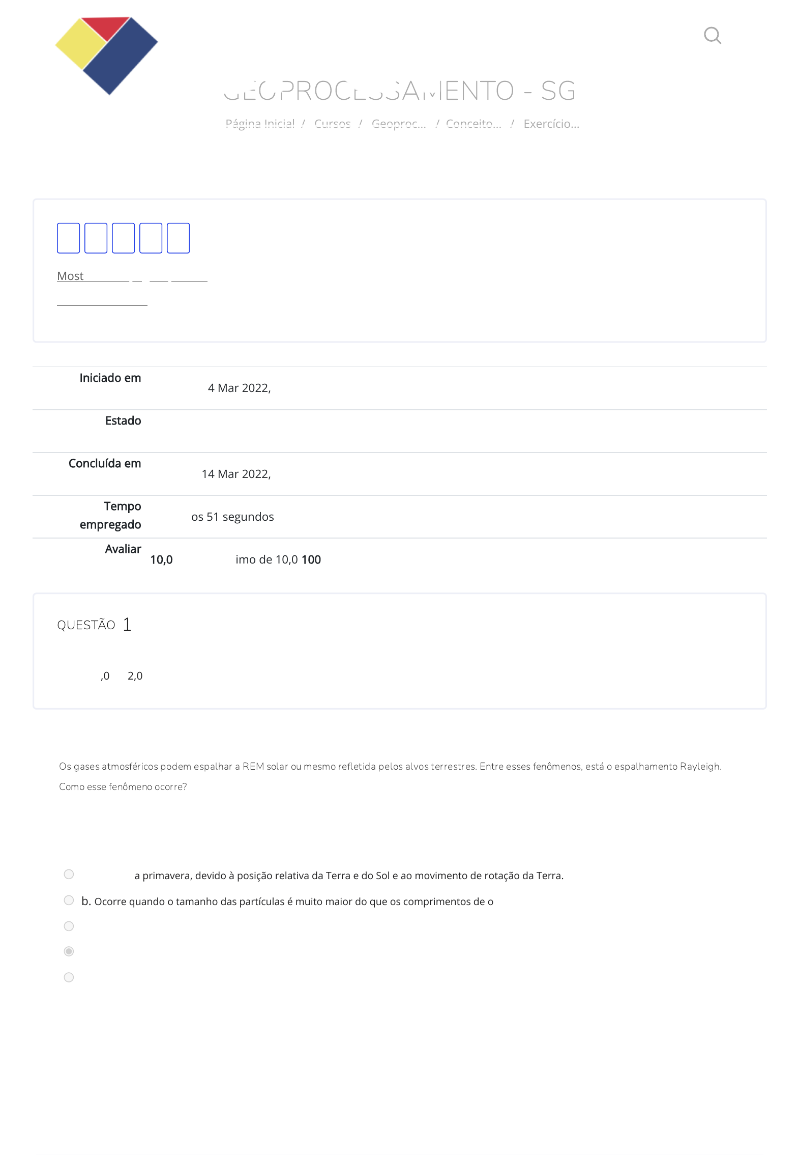 GEOPROCESSAMENTO - SG Página Inicial / Cursos / Geoproc… / Conceito… / Exercício… Iniciado em segunda, 14 Mar 2022, 15:52 Estado Finalizada Concluída em segunda, 14 Mar 2022, 15:57 Tempo empregado 4 minutos 51 segundos Avaliar 10,0 de um máximo de 10,0(100%) QUESTÃO Correto Atingiu 2,0 de 2,0 Mostrar uma página por vez Terminar revisão 1 2 3 4 5 1 Os gases atmosféricos podem espalhar a REM solar ou mesmo re�etida pelos alvos terrestres. Entre esses fenômenos, está o espalhamento Rayleigh. Como esse fenômeno ocorre? Escolha uma opção: a. Ocorre na primavera, devido à posição relativa da Terra e do Sol e ao movimento de rotação da Terra. b. Ocorre quando o tamanho das partículas é muito maior do que os comprimentos de onda entre o visível e termal. c. Ocorre quando o tamanho das partículas dos gases atmosféricos é maior do que o comprimento de onda. d. Ocorre quando o diâmetro das partículas dos gases atmosféricos é menor do que o comprimento de onda. e. Ocorre por causa do campo magnético da Terra que interage com a radiação eletromagnética. Sua resposta está correta. A resposta correta é: Ocorre quando o diâmetro das partículas dos gases atmosféricos é menor do que o comprimento de onda. https://cpetead.com.br/ https://cpetead.com.br/course/index.php https://cpetead.com.br/course/view.php?id=2187 https://cpetead.com.br/mod/quiz/view.php?id=53442 https://cpetead.com.br/mod/quiz/review.php?attempt=2051391&cmid=53442&showall=0 https://cpetead.com.br/mod/quiz/view.php?id=53442 https://cpetead.com.br/ QUESTÃO Correto Atingiu 2,0 de 2,0 QUESTÃO Correto Atingiu 2,0 de 2,0 2 O Sol, fonte de radiação eletromagnética (REM) em todo o Sistema Solar, apresenta irradiância espectral de acordo com o espectro de corpo negro a 5.250°C. Por que essa radiação solar apresenta diferente intensidade no topo da atmosfera e ao nível do mar? Escolha uma opção: a. Re�exão pela vegetação. b. Re�exão pelo mar. c. Interações atmosféricas. d. Re�exão pelo solo. e. Re�exão pelas rochas. Sua resposta está correta. A resposta correta é: Interações atmosféricas. 3 Sensores ativos e passivos podem ser utilizados em sensoriamento remoto para a obtenção de imagens de satélite. Assinale a opção que melhor descreve a diferença entre esses sensores: Escolha uma opção: a. Sensores ativos são sensores que se ativam (entram em funcionamento) quando iluminados pelo Sol, enquanto sensores passivos não precisam da radiação eletromagnética solar para estarem em funcionamento. b. Sensores ativos apresentam maior resolução temporal, �cando ativamente mais tempo sobre determinada posição. Sensores passivos apresentam baixa resolução temporal, e o tempo de revisita ao mesmo local é maior. c. Sensores ativos são aqueles que utilizam fontes arti�ciais para geração da radiação eletromagnética; sensores passivos utilizam a radiação eletromagnética proveniente do Sol. d. Sensores ativos são sensores que ainda se encontram em atividade, enquanto sensores passivos são aqueles que já foram desativados. e. Sensores ativos são aqueles que apresentam maior resolução espectral, enquanto sensores passivos apresentam menor resolução espectral. Sua resposta está correta. A resposta correta é: Sensores ativos são aqueles que utilizam fontes arti�ciais para geração da radiação eletromagnética; sensores passivos utilizam a radiação eletromagnética proveniente do Sol. QUESTÃO Correto Atingiu 2,0 de 2,0 QUESTÃO Correto Atingiu 2,0 de 2,0 4 Há sensores que detectam áreas unitárias inferiores a 1 metro e que apresentam meios para visualização estereoscópica 3D, muito úteis para levantamentos cadastrais multi�nalitários e urbanos e cartogra�a digital. Os interessados em monitoramento para o acompanhamento da evolução e de mudanças da paisagem podem recorrer aos sensores com alta taxa de revisita à área. Já os que se interessam em determinar a composição ou a constituição de minerais ou rochas podem recorrer aos sensores com um grande número de bandas espectrais. Em relação à imagem de satélite, como é de�nida a resolução atribuída ao tamanho do seu pixel? Escolha uma opção: a. Resolução espacial. b. Resolução espectral. c. Resolução temporal. d. Resolução radiométrica. e. Resolução pixelar. Sua resposta está correta. A resposta correta é: Resolução espacial. 5 O processamento de imagens de satélite envolve técnicas que podem proporcionar maior qualidade ao produto �nal que se deseja gerar. Contudo, antes de se iniciar o processamento propriamente dito, existem técnicas de pré-processamento que aumentam a qualidade das imagens e removem possíveis erros (ruídos, correção atmosférica, distorções geométricas). Quanto aos ruídos, assinale a alternativa que melhor de�ne esse erro na imagem de satélite: Escolha uma opção: a. Ruídos são barulhos ocasionados pela captura da imagem de satélite. b. Ruídos são erros sistemáticos presentes em todos os tipos de imagens de sensoriamento remoto. c. Ruídos são degradações que alteram radiometricamente a imagem por completo. d. Ruídos são erros aleatórios do valor digital dos pixels ou erros coerentes de linhas de pixels. e. Ruídos são desajustes da grade de pixels das imagens de satélite. Sua resposta está correta. A resposta correta é: Ruídos são erros aleatórios do valor digital dos pixels ou erros coerentes de linhas de pixels. ◄ Conteúdo de Estudo - Conceitos básicos de sensoriamento remoto e geoprocessamento Seguir para... Conteúdo de Estudo - Sistema de posicionamento global (GPS) ► Quem somos Cursos Certi�cação Unidades Contato Copyright © 2021 CPET - Centro de Pro�ssionalização e Educação Técnica https://cpetead.com.br/mod/lti/view.php?id=53433&forceview=1 https://cpetead.com.br/mod/lti/view.php?id=53436&forceview=1 https://www.cpet.com.br/quem-somos-cpet-cursos-tecnicos-a-dist
