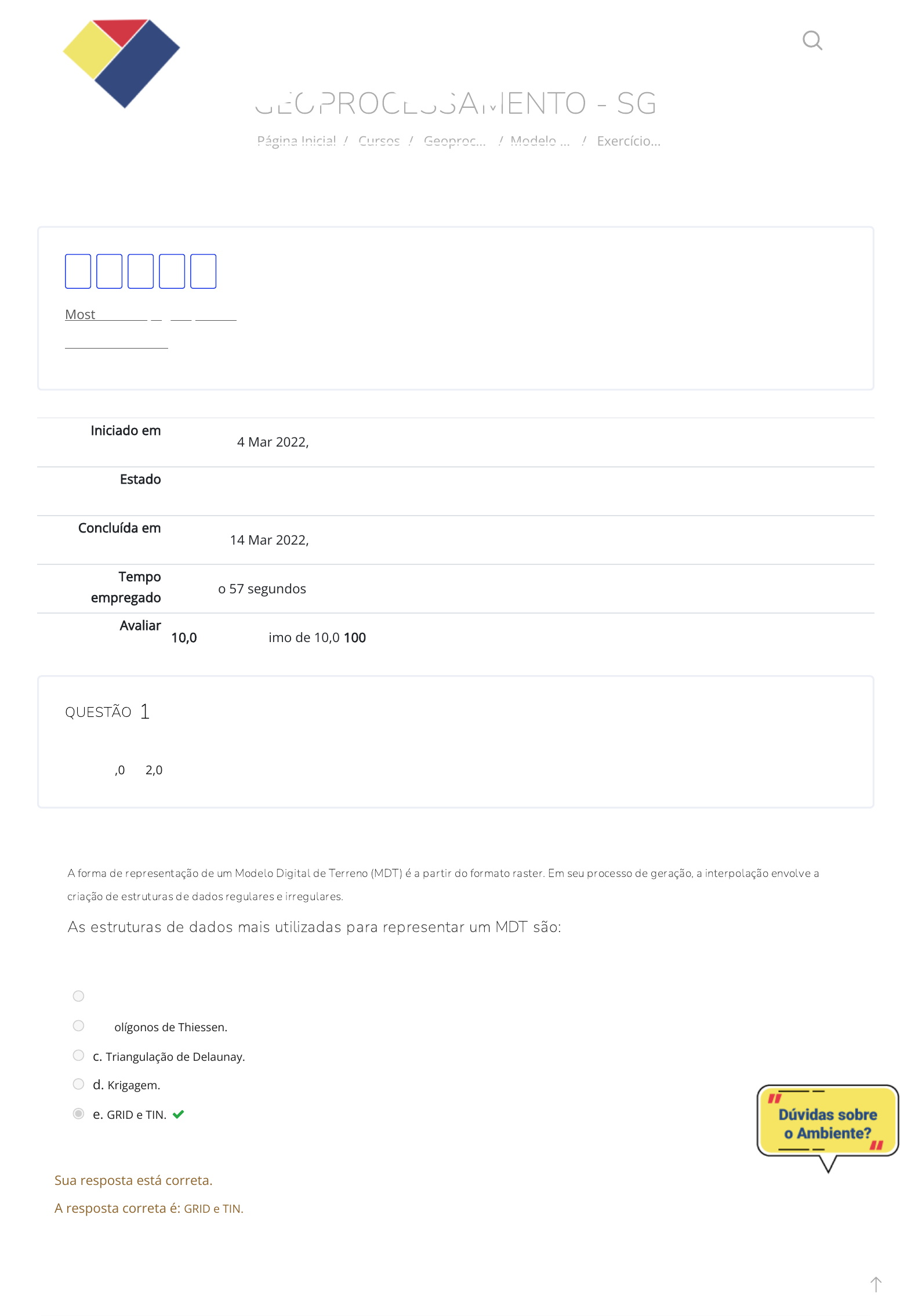 GEOPROCESSAMENTO - SG Página Inicial / Cursos / Geoproc… / Modelo … / Exercício… Iniciado em segunda, 14 Mar 2022, 16:38 Estado Finalizada Concluída em segunda, 14 Mar 2022, 16:40 Tempo empregado 1 minuto 57 segundos Avaliar 10,0 de um máximo de 10,0(100%) QUESTÃO Correto Atingiu 2,0 de 2,0 Mostrar uma página por vez Terminar revisão 1 2 3 4 5 1 A forma de representação de um Modelo Digital de Terreno (MDT) é a partir do formato raster. Em seu processo de geração, a interpolação envolve a criação de estruturas de dados regulares e irregulares. As estruturas de dados mais utilizadas para representar um MDT são: Escolha uma opção: a. SRTM b. Polígonos de Thiessen. c. Triangulação de Delaunay. d. Krigagem. e. GRID e TIN. Sua resposta está correta. A resposta correta é: GRID e TIN. https://cpetead.com.br/ https://cpetead.com.br/course/index.php https://cpetead.com.br/course/view.php?id=2187 https://cpetead.com.br/mod/quiz/view.php?id=53447 https://cpetead.com.br/mod/quiz/review.php?attempt=2051650&cmid=53447&showall=0 https://cpetead.com.br/mod/quiz/view.php?id=53447 https://cpetead.com.br/ QUESTÃO Correto Atingiu 2,0 de 2,0 QUESTÃO Correto Atingiu 2,0 de 2,0 2 Uma das funções do Modelo Digital de Terreno (MDT) é representar a modelagem do relevo para extração de dados morfométricos da superfície terrestre. É uma variável morfométrica possível de ser gerada com um MDT: Escolha uma opção: a. tipo de solo. b. inundações c. edi�cações d. áreas de risco. e. declividade Sua resposta está correta. A resposta correta é: declividade 3 A análise de fenômenos espaciais e a extração de novos dados e informações com a utilização de Modelos Digitais de Terreno (MDT) têm se tornado cada vez mais aprimoradas com os avanços da tecnologia e da informática, especialmente a partir de seu tratamento em ambiente do Sistema de Informações Geográ�cas (SIG). Um dos dados possível de aquisição a partir do MDT é: Escolha uma opção: a. a quantidade de habitantes. b. a delimitação de bacia hidrográ�ca. c. a quantidade dos equipamentos de saúde. d. a qualidade da água. e. o teor de minerais no solo. Sua resposta está correta. A resposta correta é: a delimitação de bacia hidrográ�ca. QUESTÃO Correto Atingiu 2,0 de 2,0 QUESTÃO Correto Atingiu 2,0 de 2,0 4 Existem diversas de�nições para Modelos Digitais de Elevação, mas alguns possuem características especí�cas quanto a sua forma de aquisição e registro de dados. Um dos modelos inclui em seus registros de terreno os elementos e objetos que estão acima do nível do solo. Esse modelo diz respeito ao: Escolha uma opção: a. MDE b. MDT c. SRTM d. MDS e. MNT Sua resposta está correta. A resposta correta é: MDS 5 Estão disponíveis alguns Modelos Digitais de Elevação globais, com o intuito de oferecer informações sobre o terreno do planeta. Um desses modelos pode ser obtido a partir de imagens de radar, que coletou informações topográ�cas de aproximadamente 80% dos continentes terrestres, com uma resolução espacial de 90 metros. De acordo com essas características, o Modelo Digital de Elevação a que se refere o texto é o: Escolha uma opção: a. TerrainBase. b. Shuttle Radar Topography Mission (SRTM). c. Globe d. ETOPO2v1 e. Topodata-Inpe. Sua resposta está correta. A resposta correta é: Shuttle Radar Topography Mission (SRTM). ◄ Conteúdo de Estudo - Modelo Digital do Terreno Seguir para... Conteúdo de Estudo - Fotogrametria e fotointerpretação ► https://cpetead.com.br/mod/lti/view.php?id=53439&forceview=1 https://cpetead.com.br/mod/lti/view.php?id=53440&forceview=1 Quem somos Cursos Certi�cação Unidades Contato Copyright © 2021 CPET - Centro de Pro�ssionalização e Educação Técnica https://www.cpet.com.br/quem-somos-cpet-cursos-tecnicos-a-distancia-ead/ https://www.cpet.com.br/course-cat/cursos/cursos-online/ https://www.cpet.com.br/certificacao-cpet/ https://www.cpet.com.br/unidades-cpet/ https://www.cpet.com.br/contato/ https://www.facebook.com/CPET-Centro-de-Profissionaliza%C3%A7%C3%A3o-e-Educa%C3%A7%C3%A3o-T%C3%A9cnica-1039179026236475/ https://twitter.com/soucpet/ https://www.instagram.com/soucpet/