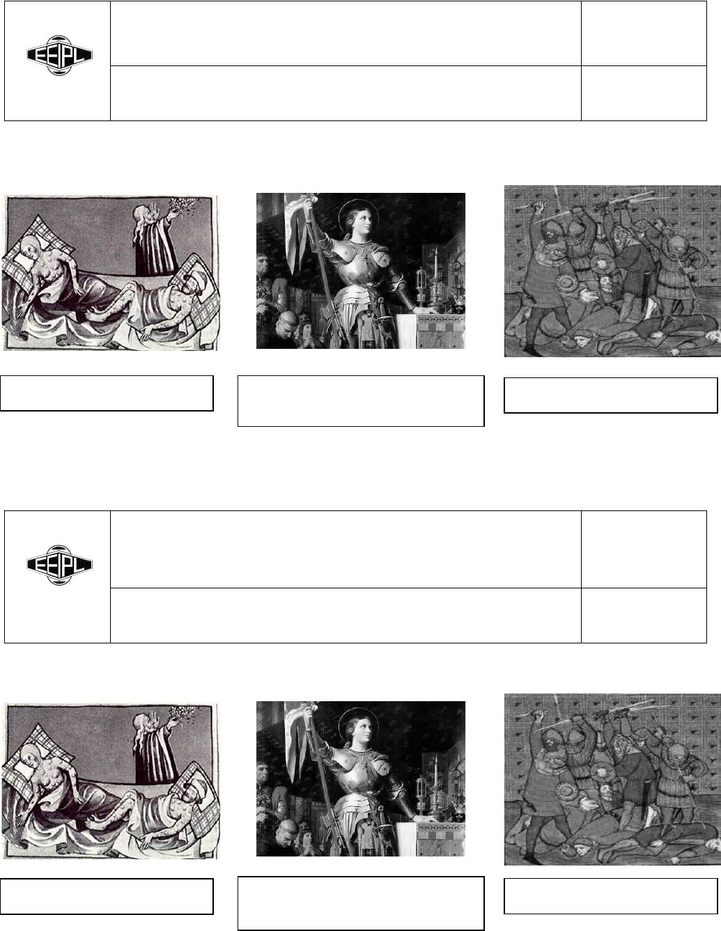 LISTA DE EXERCÍCIOS DE HISTÓRIA/ INDIVIDUAL 1º COLEGIAL ______ Professora: Elisângela M. Rodrigues Data: ____/05/2019 Valor: 2,25 pontos Aluno (a): ______________________________________________________________ Obteve: ________ 1. A partir da leitura das páginas 100 à 104, e utilizando as linhas abaixo, elabore seu resumo com informações sobre cada uma das figuras abaixo, que tem respectivamente os seguintes temas:, Guerra dos 100 anos (participação da Joana d’Arc) e Jacqueries. b) Guerra dos Cem anos (participação da Joana d’Arc): c) Jacqueries: a) Peste Negra: LISTA DE EXERCÍCIOS DE HISTÓRIA/ INDIVIDUAL 1º COLEGIAL ______ Professora: Elisângela M. Rodrigues Data: ____/05/2019 Valor: 2,25 pontos Aluno (a): ______________________________________________________________ Obteve: ________ 1. A partir da leitura das páginas 100 à 104, e utilizando as linhas abaixo, elabore seu resumo com informações sobre cada uma das figuras abaixo, que tem respectivamente os seguintes temas:, Guerra dos 100 anos (participação da Joana d’Arc) e Jacqueries. b) Guerra dos Cem anos (participação da Joana d’Arc): c) Jacqueries: a) Peste Negra: (UFLA) “Há um consenso entre os historiadores que a partir de meados da Baixa Idade Média, teria se iniciado o processo de crise do sistema feudal, então predominante na Europa Ocidental." São características da crise feudal, EXCETO: a) expansão predatória da exploração de terras, que teria contribuído para o desgaste de sua fertilidade; b) aumento do número de nobres e de suas necessidades de consumo, que teria aumentado consideravelmente o grau de exploração sobre a massa camponesa. c) intenso desmatamento, que teria gerado a alternância de períodos chuvosos e secos e alterações climáticas e ecológicas; d) constantes invasões de povos bárbaros na Europa, que teriam aumentado a partir do século V; (Mackenzie) "Entre os movimentos mais conhecidos da Idade Média estão as Cruzadas, que foram originalmente expedições organizadas pela Igreja, contando com o apoio dos dirigentes políticos das principais monarquias feudais". (Marco Antônio de Oliveira Pais) As Cruzadas no Ocidente tinham por objetivo: a) conquistar Jerusalém, organizar na região o sistema feudal e criar ordens monásticas como a dos Templários e dos Hospitalários. b) reconquistar os territórios sagrados do cristianismo na Palestina e reunificar o mundo cristão abalado com o Cisma do Ocidente. c) expulsar os muçulmanos da Península Ibérica, promover a expansão cristã nas terras eslavas e combater os hereges albigenses na França. d) libertar as cidades de Gênova e Veneza do domínio islâmico e expulsar os mouros da região de Flandres, reabrindo as rotas comerciais. (Fuvest) As feiras na Idade Média constituíram-se: a) instrumentos de comércio local das cidades para o abastecimento cotidiano dos seus habitantes. b) áreas exclusivas de câmbio das diversas moedas europeias. c) locais de comércio de amplitude continental que dinamizaram a economia da época. d) locais fixos de comercialização da produção dos feudos. (Cescem) As corporações de ofício eram organizadas com o objetivo de: a) defender os interesses dos artesãos diante dos patrões. b) proporcionar formação profissional aos jovens nobres. c) aplicar os princípios religiosos às atividades cotidianas. d) combater os senhores feudais. e) proteger os ofícios contra a concorrência e controlar a produção. (UFPA) O movimento das cruzadas foi essencial para o quadro das transformações por que a Europa passaria nos processos finais da Idade Média. Definida essa questão, é possível assegurar-se em relação ao movimento cruzadista que: a) os efeitos imediatos das cruzadas sobre a vida europeia foram de natureza política, já que contribuíram para abalar sensivelmente o poder absoluto dos monarcas europeus. b) em termos jurídicos, as cruzadas contribuíram para modificar o sistema da propriedade no feudalismo, já que difundiram o começo da propriedade dominante no Extremo Oriente. c) os seus resultados abalaram seriamente o prestígio do papado, provocando, inclusive, a separação entre a Igreja de Roma e a de Constantinopla, fato de implicações negativas para a autoridade clerical. d) os efeitos sociais das cruzadas fizeram-se sentir principalmente sobre as relações de trabalho, já que os cruzados, ao retornarem do Oriente, defendiam a substituição da servidão pelo trabalho livre. e) as exigências das expedições contribuíram decididamente para o recuo da dominação árabe no Mediterrâneo, abrindo os espaços para que as suas águas viessem a sustentar, mais tarde, parte das grandes rotas do comércio europeu. (UnB) No período medieval, a população enfrentou uma epidemia de extrema gravidade, a Peste Negra, a qual envolveu determinados aspectos, sobre isso marque a alternativa incorreta: a) A epidemia foi, em seu conjunto, mais acentuada nos meios urbanos do que nos campos, e menos nas montanhas do que nas planícies. b) O impacto da peste fez surgir um movimento de histeria coletiva que se propagou por toda a Europa. c) A morte tornou-se um dos temas prediletos de artistas e poetas. d) A epidemia não conseguiu afetar as relações familiares e sociais, estabelecendo-se no período laços profundos de solidariedade. (UFPB) A peste é, sem nenhuma dúvida, entre todas as calamidades desta vida, a mais cruel e verdadeiramente a mais atroz. É com grande razão que é chamada por apelido de o Mal. Pois não há sobre a terra nenhum mal que seja comparável e semelhante à peste. Desde que se acende num reino ou numa república esse fogo violento e impetuoso, vêem-se os magistrados atordoados, as populações apavoradas, o governo político desarticulado. A justiça não é mais obedecida; os ofícios param; as famílias perdem sua coerência e as ruas, sua animação. Tudo fica reduzido a uma extrema confusão. Tudo é ruína. Pois tudo é at