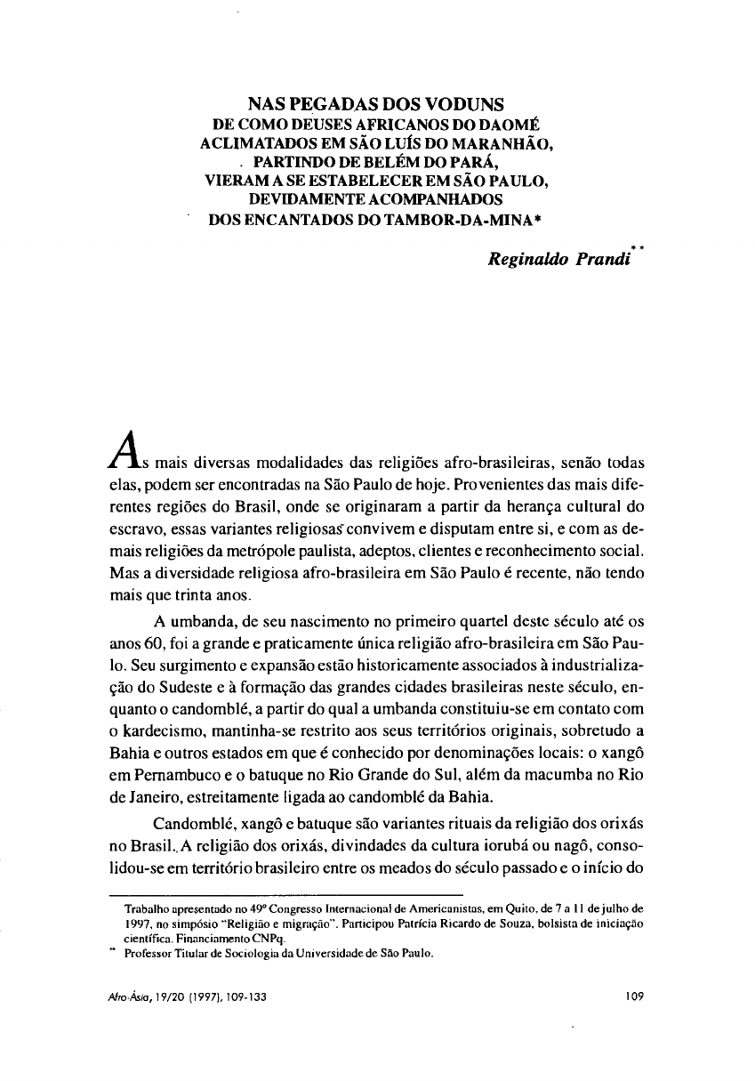 NAS PEGADAS DOS VODUNS DE COMO DEUSES AFRICANOS DO DAOMÉ ACLIMATADOS EM SÃO LUÍS DO MARANHÃO, . PARTINDO DE BELÉM DO PARA, VIERAM A SE ESTABELECER EM SÃO PAULO, DEVIDAMENTE ACOMPANHADOS DOS ENCANTADOS DO TAMBOR-DA-MINA* A s mais diversas modalidades das religiões afro-brasileiras, senão todas elas, podem ser encontradas na São Paulo de hoje. Provenientes das mais dife- rentes regiões do Brasil, onde se originaram a partir da herança cultural do escravo, essas variantes religiosas'convivem e disputam entre si, e com as de- mais religiões da metrópole paulista, adeptos, clientes e reconhecimento social. Mas a diversidade religiosa afro-brasileira em São Paulo é recente, não tendo mais que trinta anos. A umbanda, de seu nascimento no primeiro quartel deste século até os anos 60, foi a grande e praticamente única religião afro-brasileira em São Pau- lo. Seu surgimento e expansão estão historicamente associados à industrializa- ção do Sudeste e à formação das grandes cidades brasileiras neste século, en- quanto o candomblé, a partir do qual a umbanda constituiu-se em contato com o kardecismo, mantinha-se restrito aos seus territórios originais, sobretudo a Bahia e outros estados em que é conhecido por denominações locais: o xangô em Pemambuco e o batuque no Rio Grande do Sul, além da macumba no Rio de Janeiro, estreitamente ligada ao candomblé da Bahia. Candomblé. xangô e batuque são variantes rituais da religião dos orixás no Brasil.,A religião dos orixás, divindades da cultura iorubá ou nagô, conso- lidou-se em território brasileiro entre os meados do século passado e o início do Trabalho apresentado no 49" Congresso Internacional de Americanistas, em Quito. de 7 a I I de julho de 1997, no simpósio "Religião e migr;içio". Participou Patrícia Ricardo de Souza, bolsista de iniciação científica. Financiamento CNPq. " Professor Titular de Sociologia da Universidade de Siio Paulo. século atual como expressão cultural de escravos, negros livres e seus descen- dentes. A umbanda também cultua os orixás, mas seu panteão foi muito ampli- ado com entidades que são espíritos desencarnados, os chamados caboclos, pretos velhos, boiadeiros, baianos, marinheiros e outros. Nos anos 60, quando a umbanda já se consolidara em São Paulo, o can- domblé trazido por rnigrantes nordestinos foi sendo introduzido na cidade e se instalando rapidamente em seu novo território. Muitas casas de candomblé importantes de Salvador abriram filiais em São Paulo; líderes religiosos de origem baiana anteriormente estabelecidos no Rio de Janeiro mudaram-se ou passaram a permanecer em São Paulo parte do tempo. Não tardou muito para que a umbanda perdesse sua hegemonia como a religião afro-brasileira da me- trópole industrial. Assim como a umbanda, que já se formou como religião universal, o candomblé no Sudeste deixou de ter o caráter de religião exclusiva de uma população de afro-descendentes, religião étnica, para vir a ser uma religião aberta a todos, não importando a origem racial.' Além dos orixás, outras divindades foram trazidas da África pelos es- cravos. Os inquices dos povos bantos, praticamente esquecidos e substituídos pelos orixás nagôs nos candomblés bantos, e os voduns originários de povos euê-fom, da região do antigo Daomé, hoje república do Benim, designados jejes no Brasil. O culto aos voduns Sobreviveu na Bahia e no Maranhão. Em Salva- dor e cidades do Recôncavo, a religião dos voduns é denominada candomblé jeje-mahim. No Maranhão recebeu o nome de tambor-de-mina. Na Bahia é pequeno o número de grupos de culto jeje em comparação com o número de casas de orixá. No Maranhão os voduns estão presentes em praticamente todas as casas de culto afro-brasileiro e os orixás ali cultuados nas casas de vodum são igualmente chamados de voduns, às vezes com a referência de que se trata de um vodum nagô e não jeje. Os orixás tomaram-se bastante populares em São Paulo, como de resto em quase todo o Brasil, e sua popularidade pode ser medida por sua presença expressiva na cultura popular brasileira (incluindo literatura, teatro, cinema, telenovela, música popular, carnaval, ~ulinária)~, mas os voduns são pratica- mente desconhecidos nessa cidade, onde mesmo os adeptos de religiões afro- brasileiras pouco sabem desses deuses tão cultuados em São Luís. ' Reginaldo F'randi, Os cundomhlds de Süo Puulo: u velhu mugiu nu metrópole n o w , São Paulo. Hucitec e Edusp, 199 1 ; Reginaldo Prandi, "Raça e religião", in Prandi, Hrrdeirus do u d : sociologiu dus religi- ríes ufro-hrusileirus. (São Paulo. Hucitec. 1996). Reginaldo F'randi. "A expansáo da religiáo negra na sociedade branca: música popular brasileira e legitimação do candomblé". trabalho apresentado no X X Congresso Internacional da LASA. em Guada- lajara, México. 17 a 19 de abril de 1997. Em 1977, um jovem líder da religião dos voduns, Francelino Vasconce- los Ferreira, ou Francelino Xapanã, como prefere ser chamado, trouxe para São Paulo o culto dos voduns tal como se constituiu em São LU& do Maranhão. Vinte ano depois, a religião dos voduns conta com a casa já bem consolidada de Pai Francelino, a Casa das Minas de Tóia Jarina, e com vários terreiros dela derivados. A religião dos voduns assim vai se espalhando por São Paulo e, de São Paulo, para paragens mais além.? Voduns do Maranhão Em São Luís e outras cidades do Maranhão, a religião dos voduns recebeu o nome de tambor-de-mina: alusão à presença constante dos tambores nos rituais e aos escravos minas, como eram ali designados os negros sudaneses. Trata-se de religião iniciática e sacrificial, em que os sacerdotes são ritualmente preparados para "receber" as divindades em transe. As entidades manifestadas, que podem ser voduns ou encantados (espíritos), vêm à terra para dançar em cerimônias públicas denominadas tambor. As entidades são assentadas (fixad