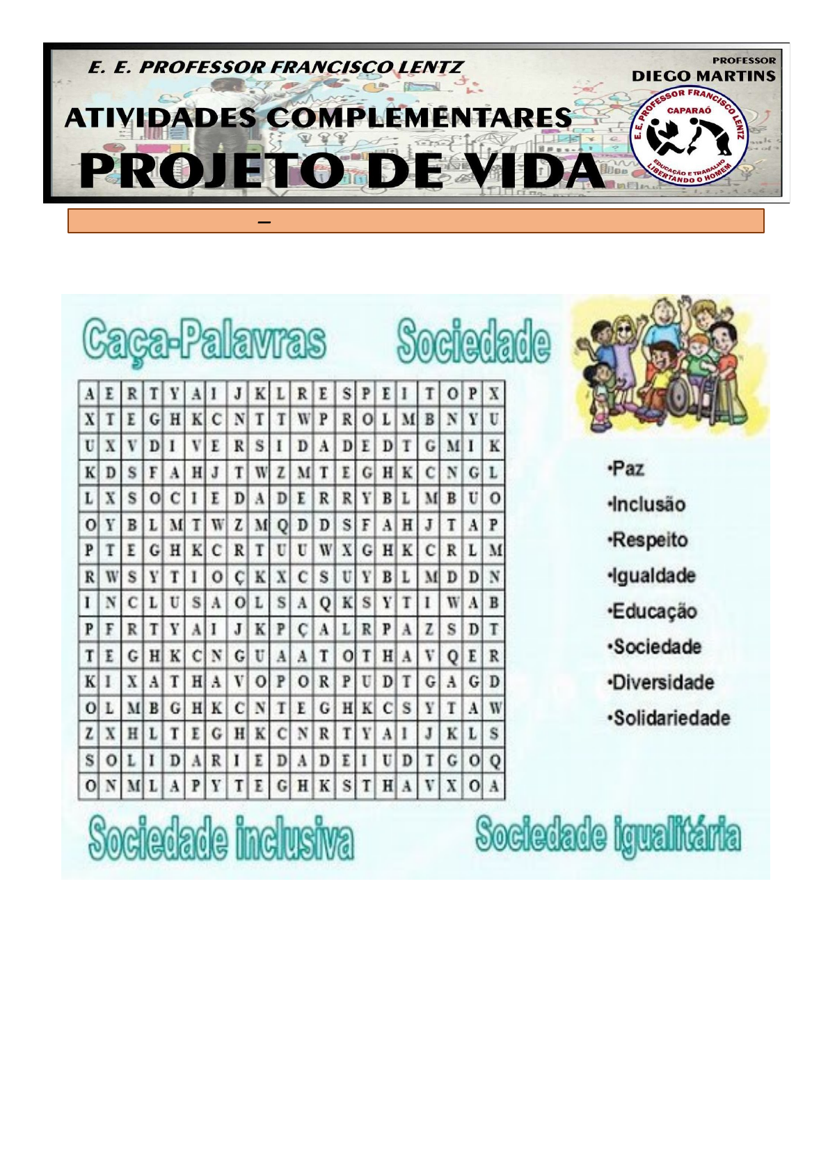 TEMPO INTEGRAL ENSINO FUND. - ATIVIDADE COMPLEMENTAR 1 1. REALIZE O CAÇA PALAVRAS ABAIXO: 2. ESCREVA UMA FRASE COM ALGUMAS DAS PALAVRAS DA ATIVIDADE ANTERIOR. ____________________________________________________________________________________________________________________________________________________________________________________________________________________________________________________________________________________________________________________ TEMPO INTEGRAL ENSINO FUND. - ATIVIDADE COMPLEMENTAR 2 1. RETRATE EM UM TEXTO ACIMA DE 7 LINHAS A IMAGEM ABAIXO: ________________________________________________________________________________________________________________________________________________________________________________________________________________________________________________________________________________________________________________________________________________________________________________________________________________________________________________________________________________________________________________________________________________________________________________________________________________________________________ ____________________________________________________________________________________________________________________________________________________________________________________________________________________________________________________________________________________________________________________ ____________________________________________________________________________________________________________________________________________________________________________________________________________________________________________________________________________________________________________________ TEMPO INTEGRAL ENSINO FUND. - ATIVIDADE COMPLEMENTAR 3 1. REALIZE UMA PESQUISA COM TRÊS PESSOAS DE SUA FAMÍLIA (PESSOAS DIREFENTES). PEÇA QUE ELES DÊEM O SIGNIFICADO DE CADA PALAVRA ABAIXO: NOME1:______________________________________________________________________ DIVERSIDADE:___________________________________________________________________________________________________________________________________________________________________________________________________________________________ NOME2:______________________________________________________________________ IGUALDADE:_____________________________________________________________________________________________________________________________________________________________________________________________________________________________ NOME3:______________________________________________________________________ RESPEITO:_______________________________________________________________________________________________________________________________________________________________________________________________________________________________ NOME4:______________________________________________________________________ AMOR:_________________________________________________________________________________________________________________________________________________________________________________________________________________________________ TEMPO INTEGRAL ENSINO FUND. - ATIVIDADE COMPLEMENTAR 4 1. CRIE UMA PEQUENA POESIA COM RIMAS, SOBRE O TEMA DIVERSIDADE E RESPEITO. LEMBRE-SE: OS FINAIS DAS FRASES DEVEM RIMAR, OU A PRIMEIRA COM A TERCEIRA, SEGUNDA COM QUARTA, OU PRIMEIRA COM SEGUNDA E TERCEIRA COM QUERTA. _________________________________________________________ _________________________________________________________ _________________________________________________________ _________________________________________________________ _________________________________________________________ _________________________________________________________ _________________________________________________________ _________________________________________________________ _________________________________________________________ _________________________________________________________ _________________________________________________________ _________________________________________________________