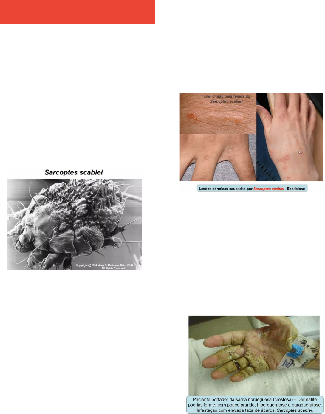 PEDICULOSE E ESCABIOSE ESCABIOSE É a conhecida sarna. É uma ectoparisitose muito comum, principalmente nos países tropicais por conta do clima, além da maioria ser subdesenvolvida, o que influencia na saúde pública. A sarna acontece muito mais nos animais do que nos humanos, mas ainda assim é bastante comum nos humanos, só é uma manifestação menos gritante em pessoas imunocompetentes. Sarnas de animais podem infectar os seres humanos, mas a maioria da variedade de sarnas de animais não consegue pegar o ser humano. A variedade do ser humano é a Sarcoptes scabiei hominis, que se instala na superfície da pele e causa todo um processo inflamatório, com consequências de infecções bacterianas associadas e pioras no caso de pacientes com sobrecarga imunológica/imunodeprimidos. Geralmente, as manifestações são leves, mas podem ser moderadas e graves em lugares com muita pobreza, carência de infraestrutura, locais como presídios, asilos e quarteis. A sarna ou escabiose é uma doença parasitária contagiosa da pele que ocorre em humanos e em animais (transmite por contato com a pele, compartilhar ambientes com pessoas infectadas). É causada por uma variedade de organismos (ácaros), alguns deles envolvidos na transmissão de agentes microbianos de doenças, outros responsáveis diretamente pela produção de dermatoses e alergias respiratórias. Os ácaros precisam do hospedeiro para sobreviver, então não conseguem ficar muito tempo “soltos”. Esse ectoparasitismo é restrito à pele, esses ácaros não aprofundam. É considerada uma dermatozoonose. A escabiose é uma doença de ampla distribuição geográfica, endêmica em regiões tropicais, causada pelo ácaro ectoparasito obrigatório Sarcoptes scabiei. As epidemias estão associadas a pessoas institucionalizadas em abrigos, quarteis, prisões, creches ou hospitais. Os pacientes imunossuprimidos podem apresentar as formas mais graves. Fatores que influencia infestação: pobreza, baixa higiene pessoal, má nutrição e promiscuidade sexual. Os ácaros são extremamente pequenos e arredondados, sendo a fêmea maior. Eles são do grupo dos carrapatos (primos), da subclasse Acari, subordem Sarcoptiformes, família Sarcoptidae (ácaros escavadores), gênero Sarcoptes, e variedades podem ser: hominis, suis e bovis. Esses ácaros perfuram a pele e formam galerias na superfície. A fêmea vai deixando rastros de ovos nessas galerias, e a família vai nascendo e crescendo nesse túnel feito pela fêmea. Conforme vão crescendo, os ácaros vão fazendo seus próprios túneis e problema vai aumentando. Isso causa a principal manifestação clínica da doença, que é o prurido. O Sarcoptes scabiei é o agente etiológico da escabiose ou sarna sarcóptica, uma doença contagiosa de homens e animais. Animais domésticos infectados podem transmitir para os humanos. Os ácaros adultos perfuram túneis ou galerias na epiderme, principalmente nas mãos, punhos, cotovelos, axilas e virilha. As fêmeas que já copularam penetram na epiderme e começam a fazer os túneis e vão deixando para trás um rastro de ovos. A transmissão é realizada pelo contato direto, até mesmo sexual. Pode ainda ocorrer por contato com animais infectados. Após a fecundação, o ácaro fêmea penetra na epiderme íntegra do hospedeiro e forma túneis, iniciando a postura dos ovos. De 2 a 3 ovos são liberados por dia, originando as ninfas. Esses ácaros não sobrevivem menos de 3 dias longe da pele do hospedeiro. Áreas mais afetadas: região interdigital, região genital, cotovelos, joelhos e região anterior das axilas e tronco. O ácaro condicionado na epiderme apresenta um infiltrado inflamatório ao seu redor, constituído de eosinófilos, linfócitos e macrófagos. Sintomas: intenso prurido após uma semana ou mais do contágio. As lesões são caracterizadas por pápulas, escoriações, vesículas e pústulas. Pode ocorrer associação com infecções bacterianas secundárias causadas por Estafilococos aureus. ATENÇÃO: a presença de escabiose pode indicar maus tratos de crianças, adolescentes e idosos! Vale salientar que o aspecto psicológico influencia muito na evolução da doença. Pessoas deprimidas tendem a apresentar um quadro mais grave. Diagnóstico: clínico e epidemiológico. A confirmação se dá por diagnóstico laboratorial por meio de uma fita gomada e raspagem direta da área infectada para observação em microscópio óptico. A profilaxia é feita por desinfestação de roupas e lençóis e tratamento precoce de pacientes e familiares, se necessário. O tratamento pode ser tópico, como permetrina a 5% (creme), benzoato de benzila a 10-25% (aplicado na pele e repetido 1 semana após) e enxofre em petrolatum. Esses medicamentes têm muita ação contra adultos e ninfas, mas não atingem larvas dentro dos ovos. O tratamento sistêmico é feito com ivermectina em dose única, mas também pode ser necessário usar ATBs para tratar infecções secundárias. O tratamento sistêmico é feito em casos de infecção ampla, com muitas áreas afetadas. O uso de anti-histamínicos é recomendado para controlar o prurido intenso. PEDICULOSE São os famigerados piolhos. São ectoparasitas que apresentam uma especificidade para seus hospedeiros, ou seja, piolho de ser humano só infecta seres humanos. Os piolhos são da ordem Anoplura, que são insetos ápteros (não voam), de corpo achatado dorsoventralmente e hematófagos. São sensíveis a queda de temperatura, não sobrevivendo muito tempo fora do hospedeiro. As populações mais periféricas tendem a ser mais acometidas por esse parasito, e algumas vezes acontecem complicações graves e até mesmo morte causadas pelo piolho. Principais espécies: 1. Pediculus capitis: é o piolho da cabeça, parasita do homem. Causador de pediculose, caracteriza-se por prurido intenso, irritação do couro cabeludo, infecções bacterianas secundárias e queda de cabelo. Os fatores responsáveis