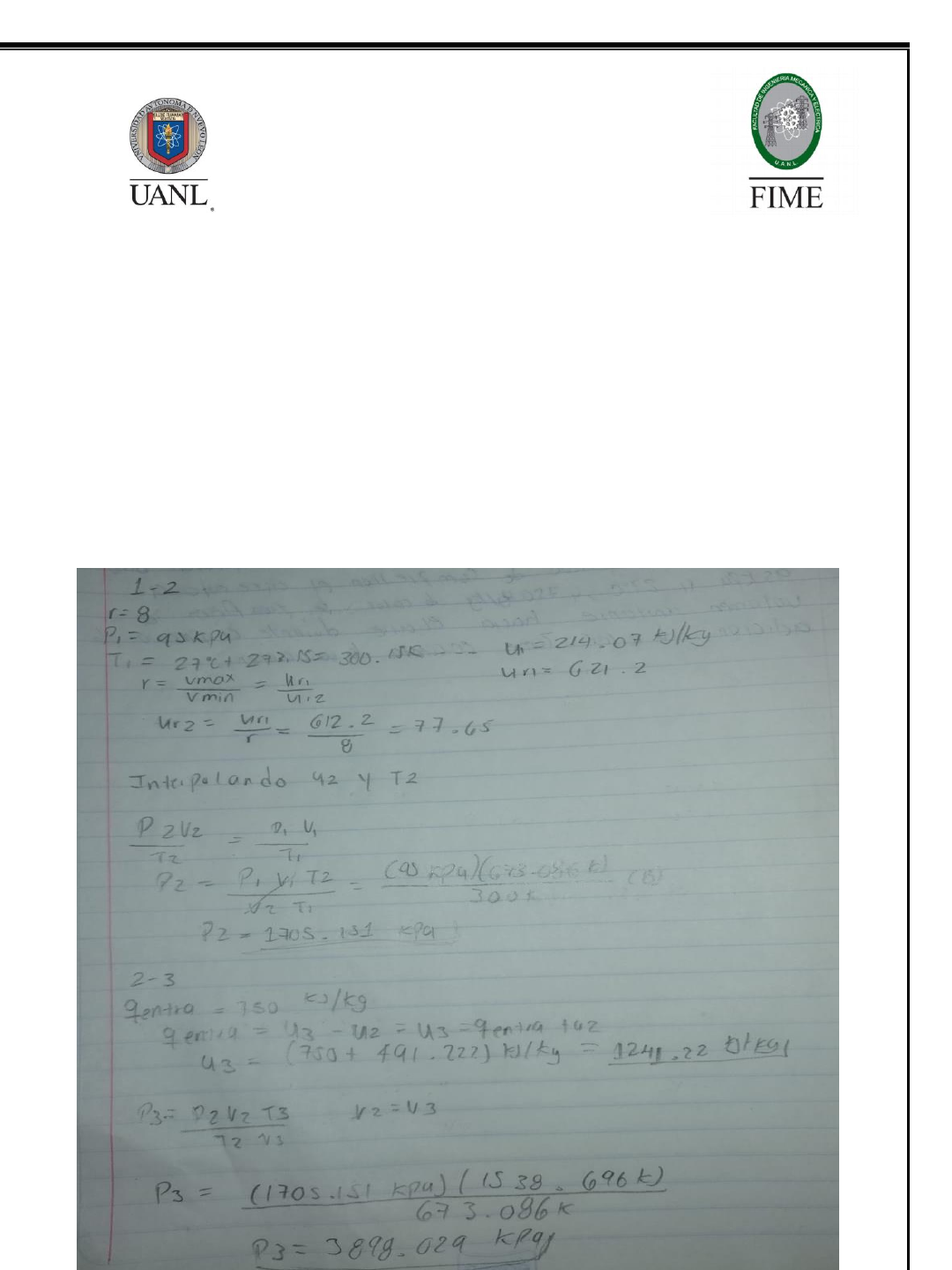 1.- Un Ciclo de Otto ideal tiene una relación de compresión de 8. Al inicio del proceso de compresión el aire está a 95 kPa y 27°C, y 750 KJ/Kg de calor se transfieren a volumen constante hacia el aire durante el proceso de adición de calor. Tome en cuenta la variación de calores específicos del aire con la temperatura y calcule: a) La temperatura y presión máximas que ocurren durante el ciclo. b) La eficiencia térmica. c) La presión media efectiva en el ciclo. A3 Ciclos Termodinámicos Nombre:Nestor Jair Manuel Pozos Ciclo de Diesel 2.- Un ciclo Diesel de aire estándar tiene la relación de compresión de 16 y una relación de corte de 2. Al principio del proceso de compresión, el aire está a 95 kPa y 27°C. Tome en cuenta la variación de los calores específicos con la temperatura y determine: a) La temperatura después del proceso de adición de calor. b) La eficiencia térmica. c) La presión media efectiva. Ciclo Rankine 3.- Considere una planta de energía de vapor de 210 MW que opera en un ciclo Rankine ideal sencillo. El vapor entra a la turbina a 10 MPa y 500°C y se enfría en el condensador a una presión de 10 KPa. Muestre el ciclo en un diagrama T-s respecto de las líneas de saturación y determine: a) La calidad del vapor a la salida. b) La eficiencia térmica del ciclo. c) La tasa de flujo másico de vapor. Ciclo de Refrigeración 4.- Un refrigerador usa refrigerante 134ª como fluido de trabajo y opera en el ciclo ideal de refrigeración por compresión de vapor. El refrigerante entra al evaporador a 120 kPa con una calidad de 34% y sale del compresor a 70°C. Si el compresor consume 450 W de potencia, calcule: a) El flujo másico del refrigerante. b) La presión del condensador. c) El COP del refrigerador.