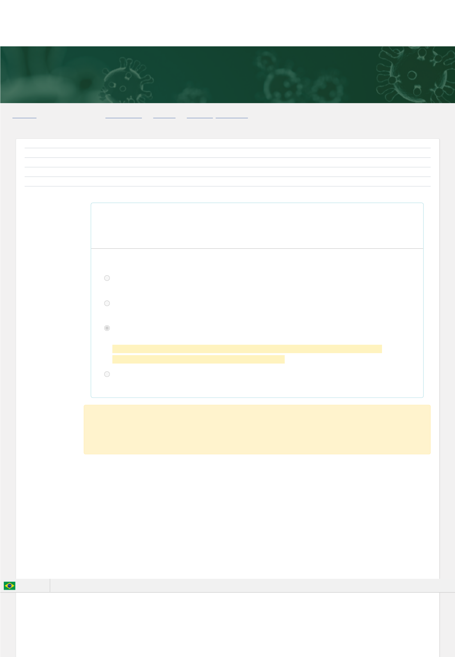 PAINEL MEUS CURSOS MÓDULO 2 GERAL AVALIAÇÃO FINAL Enfrentamento da COVID-19 e demais doenças virais Questão 1 Correto Atingiu 8,34 de 8,34 Iniciado em sexta, 18 Mar 2022, 17:26 Estado Finalizada Concluída em sexta, 18 Mar 2022, 17:47 Tempo empregado 20 minutos 49 segundos Avaliar 100,00 de um máximo de 100,00 A estratégia de vacinação contra a influenza foi incorporada no Programa Nacional de Imunizações (PNI) em 1999, com o propósito de reduzir internações, complicações e óbitos na população-alvo. Com relação à vacinação contra influenza, assinale a opção INCORRETA: Escolha uma opção: a. O Ministério da Saúde realiza anualmente a vacinação contra influenza em função da grande capacidade de mutações que ocorrem naturalmente no vírus influenza. b. A vacina contra influenza oferecida na rede pública é trivalente, sendo capaz de proteger contra três tipos de influenza: dois subtipos do vírus influenza A e uma linhagem da influenza B. c. Nas últimas décadas, a imunização anual com vacinas atenuadas contra influenza tem sido a principal medida para a profilaxia da gripe e redução da morbimortalidade relacionada à doença. A afirmativa está incorreta pois as vacinas disponíveis atualmente contra a influenza são constituídas por vírus vivos inativados e não atenuados. d. A vacina contra influenza é considerada segura e reduz o risco de aparecimento de complicações que podem levar ao agravamento do quadro clínico, internações ou, até mesmo, óbitos. Sua resposta está correta. A resposta correta é: Nas últimas décadas, a imunização anual com vacinas atenuadas contra influenza tem sido a principal medida para a profilaxia da gripe e redução da morbimortalidade relacionada à doença. BRASIL Acesso à informação https://moodle2.fiocruz-ms.unasus.gov.br/cursos38/my/ https://moodle2.fiocruz-ms.unasus.gov.br/cursos38/course/view.php?id=9 https://moodle2.fiocruz-ms.unasus.gov.br/cursos38/course/view.php?id=9#section-0 https://moodle2.fiocruz-ms.unasus.gov.br/cursos38/mod/quiz/view.php?id=22 http://brasil.gov.br/ http://brasil.gov.br/barra#acesso-informacao Questão 2 Correto Atingiu 8,34 de 8,34 Para promover um atendimento aos casos de sintomáticos respiratórios adequados, de forma a prevenir a transmissão da COVID-19, os serviços de assistência à saúde devem priorizar a identificação precoce e medidas de controle de infecção. Os principais pontos a serem trabalhados incluem: Escolha uma opção: a. Triagem de pacientes externos, monitoramento de pacientes internados, triagem nas portas de entrada do serviço, fluxo de notificação de casos, planejamento de ações educativas com frequência e estabelecimento de indicadores de monitoramento, preenchimento de notificações em papel e arquivamento das mesmas. b. Triagem de pacientes externos, monitoramento de pacientes internados, triagem nas portas de entrada do serviço, estratégia para identificação de casos e contatos dentre os funcionários, fluxo de notificação de casos, planejamento de ações educativas com frequência e estabelecimento de indicadores de monitoramento. Estão apontados os principais pontos a serem trabalhados para o atendimento adequado e identificação precoce de sintomáticos respiratórios. c. Triagem de pacientes na porta de entrada do serviço, monitoramento de pacientes internados, estratégia para identificação de casos e contatos dentre os funcionários, fluxo de notificação de casos, planejamento de reuniões com equipe para socialização entre os trabalhadores e melhoria da saúde mental. d. Triagem de pacientes externos, monitoramento de pacientes internados, triagem nas portas de entrada do serviço (visitantes, acompanhantes), estratégia para identificação de casos e contatos dentre os funcionários (vigilância passiva e ativa), fluxo de notificação de casos, estabelecimento de indicadores e de medidas punitivas aos trabalhadores que não realizarem os procedimentos adequados. Sua resposta está correta. A resposta correta é: Triagem de pacientes externos, monitoramento de pacientes internados, triagem nas portas de entrada do serviço, estratégia para identificação de casos e contatos dentre os funcionários, fluxo de notificação de casos, planejamento de ações educativas com frequência e estabelecimento de indicadores de monitoramento. BRASIL Acesso à informação http://brasil.gov.br/ http://brasil.gov.br/barra#acesso-informacao Questão 3 Correto Atingiu 8,34 de 8,34 Os vírus dos gêneros Rubivirus, Paramyxovirus, Morbillivirus e Varicellovirus são agentes causadores de doenças altamente contagiosas: rubéola, caxumba, sarampo e varicela, respectivamente. Sobre as formas de prevenção contra essas doenças, analise as afirmações a seguir: 1. A vacina tríplice viral faz parte do calendário nacional de vacinação e é administrada a partir dos 12 meses para proteger contra sarampo, caxumba e rubéola. 2. As vacinas tríplice viral e tetraviral são indicadas para pacientes grávidas, pois são vacinas do vírus atenuado. 3. A melhor maneira de prevenir a varicela é com a vacina tetraviral, fornecida na rotina brasileira de vacinação de crianças entre 15 meses e 2 anos de idade que já tenham sido vacinadas com a tríplice viral. Sobre essas afirmações, é correto afirmar que: Escolha uma opção: a. Apenas a afirmação 2 está correta. b. Apenas as afirmações 1 e 3 estão corretas. Muito bem, estas afirmações são verdadeiras. Vale destacar que as vacinas tríplice viral e tetraviral são contraindicadas em gestantes devido a sua composição, que inclui vírus vivo atenuado. c. As afirmações 1, 2 e 3 estão corretas. d. Apenas as afirmações 2 e 3 estão corretas. Sua resposta está correta. A resposta correta é: Apenas as afirmações 1 e 3 estão corretas. BRASIL Acesso à informação http://brasil.gov.br/ http://brasil.gov.br/barra#acesso-informacao Questão 4 Correto Atingiu