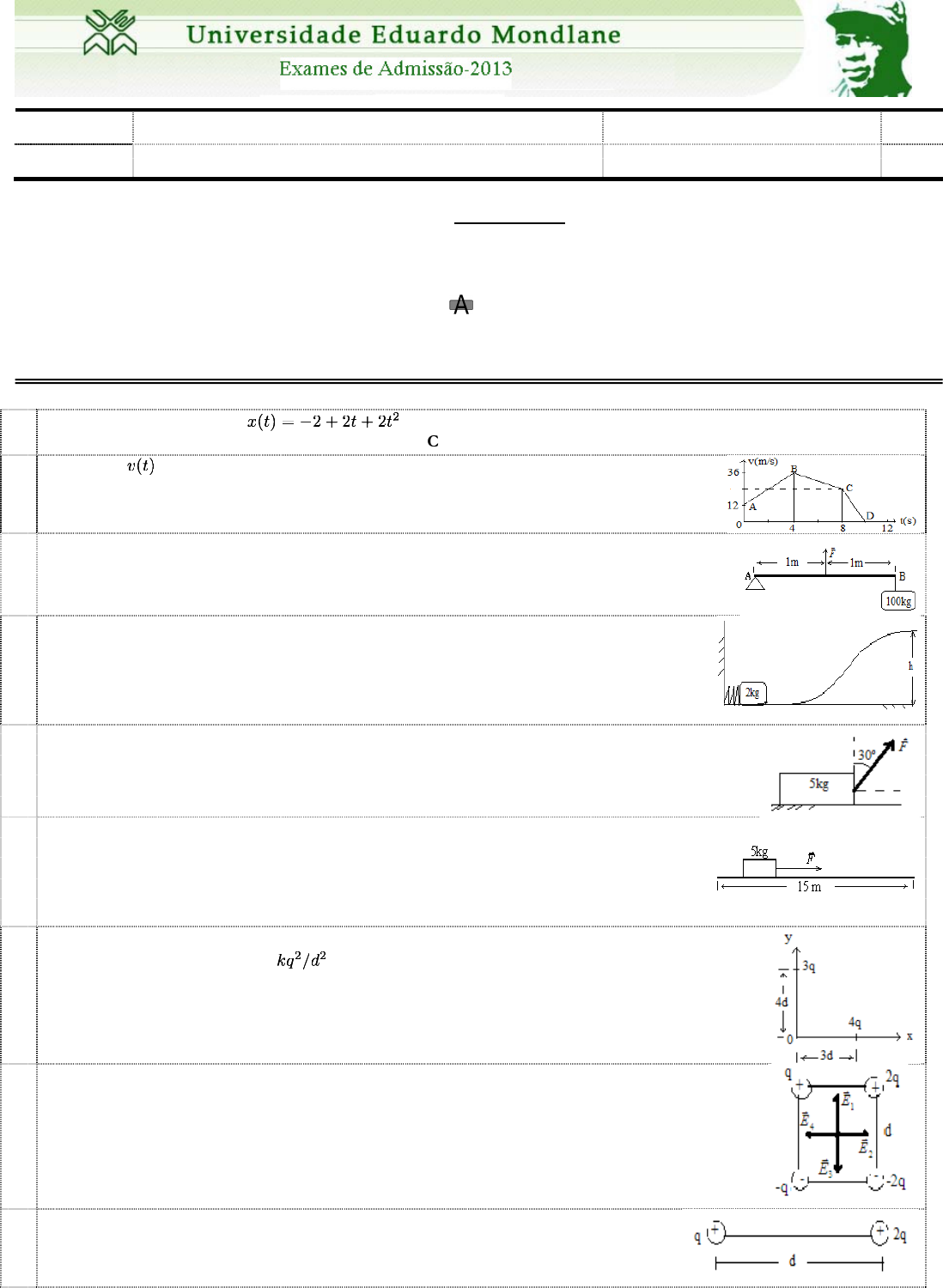 Exame: Física Nº Questões: 53 Duração: 120 minutos Alternativas por questão: 5 INSTRUÇÕES 1. Preencha as suas respostas na FOLHA DE RESPOSTAS que lhe foi fornecida no início desta prova. Não será aceite qualquer outra folha adicional, incluindo este enunciado. 2. Na FOLHA DE RESPOSTAS, assinale a letra que corresponde à alternativa escolhida pintando completamente o interior do rectângulo por cima da letra. Por exemplo, pinte assim , se a resposta escolhida for A 3. A máquina de leitura óptica anula todas as questões com mais de uma resposta e/ou com borrões. Para evitar isto, preencha primeiro à lápis HB, e só depois, quando tiver certeza das respostas, à esferográfica. 1 Na equação de movimento , em unidades do SI. Pode-se afirmar que: A. x0=-2 e a=2 B. v0=2 e a=2 C. x0=-2 e v0 =4 D. x0=2 e a=4 E. v0=2 e a=4 2 O gráfico da figura, mostra o movimento variado de uma partícula, o módulo da aceleração é maior no troço: A. [AB] B. [BC] C. [CD] D. [AC] E. [BD] 3 A barra AB da figura é rija e homogénea com a massa de 30Kg. A força F r usada para equilibrar o sistema tem o módulo de: A. 2300N B. 2000N C. 1300N D. 200N E. 130N 4 Uma mola de constante elástica 2000N/m é comprimida em 10cm junto a uma parede. Um corpo de 2kg de massa é colocado no extremo da mola como mostra a figura. A altura h atingida pelo corpo deve ser igual a: A. 0,5 m B. 1 m C. 5 m D. 0,10 m E. 0,20 m 5 Uma força de 60 N actua sobre um corpo de 5 kg, como é mostrado na figura. Entre o corpo e a superfície o atrito é despresível e o corpo desliza 20 m em 5 s. O trabalho realizado pela força para deslocar o corpo foi de: A. 60 J B. 120 J C. 600 J D. 1200 J E. – 600J 6 Uma força de 50N actua sobre um corpo de 5Kg, como é mostrado na figura. Entre o corpo e a superfície o atrito é despresível e o corpo desliza 15m em 3s. A potência empregue para deslocar o corpo foi de: A. 25 W B. 50 W C. 100 W D. 200 W E. 250W 7 Duas cargas positivas 3q e 4q estão colocadas como mostra a figura. A força de interacção eléctrica entre as cargas é igual , com o coeficiente numérico: A. 12/9 B. 12/16 C. 12/25 D. 9/12 E. 25/12 8 Nos vértices de um quadrado de lado d foram colocadas cargas eléctricas como mostra a figura. No centro do quadrado, o vector do campo eléctrico resultante é igual a: A. 1 E r B. 2 E r C. 3 E r D. 4 E r E. 0 9 As duas cargas mostradas na figura estão separadas por uma distância d no vácuo. A que distância da carga 2q o potencial eléctrico de ambas cargas é igual? A. (2/3)d B. (1/3)d C. ( ½)d D. ( ¼)d E. (3/4)d QWEMBO Highlight Exame de Admissão de Física - 2013 Página 2 de 4 10 Três cargas eléctricas, estão dispostas como se mostra na figura. A intensidade do campo eléctrico resultante no ponto P, tem o valor de: A. 2 dkq B. 2 2 dkq C. 2 4 dkq D. 2 2 dkq− E. 0 11 Das curvas apresentadas na figura, qual delas representa o gráfico do campo eléctrico criado por uma carga Q em função da distância r? A. Curva 1 B. Curva 2 C. Curva 3 D. Curva 4 E. Curva 5 12 Uma carga eléctrica tem o valor de +6,4.10-16C. O número de protões em excesso existentes na carga é: A. 4 B. 40 C. 400 D. 4000 E. 2000 13 Uma carga eléctrica é lançada perpendicularmente num campo eléctrico uniforme de intensidade 0,05T, com velocidade de 6000 m/s. A força magnética que actua sobre a carga é de 0,03 N. O valor dessa carga eléctrica é de: A. 0,10 C B. 0,010 C C. 0,0010 C D. 0,00010 C E. 0,00001C 14 Uma carga eléctrica positiva de 3.10-6C é lançada perpendicularmente num campo magnético uniforme como se mostra na figura, com velocidade de 50000 m/s. A força magnética que actua sobre a carga é de 6.10-3 N. O campo magnético tem a intensidade de: A. 0,004 T B. 0,04 T C. 0,4 T D. 0,02 T E. 0,2 T 15 A diferença de potencial eléctrico entre os pontos A e B da figura ao lado é de 12V. A corrente que flui entre os dois pontos é de 3A. Sendo assim a resistência tem o valor de: A. 0Ω B. 1Ω C. 2Ω D. 3Ω E. 4Ω 16 A temperatura na superfície de uma certa estrela é de cerca de 5800K e sabe-se que para esse tipo de estrelas a constante de Wien é aproximada a 2,9.10-3 mK. Então o comprimento de onda máximo da radiação emitida por essa estrela é de: A. 0,5 µm B. 5 µm C. 2 µm D. 20 µm E. 50 µm 17 Uma estrela emite radiação de intensidade máxima no comprimento de onda 580 nm. A contante de Wien é de 2,9.10- 3mK. A temperatura na superfície dessa estrela é igual a: A. 200K B. 500K C. 2000K D. 5000K E. 5500K 18 Um feixe luminoso monocromático paralelo cujos fotões possuem energia de 4,11 eV, incide num fotocátodo cuja função trabalho é de 3,20 eV. A energia cinética máxima dos electrões que são arrancados no fotocátodo é de: A. 7,31 eV B. 4,11 eV C. 3,20 eV D. 0,91 eV E. 0,81 eV 19 Na reacção de fissão ( ) ( ) QebnaZYnX ++++→+ − 0 1 1 0 139 57 95 42 1 0 235 92 , os coeficientes a e b, são respectivamente: A. 3 e 7 B. 7 e 3 C. 2 e 7 D. 3 e 2 E. 7 e 2 20 Na reacção nuclear QnXTD +++→+ 1 0 4 2 3 1 2 1 , a partícula X representa um: A. Deutrão B. Electrão C. Núcleo de He D. Protão E. Neutrino 21 A densidade do óleo é 0,80 g/cm3, a do gelo é 0,92 g/cm3 e a da água é 1,0 g/cm3, por isso: A. O gelo afunda na água B. O óleo afunda no gelo C. O óleo afunda na água D. O gelo afunda no óleo E. A água flutua no óleo 22 Um corpo cuja densidade é de 1,5 g/cm3 é mergulhado num copo contendo 25cm3 de água cuja densidade é de 1,0g/cm3. Sendo 5cm3 o volume do corpo, pode-se afirmar que a força de impulsão que ele sofre dentro da água é de: A. 0,05N B. 0,25N C. 0,5N D. 0,75N E. 5N 23 A figura mostra parte de uma tubagem onde flui água de S1 a S2. A área da secção transversal S1 é 4 vezes maior que a área da secção transversal S2. A razão entre a velocidade v2 e v1 é igual a: A. 1/4 B. 1/2 C. 2 D. 4 E. 8 24 Um gás perfeito sofreu uma transformação isovolumétrica. Quando a pressão era de 5.103Pa, sua temp