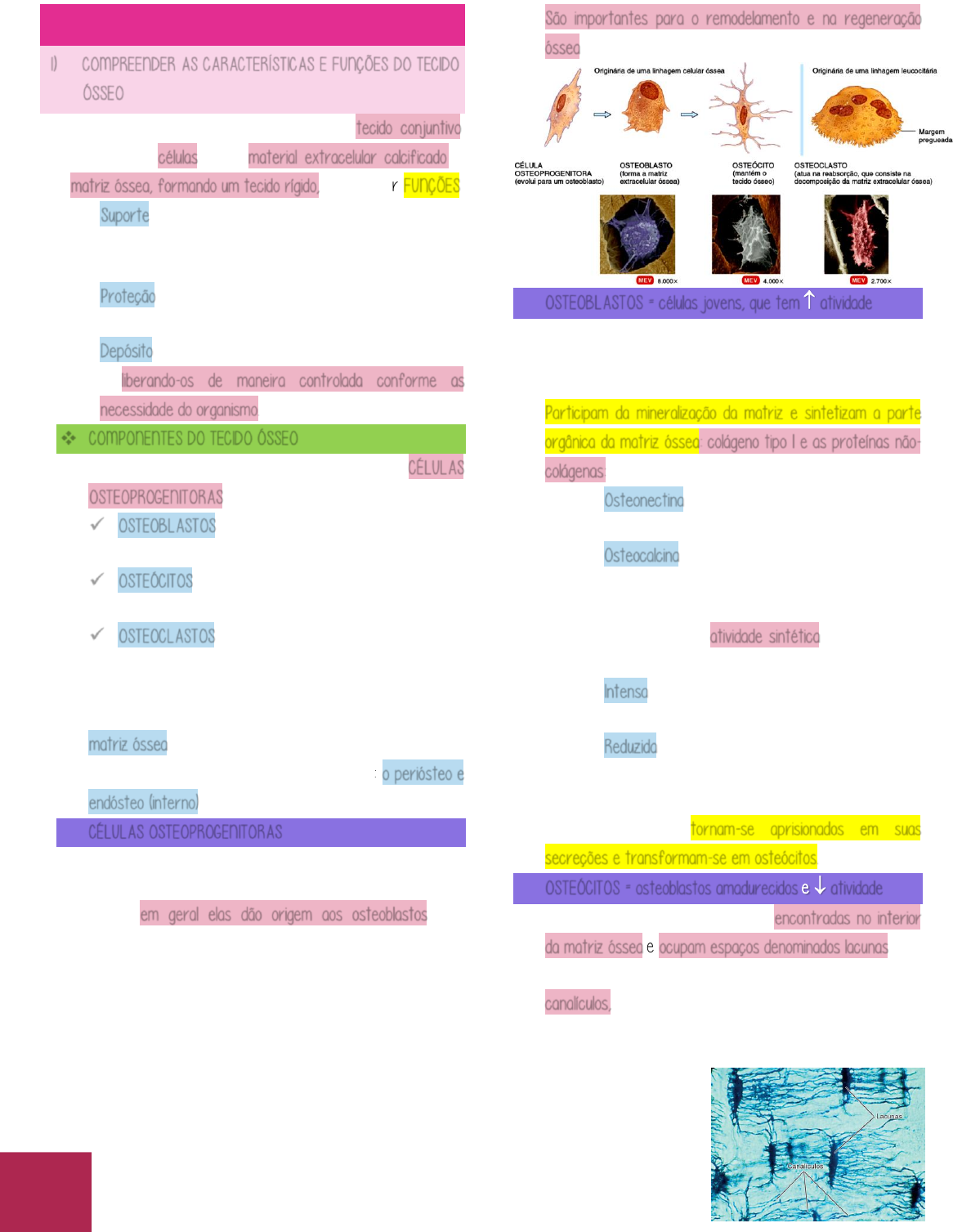APG – SOI II Emilly Lorena Queiroz Amaral – Medicina/2º Período 1 APG 10 –Reconstrução 1) COMPREENDER AS CARACTERÍSTICAS E FUNÇÕES DO TECIDO ÓSSEO O tecido ósseo é um tipo especializado de tecido conjuntivo, formado por células e por material extracelular calcificado, a matriz óssea, formando um tecido rígido, que tem por FUNÇÕES: Suporte para os tecidos moles, medula óssea (formadora das células do sangue) e apoio para os músculos esqueléticos, transformando as suas contrações em movimentos úteis; Proteção para os órgãos vitais, como na caixa torácica e craniana; Depósito de cálcio e fosfato e outros íons armazenando-os e liberando-os de maneira controlada conforme as necessidade do organismo. COMPONENTES DO TECIDO ÓSSEO As células integrantes do tecido ósseo são: as CÉLULAS OSTEOPROGENITORAS, as quais se diferenciam em: OSTEOBLASTOS, responsáveis pela síntese da parte orgânica da matriz e localizadas perifericamente; OSTEÓCITOS, que se situam em cavidades ou lacunas no interior da matriz; OSTEOCLASTOS, células gigantes, móveis e multinucleadas que reabsorvem o tecido ósseo, participando dos processos de remodelação dos ossos. O tecido ósseo tem uma matriz extracelular calcificada: a matriz óssea; E também, o revestimento de tecido conjuntivo: o periósteo e endósteo (interno). CÉLULAS OSTEOPROGENITORAS São derivadas de células tronco mesenquimatosas, sendo assim, tem o potencial de se diferenciar em vários tipos de células, em geral elas dão origem aos osteoblastos, pelo estimulo de IGF-1 e IGF-2, que vão levar a proliferação das células osteoprogenitoras e diferenciação em osteoblasto. Células planas e com núcleo alongado. Aparecem nas superfícies externas e internas dos ossos, próximo da microvasculatura. Essas são células de repouso, ou seja, elas estão basicamente aguardando algum estímulo que levem a sua diferenciação, como os osteoblastos. São importantes para o remodelamento e na regeneração óssea. OSTEOBLASTOS = células jovens, que tem atividade Dispõem-se sempre nas superfícies ósseas, lado a lado. (em ossos em formação, crescimento ou renovação) São derivados das células osteoprogenitoras. Participam da mineralização da matriz e sintetizam a parte orgânica da matriz óssea: colágeno tipo I e as proteínas não- colágenas: Osteonectina (glicoproteína multiadesiva) = ligação do colágeno com o cálcio. Osteocalcina (proteína dependente de vitamina K) = é específica do osso, absorve o cálcio na circulação e estimula os osteoblastos na remodelação óssea. Os esteoblastos tem uma atividade sintética que pode estar em dois momentos: Intensa: vai se manifestar como células cuboides com citoplasma basófilo Reduzida: vai se manifestar como células achatadas com menor basofilia no citoplasma (célula de repouso). Uma vez que os próprios osteoblastos são recobertos por matriz extracelular, tornam-se aprisionados em suas secreções e transformam-se em osteócitos. OSTEÓCITOS = osteoblastos amadurecidos e atividade Os osteócitos são células achatadas encontradas no interior da matriz óssea e ocupam espaços denominados lacunas. Conectando uma lacuna a outra, tem-se pequenos túneis, os canalículos, onde vão passar prolongamentos dos osteócitos, os quais fazem contato com prolongamentos dos osteócitos adjacentes por meio de junções comunicantes, que permite a nutrição dos osteócitos. APG – SOI II Emilly Lorena Queiroz Amaral – Medicina/2º Período 2 Células ósseas maduras derivadas dos osteoblastos, são as principais células do tecido ósseo, responsáveis pelo metabolismo ósseo diário (manter a matriz óssea), como a troca de nutrientes e resíduos com o sangue. Elas respondem às forças mecânicas que são aplicadas no osso, assim, quando há uma força que eleva a produção dessa célula, elas vão passar a ter mais R.E.R, Complexo de Golgi e mais lisossomos. Assim como os osteoblastos, os osteócitos não sofrem divisão celular. OSTEOCLASTOS = absorvem o tecido ósseo velho e recompõem com tecido ósseo novo São células gigantes, multinucleadas, ramificadas e móveis. O citoplasma é granuloso com vacúolos, quando essa célula é jovem o citoplasma é basófilo (mais roxo) e quando é mais madura o citoplasma é acidófilo (mais pro rosa). Os osteoclastos derivam de precursores mononucleados, então, eles originam da fusão de células hematopoiéticas mononucleares, portanto, eles pertencem ao sistema fagocitário mononuclear, eles vão chegar no tecido ósseo e vão se unir para formar o osteoclasto, por isso multinucleadas. Além disso, a célula libera poderosos ácidos (descalcificar a matriz) e enzimas lisossômicas que digerem os componentes minerais e proteicos da matriz extracelular óssea subjacente. Essa degeneração da matriz extracelular óssea, chamada REABSORÇÃO, é parte do desenvolvimento, da manutenção e do reparo ósseos. É a ação dos osteoclastos que permite a remodelação óssea. Depois que os osteoclastos acabam o papel de remodelação sofrem apoptose (morrem). Nas áreas de reabsorção de tecido ósseo, os osteoclastos são encontrados frequentemente ocupando pequenas depressões da matriz escavadas pela atividade dessas células e conhecidas como cavidade de reabsorção ou lacunas de Howship (parte branca). A ZONA BASAL, localizada mais distante da lacuna de Howship, contém a maior parte das organelas, incluindo os múltiplos núcleos e seus aparelhos de Golgi associados e centríolos. Mitocôndrias, REG e polissomas estão distribuídos por toda a célula, mas são mais numerosos perto da borda pregueada. A BORDA PREGUEADA é a parte da célula diretamente envolvida na reabsorção de matriz óssea, aumenta a superfície de contato com a matriz, para facilitar tanto a exocitose das enzimas hidrodolíticas como a endocitose dos produtos de degradação extracelular que aconteceu pelas enzimas. A ZONA CLARA 