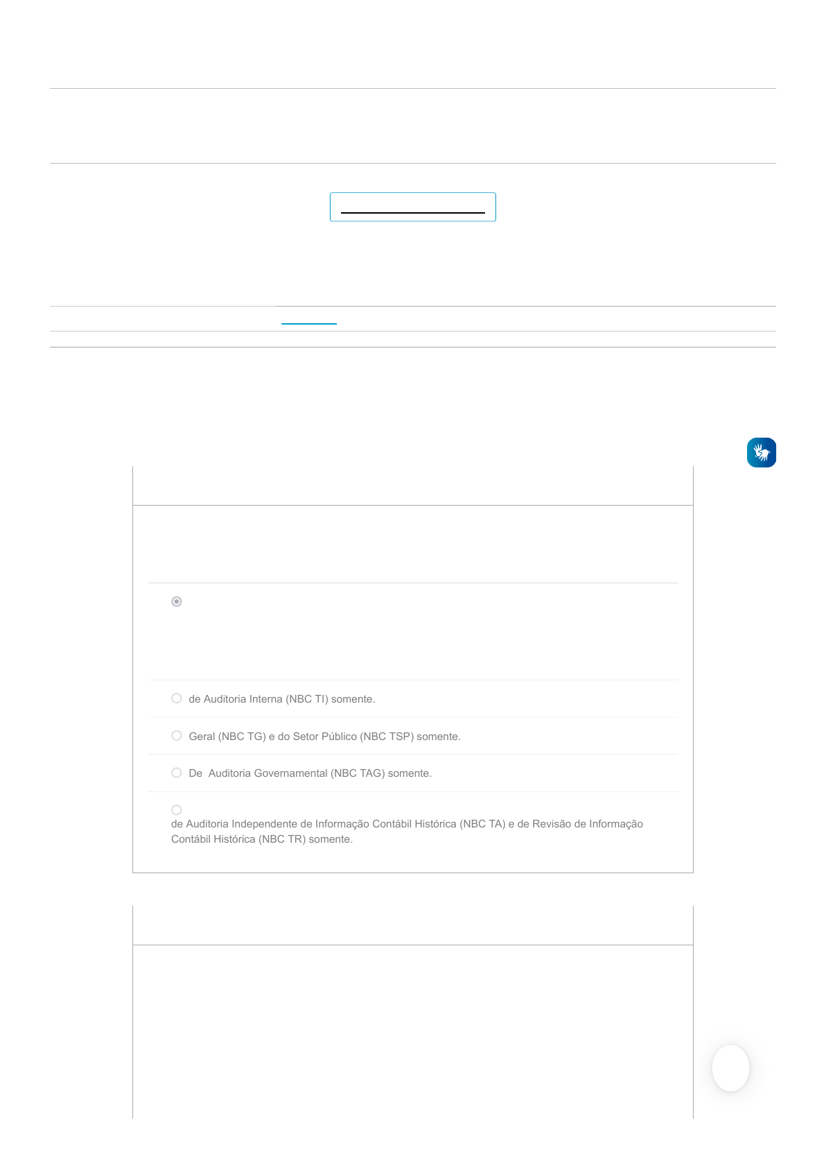 AV1_ 40 Pontos Entrega 20 mar em 23:59 Pontos 40 Perguntas 20 Disponível 12 mar em 0:00 - 20 mar em 23:59 9 dias Limite de tempo 120 Minutos Tentativas permitidas 2 Histórico de tentativas Tentativa Tempo Pontuação MAIS RECENTE Tentativa 1 63 minutos 38 de 40 As respostas corretas estarão disponíveis em 21 mar em 0:00. Pontuação desta tentativa: 38 de 40 Enviado 17 mar em 20:00 Esta tentativa levou 63 minutos. Fazer o teste novamente 2 / 2 ptsPergunta 1 As Normas Brasileiras de Contabilidade Técnicas (NBC T) definem conceitos doutrinários, regras e procedimentos aplicados de Contabilidade e classificam-se em: Geral (NBC TG); do Setor Público (NBC TSP); de Auditoria Independente de Informação Contábil Histórica (NBC TA); de Revisão de Informação Contábil Histórica (NBC TR); de Asseguração de Informação Não Histórica (NBC TO); de Serviço Correlato (NBC TSC); de Auditoria Interna (NBC TI); de Perícia (NBC TP); de Auditoria Governamental (NBC TAG). de Auditoria Interna (NBC TI) somente. Geral (NBC TG) e do Setor Público (NBC TSP) somente. De Auditoria Governamental (NBC TAG) somente. de Auditoria Independente de Informação Contábil Histórica (NBC TA) e de Revisão de Informação Contábil Histórica (NBC TR) somente. 2 / 2 ptsPergunta 2 De fato, as demonstrações financeiras, contábeis e gerenciais são a principal fonte na tomada de decisão de uma organização, pois auxiliam os financiadores da empresa, os sócios e acionistas, no objetivo traçado administrativo da empresa, e informam também os próprios trabalhadores, o Estado, clientes, fornecedores de um modo geral. Considerando as informações acima, avalie as asserções a seguir e a relação proposta entre elas: AV1_ 40 Pontos: F.CON.6 - Auditoria Financeira https://newtonpaiva.instructure.com/courses/14261/quizzes/33432 1 of 12 17/03/2022 20:02 https://newtonpaiva.instructure.com/courses/14261/quizzes/33432/take?user_id=18395 https://newtonpaiva.instructure.com/courses/14261/quizzes/33432/history?version=1 https://newtonpaiva.instructure.com/courses/14261/quizzes/33432/history?version=1 https://newtonpaiva.instructure.com/courses/14261/quizzes/33432/take?user_id=18395 https://newtonpaiva.instructure.com/courses/14261/quizzes/33432/take?user_id=18395 l - O trabalho da auditoria, via de regra, consiste genericamente, em uma análise exaustiva das informações financeiras destas empresas, efetuadas de forma quantificada e qualificada, e principalmente com o objetivo de referendar as informações contábeis/financeiras, de forma que traduza fidedignamente os números da empresa, da forma mais correta possível. PORQUE ll - O fato da informação ser alvo de uma auditoria, significa dizer que a entidade está sendo objeto de investigação e que seus números divulgados não refletem a realidade; e é justamente o contrário, porque significam que seus números estão sendo referenciados por uma empresa, alheia a entidade, sem vínculo algum com a empresa. A asserção I é uma proposição verdadeira e a II é uma proposição falsa. As asserções I e II são proposições verdadeiras e a II é uma justificativa correta da I. A asserção I é uma proposição falsa e a II é uma proposição verdadeira. As asserções I e II são proposições falsas. As asserções I e II são proposições verdadeiras, mas a II não é uma justificativa correta da I. Feedback: Como apresentado na unidade 1 no tópico 1, Conceito de Auditoria e 1.1 Modalidades da Auditoria. Nesse contexto, o fato da informação ser alvo de uma auditoria, não significa dizer que a entidade está sendo objeto de investigação, e que seus números divulgados, não refletem a realidade; é justamente o contrário, porque significam que seus números estão sendo referenciados por uma empresa, alheia a entidade, sem vínculo algum com a empresa. 2 / 2 ptsPergunta 3 As Normas Brasileiras de Contabilidade Profissionais (NBC P) definem regras de exercício profissional e classificam-se em: do Auditor Independente (NBC PA) somente do Perito (NBC PP) somente do Auditor Interno (NBC PI) somente Geral (NBC PG) somente Geral (NBC PG); do Auditor Independente (NBC PA); do Auditor Interno (NBC PI); do Perito (NBC PP) AV1_ 40 Pontos: F.CON.6 - Auditoria Financeira https://newtonpaiva.instructure.com/courses/14261/quizzes/33432 2 of 12 17/03/2022 20:02 2 / 2 ptsPergunta 4 "Geralmente é realizada tendo como início fatos relevantes, de natureza incomum ou extraordinária, sendo realizada a pedido de autoridade competente, que podem ser: administração, sócios, acionistas entre outros." , refere-se à qual modalidade de auditoria? Assinale a opção CORRETA: de gestão de logística de sistemas especial de riscos 2 / 2 ptsPergunta 5 A Prudência determina: “a adoção do menor valor para os componentes do resultado, sempre que se apresentem alternativas igualmente válidas para a quantificação das mutações patrimoniais que alterem o patrimônio líquido”. “a adoção do menor valor para os componentes do ativo e do maior para os do passivo, sempre que se apresentem alternativas igualmente válidas para a quantificação das mutações patrimoniais que alterem o patrimônio líquido”. “a adoção do menor valor para os componentes de resultado e do maior para os do passivo, sempre que se apresentem alternativas igualmente válidas para a quantificação das mutações patrimoniais que alterem o patrimônio líquido”. “a adoção do maior valor para os componentes do ativo e do maior para os do passivo, sempre que se apresentem alternativas igualmente válidas para a quantificação das mutações patrimoniais que alterem o patrimônio líquido”. “a adoção de valores iguais para os componentes do ativo e do maior para os do passivo, sempre que se apresentem alternativas igualmente válidas para a quantificação das mutações patrimoniais que alterem o patrimônio líquido”. 2 / 2 ptsPergunta 6 AV1_ 40 Pontos: F.