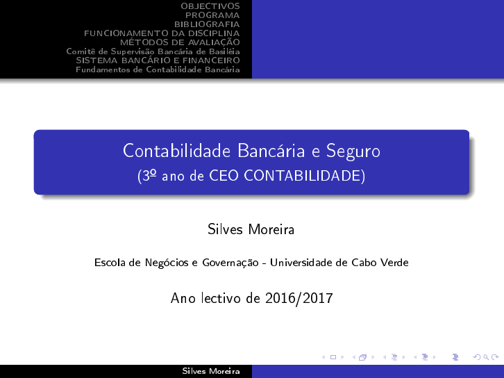 OBJECTIVOS PROGRAMA BIBLIOGRAFIA FUNCIONAMENTO DA DISCIPLINA MÉTODOS DE AVALIAÇÃO Comitê de Supervisão Bancária de Basiléia SISTEMA BANCÁRIO E FINANCEIRO Fundamentos de Contabilidade Bancária Contabilidade Bancária e Seguro (3º ano de CEO CONTABILIDADE) Silves Moreira Escola de Negócios e Governação - Universidade de Cabo Verde Ano lectivo de 2016/2017 Silves Moreira OBJECTIVOS PROGRAMA BIBLIOGRAFIA FUNCIONAMENTO DA DISCIPLINA MÉTODOS DE AVALIAÇÃO Comitê de Supervisão Bancária de Basiléia SISTEMA BANCÁRIO E FINANCEIRO Fundamentos de Contabilidade Bancária Conteúdo 1 OBJECTIVOS 2 PROGRAMA 3 BIBLIOGRAFIA 4 FUNCIONAMENTO DA DISCIPLINA 5 MÉTODOS DE AVALIAÇÃO 6 Comitê de Supervisão Bancária de Basiléia 7 SISTEMA BANCÁRIO E FINANCEIRO 8 Fundamentos de Contabilidade Bancária Silves Moreira OBJECTIVOS PROGRAMA BIBLIOGRAFIA FUNCIONAMENTO DA DISCIPLINA MÉTODOS DE AVALIAÇÃO Comitê de Supervisão Bancária de Basiléia SISTEMA BANCÁRIO E FINANCEIRO Fundamentos de Contabilidade Bancária Objetivo Geral: Desenvolver um conjunto de conhecimentos sobre a posição de instituições �nanceiras e seguradoras no Sistema Económico e respetivo enquadramento normativo; Apresentar as principais especi�cidades da contabilidade destas instituições. Competências: Reconhecer os principais aspetos do negócio das instituições de crédito e seguradoras; Compreender os processos de contabilização mais relevantes destas instituições; Reconhecer e interpretar os diferentes elementos contabilísticos das Demonstrações Financeiras. Resultados da Aprendizagem: Conhecer o quadro legal e económico em que operam as instituições �nanceiras e seguradoras; Deter uma visão integrada da especi�cidade do negócio destas instituições e implicações a nível dos principais processos contabilísticos associados; Conseguir avaliar questões especí�cas associadas à contabilidade enquanto instrumento de informação e gestão deste tipo de instituições. Silves Moreira OBJECTIVOS PROGRAMA BIBLIOGRAFIA FUNCIONAMENTO DA DISCIPLINA MÉTODOS DE AVALIAÇÃO Comitê de Supervisão Bancária de Basiléia SISTEMA BANCÁRIO E FINANCEIRO Fundamentos de Contabilidade Bancária Programa Parte I � Contabilidade Bancária A atividade �nanceira A normalização contabilística na atividade �nanceira Operações bancárias e sua escrituração o Operações de tesouraria e depósitos dos clientes o Abertura de crédito e crédito e juros vencidos o Impostos na atividade bancária o Especialização dos exercícios o Provisões e imparidades o Operações em moeda estrangeira Apuramento de resultados Balanço e demonstração de resultados Silves Moreira OBJECTIVOS PROGRAMA BIBLIOGRAFIA FUNCIONAMENTO DA DISCIPLINA MÉTODOS DE AVALIAÇÃO Comitê de Supervisão Bancária de Basiléia SISTEMA BANCÁRIO E FINANCEIRO Fundamentos de Contabilidade Bancária .... Parte II � Contabilidade Seguradora A atividade seguradora A normalização contabilística na atividade seguradora As operações correntes As provisões técnicas e não técnicas ou contabilísticas Os investimentos As operações não correntes Apuramento de resultados Balanço e demonstração de resultados Silves Moreira OBJECTIVOS PROGRAMA BIBLIOGRAFIA FUNCIONAMENTO DA DISCIPLINA MÉTODOS DE AVALIAÇÃO Comitê de Supervisão Bancária de Basiléia SISTEMA BANCÁRIO E FINANCEIRO Fundamentos de Contabilidade Bancária 1 ALVES, Luís Canelas e TAVARES, Inês Cruz (1998); Finanças Bancárias � Análise Financeira de Bancos; ISGB, Lisboa. 2 VENTURA, José Carvalho e CURADO, Américo Rego (1998); Contabilidade Bancária; IFB; Lisboa. 3 PLANO DE CONTAS 4 SANTOS, José Gonçalves (2004). Contabilidade de Seguros. Quid Júris; Lisboa. 5 CAIADO, Anibal Campos -2015. Bancos -Normativos, Contabilidade e Gestão Silves Moreira OBJECTIVOS PROGRAMA BIBLIOGRAFIA FUNCIONAMENTO DA DISCIPLINA MÉTODOS DE AVALIAÇÃO Comitê de Supervisão Bancária de Basiléia SISTEMA BANCÁRIO E FINANCEIRO Fundamentos de Contabilidade Bancária A metodologia de ensino apoiar-se-á nos seguintes vectores: Aulas teóricas - Exposição Apresentação, explanação das matérias e enquadramento temático dos assuntos em articulação com as aplicações desenvolvidas nas aulas práticas. Aulas práticas : Recorrer-se-á a exemplos reais ou simulados e exercícios de aplicação relativos às matérias expostas para debate, resolução nas aulas e trabalhos curriculares.; Far-se-á também apelo aos trabalhos individuais ou de grupo sobre temas a seleccionar e a serem posteriormente objecto de debate; Procurar-se-á ainda, diversi�car os suportes técnicos de aprendizagem, de acordo com as possibilidades de meios existentes. Materiais de apoio As aulas teóricas são disponibilizadas, feitas com base em bibliogra�as de diferentes países sobre a matéria. Ficha de exercícios e estudo de casos. No concernente aos meios e instrumentos didácticos, utilizar-se-á o retroprojector/data-show, assim como o Silves Moreira OBJECTIVOS PROGRAMA BIBLIOGRAFIA FUNCIONAMENTO DA DISCIPLINA MÉTODOS DE AVALIAÇÃO Comitê de Supervisão Bancária de Basiléia SISTEMA BANCÁRIO E FINANCEIRO Fundamentos de Contabilidade Bancária quadro/marcador. Silves Moreira OBJECTIVOS PROGRAMA BIBLIOGRAFIA FUNCIONAMENTO DA DISCIPLINA MÉTODOS DE AVALIAÇÃO Comitê de Supervisão Bancária de Basiléia SISTEMA BANCÁRIO E FINANCEIRO Fundamentos de Contabilidade Bancária Metodologia de Avaliação Parte I � A avaliação contínua terá duas componentes: Teste escrito, sobre todos os conteúdos ministrados na cadeira, com ponderação de 50%; Trabalho escrito a realizar e apresentar durante o semestre, com ponderação de 30% Participação nas aulas, com ponderação de 20% Os alunos que, por razões devidamente justi�cadas, não possam ser avaliados em regime de avaliação contínua poderão obter aprovação à unidade curricular através de exame �nal. Silves Moreir