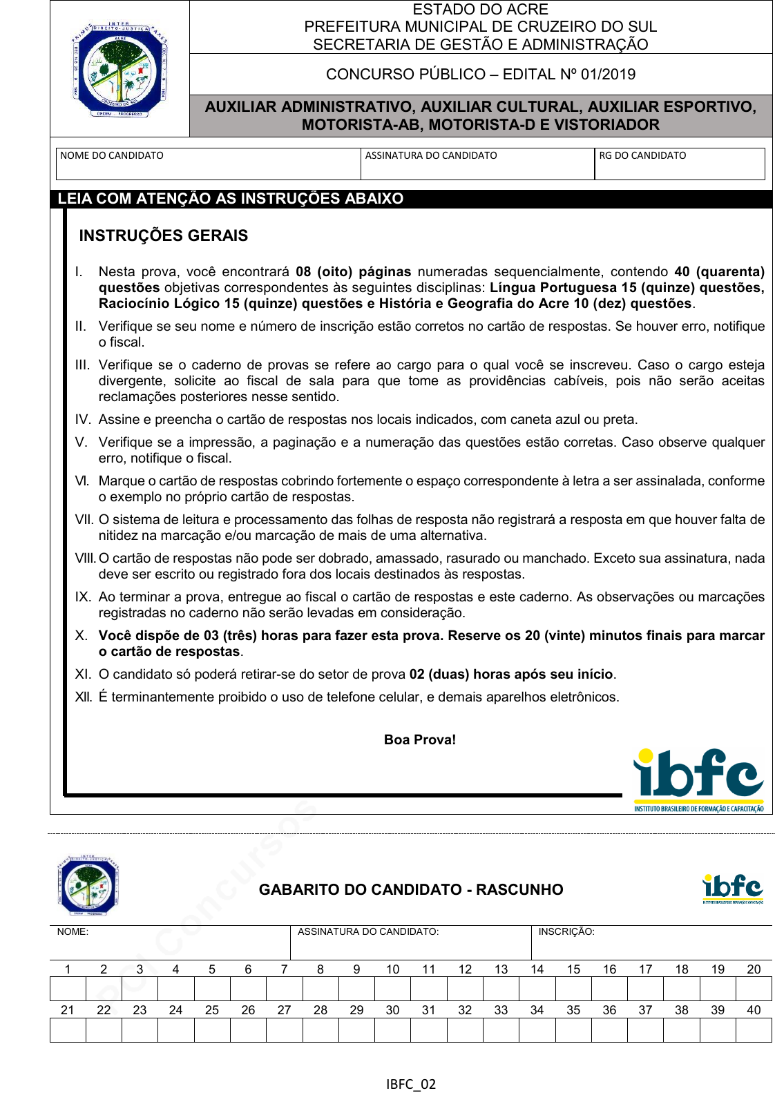 Raciocínio Lógico 15 (quinze) questões e História e Geografia do Acre 10 (dez) questões.