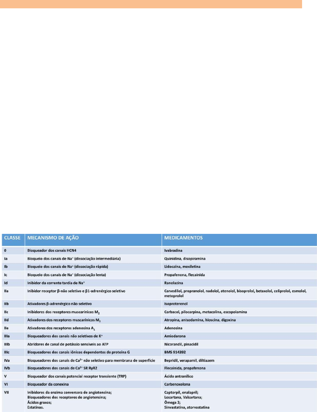 FÁRMACOS ANTIARRÍTMICOS - Arritmia cardíaca: refere-se a qualquer alteração da sequência normal dos impulsos elétricos, ou seja, é qualquer desvio da normalidade na formação e/ou condução do estímulo elétrico para a contração do músculo cardíaco. - Distúrbios elétricos são: ● Taquicardia (F.C alta): > 100bpm ● Bradicardia:(F.C baixa) :< 50bpm PRINCÍPIOS DA ELETROFISIOLOGIA CARDÍACA Bombeamento sanguíneo perfeito depende da contração sequencial rítmica do coração, que ocorre por meio de células musculares cardíacas (cardiomiócitos) com propriedade de iniciar o estímulo (automatismo) e de propagá-lo (condução). A contração sequencial coordenada ocorre dos átrios para os ventrículos e do ápice para a base do coração. A arritmia cardíaca surge quando esse processo é deturpado por qualquer alteração no automatismo ou na condução. FÁRMACOS ANTIARRÍTMICOS - Os FAA foram classificados pela primeira vez por Vaughan Williams (classificação de acordo com o mecanismo de ação que se conhecia na época) Classe I → Bloqueadores dos canais de Na+ Classe II → Bloqueadores dos canais de receptores β-adrenérgicos Classe III → Bloqueadores dos canais de K+ Classe IV → Bloqueadores dos canais de Ca²+ - Diante das limitações da classificação de Vaughan Williams, foi publicada uma proposta moderna que engloba as principais ações dos agentes antiarrítmicos atuais e potenciais, além de permanecer as quatro classes originais. CLASSE 0 - Caracterizada por medicamentos que atuam inibindo o canal marca-passo cardíaco (HCN4). - Ivabradina: indicações são para o tratamento de angina pectoris estável e em pacientes com insuficiência cardíaca. Seu uso em portadores de fibrilação atrial é controverso, já que sua ação é mais direcionada ao nó sinusal. Atua através da inibição seletiva e específica da corrente marco-passo que controla a despolarização diastólica espontânea do nódulo sinusal, com menor efeito na condução intra-atrial, atrioventricular, intraventricular ou na repolarização ventricular. Além disso, é possível que atue por meio do bloqueio do canal com nucleotídeo cíclico hiperpolarizado, com possíveis efeitos adicionais no ciclo de Ca²+ intracelular. CLASSE I - Esta classe exerce seus efeitos primariamente bloqueando os canais de Na, sendo subdividido conforme o tipo de cinética de ligação ao canal e a modulação específica de cada fármaco ao receptor desse canal. - FAA se liga de forma peculiar ao canal que, conforme a cinética de reativação, pode ser classificada em rápida (subgrupo Ib), intermediária (subgrupo Ia) e lenta (subgrupo Ic). subgrupo Ia Usos terapêuticos - Os medicamentos que fazem parte do subgrupo Ia são os antiarrítmicos mais antigos. - Quinidina: tem particular efeito em arritmias geneticamente determinadas, como a síndrome de Brugada, evitando arritmias potencialmente fatais. - Procainamida: muito utilizada na reversão da fibrilação atrial aguda. - Esses medicamentos não possuem mais registros no Brasil. Farmacocinética - As concentrações plasmáticas de sulfato de quinidina atingem seu pico aproximadamente em 90 minutos quando administrado por via oral. Possui forte ligação proteica (80%), principalmente com a glicoproteína ácida alfa. - A quinidina é metabolizada primariamente por hidroxilação no fígado, e uma pequena parte (aproximadamente 20%) é excretada pelos rins de forma inalterada. Sua meia-vida é de cinco a oito horas após a administração oral. Efeitos adversos, contraindicações e toxicidade - Efeitos adversos: mais comuns são diarreias, náuseas, cefaléia e tontura. Outros, menos comuns, são: febre, rash cutâneo, angioedema, plaquetopenia, agranulocitose, hepatite e lúpus, além do efeito pró- arrítmico. - A quinidina é contraindicada na presença de taquicardias ventriculares secundárias à síndrome do QT longo, nos casos de insuficiência cardíaca congestiva, miastenia grave, insuficiência hepática, doença inflamatória intestinal e no uso concomitante com fármacos que prolonguem o intervalo QT, por exemplo, antidepressivos tricíclicos e sulfametoxazol + trimetropina. - A quinidina aumenta os níveis séricos da digoxina podendo potencializar os efeitos de fármacos hipotensores ou que bloqueiam o nó sinusal, como betabloqueadores e verapamil. Além disso, eleva os níveis séricos dos anticoagulantes orais por interação hepática. Medicamentos indutores enzimáticos, como a fenitoína, barbitúricos e rifampicina, aumentam o metabolismo hepático da quinidina, diminuindo sua concentração sérica. A quinidina ainda inibe o metabolismo hepático da propafenona, do metoprolol, de flecainida e de outros fármacos dependentes do citocromo P450. A hipocalemia diminui a eficácia da quinidina e ainda contribui para o prolongamento do intervalo QT. subgrupo Ib Usos terapêuticos - Indicados no tratamento de arritmias ventriculares, pois encurtam a duração do potencial de ação e apresentam cinética de reativação do canal de sódio muito rápida, não causando, portanto, prolongamento do intervalo QT. - Medicamentos mais conhecidos no Brasil são a lidocaína e a mexiletina, porém a mexiletina não é comercializada no Brasil. - Lidocaína, apesar de ser um anestésico, exerce ações eletrofisiológicas no coração, o que lhe confere propriedades antiarrítmicas. Este fármaco age principalmente no miocárdio isquêmico e se torna mais efetivo quando os níveis de potássio estão normais ou aumentados. - Mexiletina, apesar de possuir uma estrutura parecida com a lidocaína, é utilizada por via oral. Esta pode ser utilizada em associação a outros FAA para quando se deseja diminuir os efeitos pró-arrítmicos ou em eventos adversos dos antiarrítmicos e ainda para um efeito sinérgico na profilaxia de arritmias ventriculares. O seu uso isolado é praticamente ineficaz quando comparado com os outros FAA. Ef