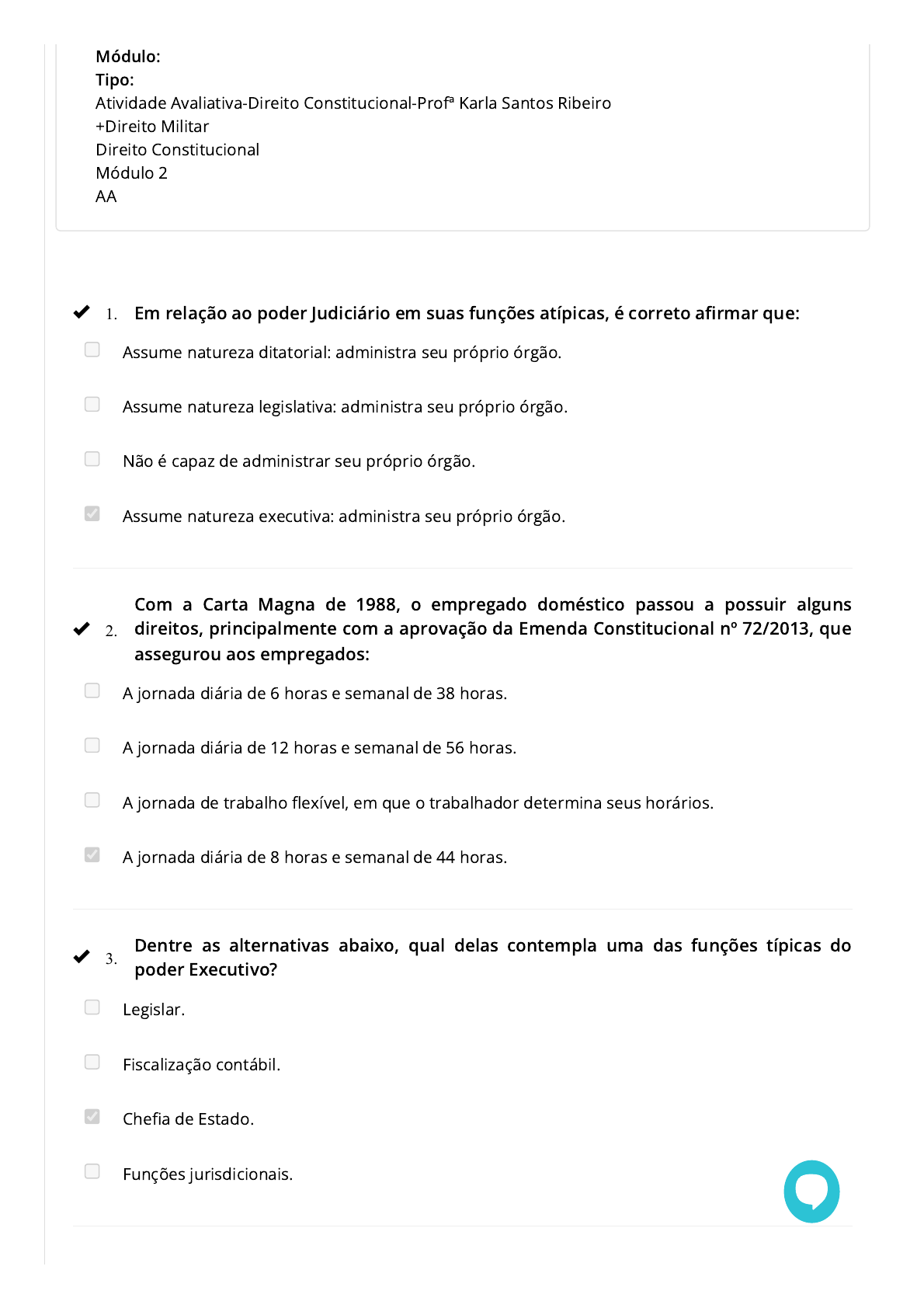 07/01/2022 19:05 UNINA https://cursor.saobraz.edu.br/Account/Questionario.aspx?token=U3R1ZGVudENsYXNzSWQ9Nzc2Mjk5JlF1ZXN0aW9ubmFpcmVJZD0xNDU2M… 2/5 Em relação ao poder Judiciário em suas funções atípicas, é correto a�rmar que: Assume natureza ditatorial: administra seu próprio órgão. Assume natureza legislativa: administra seu próprio órgão. Não é capaz de administrar seu próprio órgão. Assume natureza executiva: administra seu próprio órgão. Com a Carta Magna de 1988, o empregado doméstico passou a possuir alguns direitos, principalmente com a aprovação da Emenda Constitucional nº 72/2013, que assegurou aos empregados: A jornada diária de 6 horas e semanal de 38 horas. A jornada diária de 12 horas e semanal de 56 horas. A jornada de trabalho �exível, em que o trabalhador determina seus horários. A jornada diária de 8 horas e semanal de 44 horas. Dentre as alternativas abaixo, qual delas contempla uma das funções típicas do poder Executivo? Legislar. Fiscalização contábil. Che�a de Estado. Funções jurisdicionais. Módulo: Tipo: Atividade Avaliativa-Direito Constitucional-Profª Karla Santos Ribeiro +Direito Militar Direito Constitucional Módulo 2 AA 1. 2. 3. 07/01/2022 19:05 UNINA https://cursor.saobraz.edu.br/Account/Questionario.aspx?token=U3R1ZGVudENsYXNzSWQ9Nzc2Mjk5JlF1ZXN0aW9ubmFpcmVJZD0xNDU2M… 3/5 A Constituição Federal, no artigo 1º, estabelece os fundamentos da República Federativa do Brasil. Assim, assinale a alternativa que corresponde aos seus fundamentos: Soberania; cidadania; solidariedade da pessoa humana; os valores sociais do trabalho e da iniciativa privada. Soberania; cidadania; dignidade da pessoa humana; os valores sociais do trabalho e da livre iniciativa; o pluralismo político. Soberania; cidadania; castidade da pessoa humana; defesa da paz; construir uma sociedade livre, justa e solidária. Repúdio ao terrorismo e ao racismo; cidadania; dignidade da pessoa humana; defesa da paz; construir uma sociedade livre, justa e solidária. Conforme o artigo 1º da Constituição Federal estabelece, assinale a alternativa que corresponde ao Regime de Governo da República Federativa do Brasil: Parlamentarismo. Estado autocrático. Monarquia. Estado Democrático de Direito. A Constituição Brasileira estabelece os princípios norteadores da República Federativa do Brasil. Assim, assinale a alternativa que corresponde à forma de governo brasileiro: Monarquia. República. Anarquismo. Aristocracia. A segunda Geração de Direitos Fundamentais remete àqueles reivindicados pelo povo após a Revolução Industrial. Sendo assim, assinale a alternativa que corresponde ao direito que engloba a igualdade formal, ou seja, perante a lei e algumas garantias processuais: Direito à Fraternidade. 4. 5. 6. 7. 07/01/2022 19:05 UNINA https://cursor.saobraz.edu.br/Account/Questionario.aspx?token=U3R1ZGVudENsYXNzSWQ9Nzc2Mjk5JlF1ZXN0aW9ubmFpcmVJZD0xNDU2M… 4/5 Direito à Igualdade. Direito à Irmandade. Direito à Felicidade. Dentre as alternativas abaixo, assinale aquela que corresponde às funções típicas do Poder Executivo: É a elaboração de leis. São as funções jurisdicionais. São os atos de che�a de Estado, che�a de governo e atos de administração. Não possui função típica. Em relação à soberania, é correto a�rmar que suas características estão expressas em qual das alternativas abaixo? Múltipla; divisível; inalienável; imprescritível. Una; intransigente; inalienável; indesejável. Una; indivisível; inalienável; imprescritível. Una; intransigente; intratável; imprescritível. Conforme o Art. 2º da Constituição Federal, assinale a alternativa que corresponde às funções típicas do Poder Judiciário: É a elaboração de leis. São as funções jurisdicionais. São os atos de che�a de Estado, che�a de governo e atos de administração. Não possui função típica. 8. 9. 10.