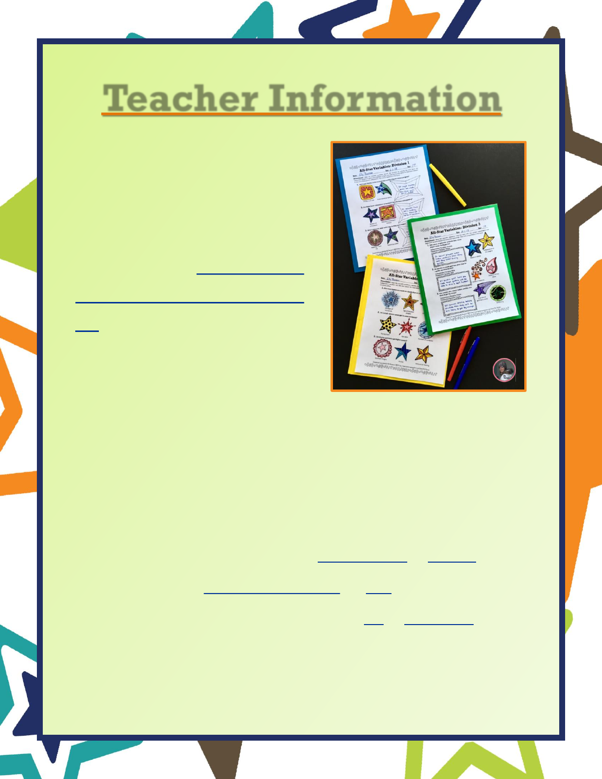 Created and copyrighted by Elly Thorsen in 2018 © http://www.teacherspayteachers.com/Store/Elly-Thorsen Teacher Information © Copyright 2018 by Elly Thorsen. All rights reserved. This resource is copyrighted so please only use it for your classroom and do not use it for any commercial purposes. Permission is granted to copy pages specifically designed for student or teacher use by the original purchaser or licensee. The reproduction of any other part of this product is strictly prohibited. Copying any part of this product and placing it on the Internet in any form (even a personal or classroom website) is strictly forbidden. Doing so makes it possible for an Internet search to make the document available on the Internet, free of charge, and is a violation of the Digital Millennium Copyright Act (DMCA). The digital papers and clip art in this resource are from CarrieStephensArt and OldMarket. Take a look at the many other Scientific Method Resources in my store. You can find more teaching information and notices of sales on my blog and Facebook page. Thanks again! Elly Thorsen Thank you for your download! I hope you find this resource useful in your classroom and for your students. This is a free sample from the All-Star Sports Variables Coloring Worksheet Set. If you like this worksheet, please consider getting the whole set. https://www.teacherspayteachers.com/Store/Carriestephensart https://www.teacherspayteachers.com/Store/Oldmarket https://www.teacherspayteachers.com/Store/Elly-Thorsen/Category/Scientific-Method-187513 https://www.teacherspayteachers.com/Store/Elly-Thorsen http://ellythorsenteaching.blogspot.kr/ https://www.facebook.com/EllyThorsenTPT https://www.teacherspayteachers.com/Product/All-Star-Sports-Variables-Coloring-Worksheet-Set-Scientific-Method-Practice-3628996 https://www.teacherspayteachers.com/Product/All-Star-Sports-Variables-Coloring-Worksheet-Set-Scientific-Method-Practice-3628996?utm_source=freewkst.com&utm_campaign=ALLSTARSFREESAMPLEFROMDOC https://www.teacherspayteachers.com/Store/Elly-Thorsen Created and copyrighted by Elly Thorsen in 2018 © http://www.teacherspayteachers.com/Store/Elly-Thorsen Name: Date: Hour: All-Star Variables: Division 3 Directions: Read the scientific questions. Find the stars with the correct independent and dependent variables below them and color accordingly. Then write a hypothesis in the frame. Created and copyrighted by Elly Thorsen in 2018 © http://www.teacherspayteachers.com/Store/Elly 1. Will cotton or polyester uniforms keep soccer players cooler during games? Independent Variable:Orange Dependent Variable:Yellow 2. Do wooden or plastic golf tees affect how far a golfer can drive the ball? Independent Variable: Blue Dependent Variable: Red 3. Are runners who stretch before practice less likely to get leg cramps? Independent Variable:Green Dependent Variable: Purple the frame. Uniform material Temperature of the players Distance of the drive Wood or plastic Stretching Chances of getting a cramp Created and copyrighted by Elly Thorsen in 2018 © http://www.teacherspayteachers.com/Store/Elly-Thorsen Name: Answer Key Date: Hour: All-Star Variables: Division 3 Directions: Read the scientific questions. Find the stars with the correct independent and dependent variables below them and color accordingly. Then write a hypothesis in the frame. Created and copyrighted by Elly Thorsen in 2018 © http://www.teacherspayteachers.com/Store/Elly 1. Will cotton or polyester uniforms keep soccer players cooler during games? Independent Variable:Orange Dependent Variable:Yellow 2. Do wooden or plastic golf tees affect how far a golfer can drive the ball? Independent Variable: Blue Dependent Variable: Red 3. Are runners who stretch before practice less likely to get leg cramps? Independent Variable:Green Dependent Variable: Purple the frame. Uniform material #1 IV Temperature of the players #1 DV Distance of the drive #2 DV Wood or plastic #2 IV Stretching #3 IV Chances of getting a cramp #3 DV Example Hypothesis: If soccer players wear cotton uniforms, then they will stay cooler during games. Example Hypothesis: If plastic golf tees are used, then golfers will be able to drive a ball farther. Example Hypothesis: If runners stretch before practice, then they will be less likely to get leg cramps.