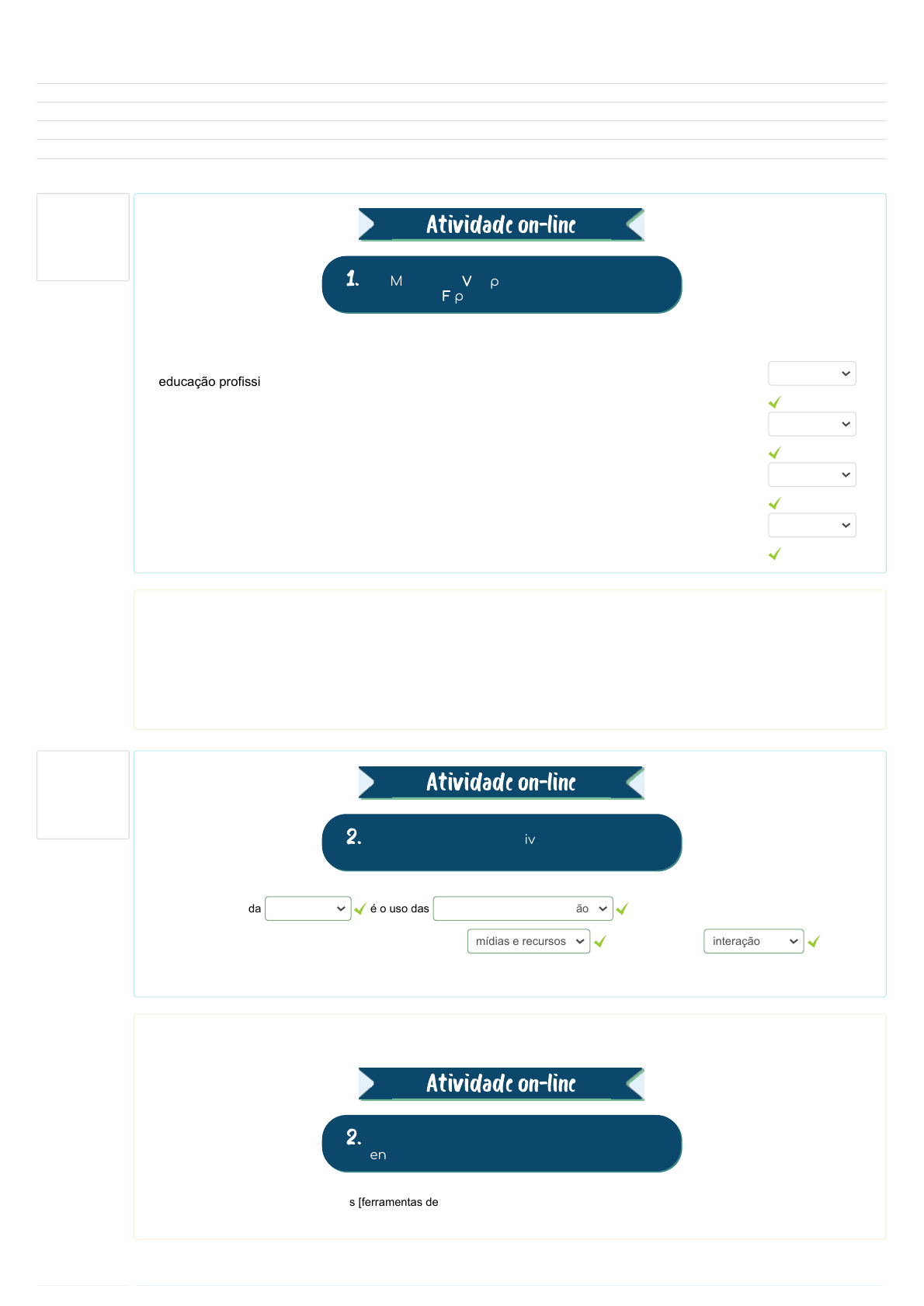 Painel ► FPM ► Avaliação OnLine Questão 1 Correto Atingiu 1,00 de 1,00 Questão 2 Correto Atingiu 1,00 de 1,00 Iniciado em Wednesday, 12 Jan 2022, 23:51 Estado Finalizada Concluída em Wednesday, 12 Jan 2022, 23:58 Tempo empregado 7 minutos 29 segundos Avaliar 15,00 de um máximo de 15,00(100%) 1. Marque V para as alternativas verdadeiras e F para as falsas. Atividade on-line A educação profissional pode ser oferecida a distância com exceção dos cursos técnicos de nível médio. O aluno on-line deve assumir um novo papel de participante ativo e autônomo na construção do conhecimento, uma vez que o processo de aprendizagem preconizará a autogestão do estudo. Os cursos e programas livres a distância devem seguir às diretrizes curriculares nacionais, estabelecidas pelo Ministério da Educação. Educação a distância é a modalidade educacional na qual a mediação didático-pedagógica nos processos de ensino e aprendizagem ocorre com a utilização de meios e tecnologias de informação e comunicação. Sua resposta está correta. A resposta correta é: A educação profissional pode ser oferecida a distância com exceção dos cursos técnicos de nível médio. – Falso, O aluno on-line deve assumir um novo papel de participante ativo e autônomo na construção do conhecimento, uma vez que o processo de aprendizagem preconizará a autogestão do estudo. – Falso, Os cursos e programas livres a distância devem seguir às diretrizes curriculares nacionais, estabelecidas pelo Ministério da Educação. – Verdadeiro, Educação a distância é a modalidade educacional na qual a mediação didático-pedagógica nos processos de ensino e aprendizagem ocorre com a utilização de meios e tecnologias de informação e comunicação. – Verdadeiro. 2. Escolha a alternativa que completa ordenadamente as lacunas: Atividade on-line Outra característica da é o uso das mediadas pela tecnologia e o modelo instrucional dos cursos busca utilizar os mais variados tipos de que possibilitem a entre alunos e professores. Sua resposta está correta. A resposta correta é: 2. Escolha a alternativa que completa ordenadamente as lacunas: Atividade on-line Outra característica da [EaD] é o uso das [ferramentas de comunicação] mediadas pela tecnologia e o modelo instrucional dos cursos busca utilizar os mais variados tipos de [mídias e recursos] que possibilitem a [interação] entre alunos e professores. Falso Falso Verdadeiro Verdadeiro EaD ferramentas de comunicação mídias e recursos interação https://mooc.cps.sp.gov.br/mediacao/my/ https://mooc.cps.sp.gov.br/mediacao/course/view.php?id=2 https://mooc.cps.sp.gov.br/mediacao/mod/quiz/view.php?id=13 Questão 3 Correto Atingiu 1,00 de 1,00 Questão 4 Correto Atingiu 1,00 de 1,00 3. Das sentenças a abaixo, analise e identifique a ação que melhor completa o “perfil que o aluno deve assumir na EaD”. O aluno deve: Atividade on-line Escolha uma: a. participar ativa e colaborativamente da construção do conhecimento, sendo reflexivo e autônomo. Está correta. b. interagir colaborativamente na web e nas redes sociais com os ex-alunos do curso com os quais tem afinidade. c. estudar solitariamente recorrendo exclusivamente às referências dispostas na internet. d. interagir exclusivamente nas redes sociais com os colegas e professor que têm afinidade. e. pesquisar unicamente outros cursos semelhantes antes de participar das atividades on-line do próprio curso. Sua resposta está correta. A resposta correta é: participar ativa e colaborativamente da construção do conhecimento, sendo reflexivo e autônomo.. 4. Associe as competências que delineiam a ação do professor tutor. Atividade on-line Aspectos interpessoais, a comunicação individual, a criatividade e a socialização contribuindo para um ambiente agradável. Aspectos técnicos do ambiente, o domínio das tecnologias de informação a orientação técnica visando a um melhor aproveitamento do AVAs. Compreensão do tutor sobre sua própria atuação, buscando a análise e a melhoria de seu trabalho. Métodos de ensino-aprendizagem, que contribuem para o aprendizado do grupo e do indivíduo. Sua resposta está correta. A resposta correta é: Aspectos interpessoais, a comunicação individual, a criatividade e a socialização contribuindo para um ambiente agradável. – Socioafetiva, Aspectos técnicos do ambiente, o domínio das tecnologias de informação a orientação técnica visando a um melhor aproveitamento do AVAs. – Tecnológica, Compreensão do tutor sobre sua própria atuação, buscando a análise e a melhoria de seu trabalho. – Autoavaliativa, Métodos de ensino-aprendizagem, que contribuem para o aprendizado do grupo e do indivíduo. – Pedagógica. Socioafetiva Tecnológica Autoavaliativa Pedagógica Questão 5 Correto Atingiu 1,00 de 1,00 Questão 6 Correto Atingiu 1,00 de 1,00 5. Marque V para as alternativas verdadeiras e F para as falsas. Faz parte do perfil do professor mediador: Atividade on-line ter postura interativa, cooperativa, com princípios éticos, solidariedade e empatia. ser capaz de mediar o processo de aprendizagem do aluno. ter domínio das tecnologias digitais e de comunicação. ser capaz de se expressar textualmente com clareza. ser capaz de provocar situações de conflito. Sua resposta está correta. A resposta correta é: ter postura interativa, cooperativa, com princípios éticos, solidariedade e empatia. – Verdadeiro, ser capaz de mediar o processo de aprendizagem do aluno. – Verdadeiro, ter domínio das tecnologias digitais e de comunicação. – Verdadeiro, ser capaz de se expressar textualmente com clareza. – Verdadeiro, ser capaz de provocar situações de conflito. – Falso. 6. A unidade 2, no Mergulhando no Tema, Silva (2010) observa as habilidades para promover a sala de aula interativa. Destaca, entre outras habilidades, que o professor tutor deve ser capaz de: Atividade on-line Escolha uma: a.