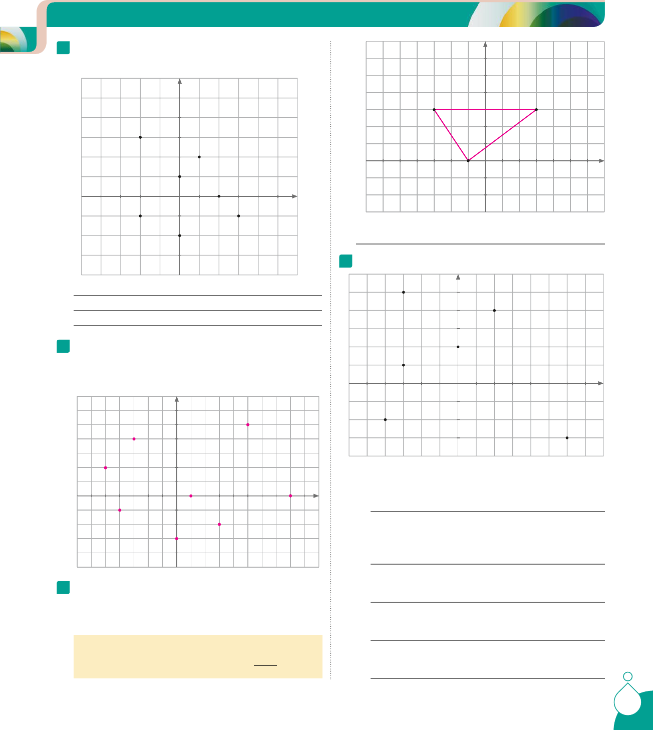 1 Escreva o par ordenado que representa cada ponto assinalado no plano cartesiano. 022 22 24 26 2 2 4 6 8 10 4 6 8 10 x242628 F A y E B C G D A(2, 4); B(6, 22); C(4, 0); D(0, 2); E(0, 24); F(24, 6); G(24, 22) 2 No plano cartesiano a seguir, localize os pontos A(3, 22); B(1, 0); C(24, 21); D(0, 23); E(23, 4); F(5, 5); G(8, 0) e H(25, 2). 1 121 0 21 22 23 24 23242526 22 2 3 4 5 6 7 8 9 x y 2 3 4 5 6 A B C E F G H D 3 Desenhe no plano cartesiano um triângulo cujos vér- tices são os pontos A(23, 3), B(21, 0) e C(3, 3). Em seguida, determine a área desse triângulo ABC. A área da superfície de um triângulo de medida da base b e medida da altura h é calculada por: ⋅b h 2 1 121 0 21 22 23242526 22 2 3 4 5 6 x y 2 3 4 5 6 B A C 9 4 Observe o plano cartesiano e faça o que se pede. 0 21 21 22 23 1 1 2 3 4 5 2 3 4 5 6 7 x22232425 B E A y C D F a) Escreva as coordenadas de um ponto simétrico do ponto B em relação ao eixo x. B’(23, 21) b) Escreva as coordenadas de um ponto simétrico do ponto D em relação ao eixo y. D’(4, 22) c) Qual é a ordenada do ponto C? 23 d) Qual é a abscissa do ponto E? 23 e) Qual ponto tem abscissa igual a 0? F PRATICANDO O APRENDIZADO 451 M A T E M Á T IC A I » M Ó D U L O 1 0 PH9_EF2_MAT1_C2_445a455_M10.indd 451 1/3/18 10:14 AM 5 Observe o plano cartesiano e responda às questões. 021 21 22 23 1 1 2 y 3 2 3 4 x222324 A BC a) No segmento destacado, quantos são os pontos de coordenadas inteiras? Quais são essas coordenadas? São 5 pontos: (24, 3); (22, 2); (0, 1); (2, 0); (4, 21). b) Quais pontos do segmento também pertencem aos eixos coordenados? (0, 1) e (2, 0). c) Qual é a área do triângulo ABC cujos vértices são os pontos indicados nesse plano? 16 1 O professor pediu a João que calculasse a distância entre os pontos A(2, 1) e B(6, 4) no plano cartesiano. Para isso, João calculou a medida do segmento AB ob- servando um triângulo retângulo que tem AB como hipotenusa. Após realizar o esboço abaixo, João aplicou o teorema de Pitágoras: d2 5 32 1 42 ⇒ d 5 5 0 1 2 3 4 5 6 1 A B d 4 3 21 2 3 4 5 6 7 x y 2122232425 Com base nessas informações, calcule a distância entre os pontos (25, 1) e (7, 6). 13 2 Alunos do 9º ano do curso de Robótica desenvolveram um robô “anfíbio” que executa saltos somente nas di- reções norte, sul, leste e oeste. Um dos alunos repre- sentou a posição inicial desse robô, no plano cartesiano, pela letra P. 0 1 1 2 3 4 5 2 3 4 5 Direções N S LO x y 21 21 22 23 24 25 22232425 P A direção norte-sul é a mesma do eixo y, e o sentido norte é o sentido de crescimento de y; a direção leste- -oeste é a mesma do eixo x, e o sentido leste é o sentido de crescimento de x. Em seguida, esse aluno comandou o robô usando as seguintes orientações de movimentação: 4 norte, 2 leste e 3 sul, nas quais os coeficientes numéricos representam o número de saltos do robô nas direções correspondentes, e cada salto corresponde a uma uni- dade do plano cartesiano. Depois de realizar as orientações de comando dadas pelo aluno, determine, no plano cartesiano, a posição do robô e escreva suas coordenadas. (1, 2) APLICANDO O CONHECIMENTO 452 M A T E M Á T IC A I » M Ó D U L O 1 0 PH9_EF2_MAT1_C2_445a455_M10.indd 452 1/3/18 10:14 AM 3 A professora de Matemática do 9º ano pediu aos alunos que representassem no plano cartesiano a localização da escola em que estudam e da livraria Estude Sempre. Na figura a seguir, o ponto A representa a localização da escola, e o ponto B, a da livraria. 0 21 21 22 23 1 1 2 3 4 5 y 2 3 4 5 x222324 A B Considerando o quilômetro (km) a unidade de medida, determine o valor aproximado da menor distância entre a escola e a livraria. Valor aproximado: 6,08 km. 4 O plano cartesiano representado abaixo mostra o des- locamento de um aluno por 4 estandes diferentes, no interior do pavilhão da Bienal do Livro. Considere que esse aluno partiu do ponto A e formou, com seu trajeto, segmentos de reta entre os pontos consecutivos A, B, C e D, nessa ordem. Em uma escala, em metros, calcule o deslocamento desse aluno. 5 B A C D 10 15 20 x(m)0 y(m) 5 10 15 20 25 30 35 40 5(3 5 1 5) m 5 Augusto comprou um terreno para construir uma casa. Ele pretende murar esse terreno. Para isso, precisa calcular seu perímetro. O terreno está representado no plano cartesiano, conforme a figura abaixo, no qual foi usada a escala 1 ; 500. 0 1 1 cm cm 6 9 De acordo com essas informações, determine o perí- metro do terreno, em metros. Use 2,8 como aproximação para 8. 124 m 6 (Enem) Devido ao aumento do fluxo de passageiros, uma empresa de transporte coletivo urbano está fa- zendo estudos para a implantação de um novo ponto de parada em uma determinada rota. A figura mostra o percurso, indicado pelas setas, realizado por um ônibus nessa rota e a localização de dois de seus atuais pontos de parada, representados por P e Q. 0 20 30 320 Rua C Q P Rua A R u a B 550 x y Os estudos indicam que o novo ponto T deverá ser ins- talado, nesse percurso, entre as paradas já existentes P e Q de modo que as distâncias percorridas pelo ônibus entre os pontos P e T e entre os pontos T e Q sejam iguais. 453 M A T E M Á T IC A I » M Ó D U L O 1 0 PH9_EF2_MAT1_C2_445a455_M10.indd 453 1/3/18 10:14 AM De acordo com os dados, as coordenadas do novo pon- to de parada são a) (290; 20) b) (410, 0) c) (410; 20) d) (440; 0) e) (440; 20) 7 Os habitantes de um planeta chamado Matspacejump locomovem-se saltando. Para isso, realizam apenas um número inteiro de saltos de dois tipos, o slow jump (SJ) e o quick jump (QJ). Ao executar um SJ, saltam sempre 20 unidades de distân- cia (u.d.) para leste e 30 u.d. para norte. No QJ saltam sempre 40 u.d. para oeste e 80 u.d. para sul. Um habitante desse planeta encontra-se no ponto (0, 0) e deseja chegar exatamente a um ponto situado 204 u.d. a leste e 278 u.d. a norte. Esse habitante con- seguirá alcançar seu objetivo? O habitante não conseguirá alcançar seu objetivo