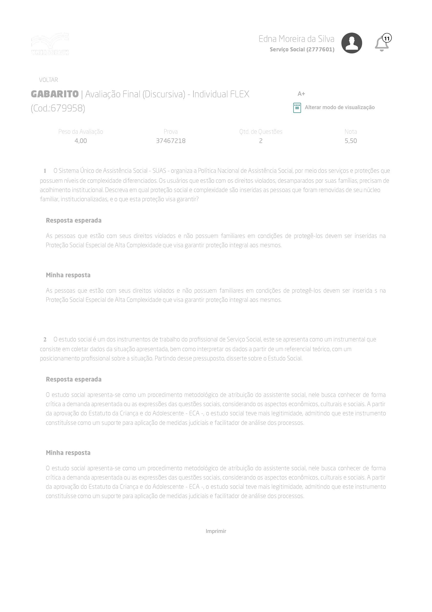 23/03/2022 20:32 AVA https://ava2.uniasselvi.com.br/subject/grades-and-tests/answer-book/eyJ0ZXN0Ijp7InRlc3RDb2RlIjoiNjc5OTU4IiwiZGVzY3JpcHRpb24iOiJBdmFsaWHDp8OjbyBGaW5hbCAoRGlzY3Vyc2l2YSkgLSBJbmRpdmlkdWF… 1/1 GABARITO | Avaliação Final (Discursiva) - Individual FLEX (Cod.:679958) Peso da Avaliação 4,00 Prova 37467218 Qtd. de Questões 2 Nota 5,50 O Sistema Único de Assistência Social - SUAS - organiza a Política Nacional de Assistência Social, por meio dos serviços e proteções que possuem níveis de complexidade diferenciados. Os usuários que estão com os direitos violados, desamparados por suas famílias, precisam de acolhimento institucional. Descreva em qual proteção social e complexidade são inseridas as pessoas que foram removidas de seu núcleo familiar, institucionalizadas, e o que esta proteção visa garantir? Resposta esperada As pessoas que estão com seus direitos violados e não possuem familiares em condições de protegê-los devem ser inseridas na Proteção Social Especial de Alta Complexidade que visa garantir proteção integral aos mesmos. Minha resposta As pessoas que estão com seus direitos violados e não possuem familiares em condições de protegê-los devem ser inserida s na Proteção Social Especial de Alta Complexidade que visa garantir proteção integral aos mesmos. O estudo social é um dos instrumentos de trabalho do profissional de Serviço Social, este se apresenta como um instrumental que consiste em coletar dados da situação apresentada, bem como interpretar os dados a partir de um referencial teórico, com um posicionamento profissional sobre a situação. Partindo desse pressuposto, disserte sobre o Estudo Social. Resposta esperada O estudo social apresenta-se como um procedimento metodológico de atribuição do assistente social, nele busca conhecer de forma crítica a demanda apresentada ou as expressões das questões sociais, considerando os aspectos econômicos, culturais e sociais. A partir da aprovação do Estatuto da Criança e do Adolescente - ECA -, o estudo social teve mais legitimidade, admitindo que este instrumento constituísse como um suporte para aplicação de medidas judiciais e facilitador de análise dos processos. Minha resposta O estudo social apresenta-se como um procedimento metodológico de atribuição do assistente social, nele busca conhecer de forma crítica a demanda apresentada ou as expressões das questões sociais, considerando os aspectos econômicos, culturais e sociais. A partir da aprovação do Estatuto da Criança e do Adolescente - ECA -, o estudo social teve mais legitimidade, admitindo que este instrumento constituísse como um suporte para aplicação de medidas judiciais e facilitador de análise dos processos. VOLTAR A+ Alterar modo de visualização 1 2 Imprimir Edna Moreira da Silva Serviço Social (2777601) 11