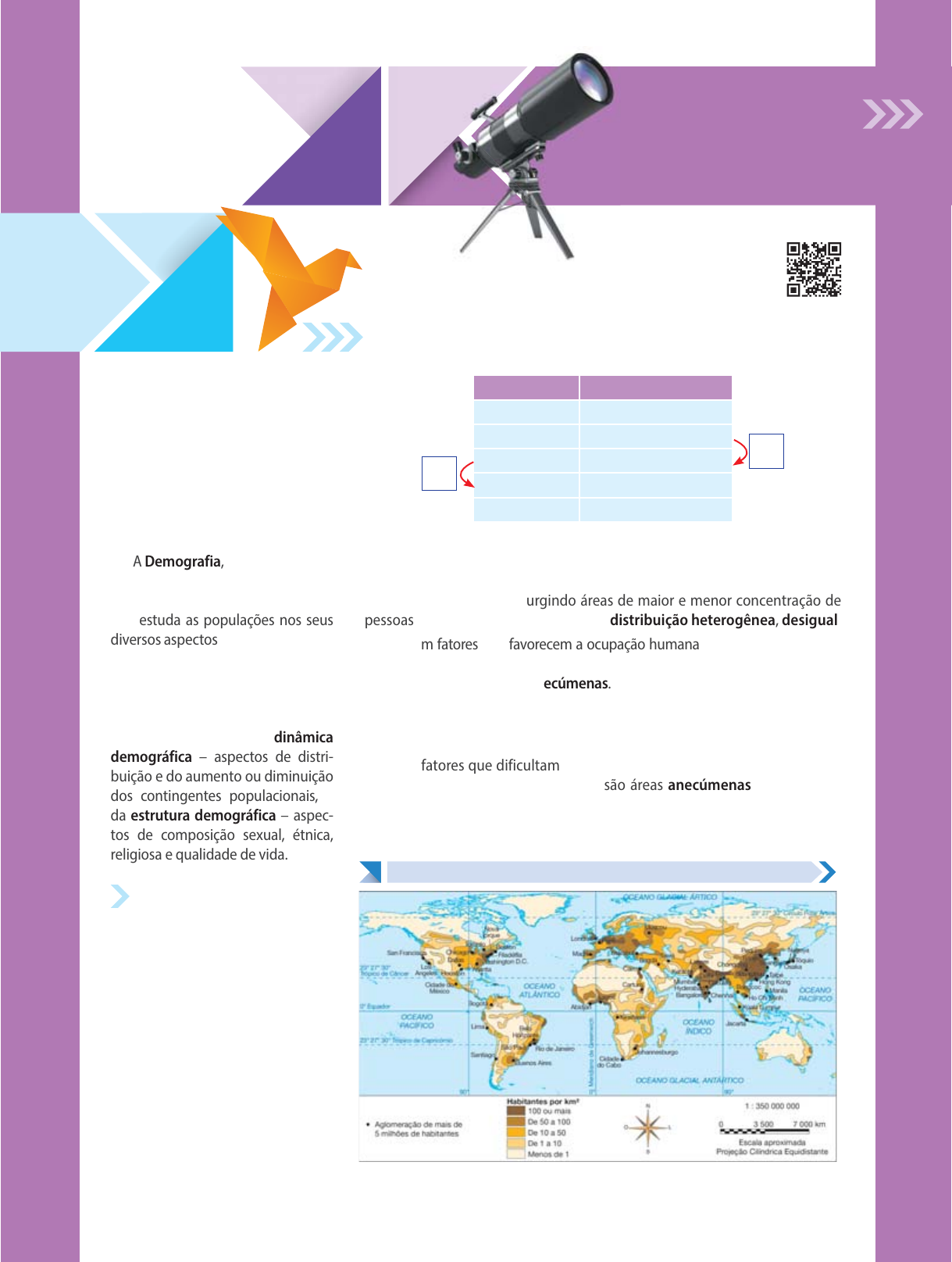 1 Demografia I – Dinâmica 01 Aula 1B Geografia Os estudos em Geografia da po- pulação apresentam informações a respeito do contingente populacio- nal que habita em um determinado espaço, e podem variar sua escala de análise desde a rua de uma pequena cidade, até o crescimento da população do planeta e suas consequências. A Demografia, palavra originada do grego (demo = povo e grafia = descrição), é o ramo da Geografia que estuda as populações nos seus diversos aspectos, como distribuição sobre a superfície terrestre, com- posição étnica/cultural e qualidade de vida. A partir disso, dividimos os estudos populacionais em duas grandes vertentes: da dinâmica demográfica – aspectos de distri- buição e do aumento ou diminuição dos contingentes populacionais, e da estrutura demográfica – aspec- tos de composição sexual, étnica, religiosa e qualidade de vida. DISTRIBUIÇÃO POPULACIONAL A população humana atingiu a marca de 7 bilhões de habitantes no ano de 2011 (ONU), trazendo uma série de discussões importantes para a atualidade, que merecem nossa atenção a respeito da qualidade de vida, modelos de desenvolvimento adotado pelos países, estilo de vida e consumo, quantidade de recursos naturais disponíveis e capacidade de produção de alimentos, etc. Período População Há 2000 anos... 250 milhões 1850 1 bilhão 1950 2,5 bilhões 1987 5 bilhões 2010 Praticamente 7 bilhões O ritmo de crescimento da população mundial vem aumentando com o passar do tempo Quando analisamos, porém, a distribuição populacional pelo Globo terrestre, as condições naturais, históricas, econômicas, sociais e culturais interferem diretamente, surgindo áreas de maior e menor concentração de pessoas, o que a caracteriza como uma distribuição heterogênea, desigual. Existem fatores que favorecem a ocupação humana, como condições natu- rais (relevo e clima), urbanização, oferta de empregos, ausências de conflitos, etc. Essas áreas são denominadas ecúmenas. Na Europa Ocidental, particularmente nas proximidades dos mares Mediterrâneo, Báltico e do Norte e nos vales fluviais do Reno, Elba, Sena, Tâmisa e Pó, localiza-se a segunda maior concentração populacional do mundo, justificada pelas atividades industriais e comerciais. Já os fatores que dificultam a fixação humana são regiões polares, gran- des cordilheiras, florestas, conflitos – são áreas anecúmenas. Podem essas ser também denominadas vazios demográficos, que não se caracterizam apenas por ausência de população, mas também por baixa concentração populacional (baixa densidade demográfica). DENSIDADE DEMOGRÁFICA GLOBAL Ta lit a Ka th y Bo ra Fonte: CHARLIER, Jacques (Org.). Atlas Du 21e siècle. Paris: Èditions Nathan, 2009. p.168. Adaptação. 37 Anos 100 Anos 2 Extensivo Terceirão Conceitos de Populoso e Povoado O número total de habitantes de um determinado lugar é denominado população absoluta. As locali- dades que apresentam grande população absoluta são consideradas populosas, a exemplo da China, Índia e Brasil. Já regiões que apresentam pequenas populações absolutas podem ser consideradas pouco populosas, a exemplo do Vaticano. Observe a tabela com os países mais populosos do mundo: 10 MAIORES POPULAÇÕES ABSOLUTAS “PAÍSES POPULOSOS” EM 2018 1.o) China 1413 milhões 2.o) Índia 1350 milhões 3.o) EUA 326 milhões 4.o) Indonésia 266 milhões 5.o) Brasil 210 milhões 6.o) Paquistão (*) 120 milhões 7.o) Nigéria 194 milhões 8.o) Bangladesh 166 milhões 9.o) Rússia 144 milhões 10.o) México 130 milhões Fonte: Banco Mundial. (*) Levando em consideração as taxas de crescimento populacional de Brasil e Paquistão, existe a expectativa de que este ultrapasse o Brasil e se torne o quinto país mais populoso do mundo nos próximos anos. Já quando se analisa concentração de pessoas por área (normalmente expressa em hab/km²), está se referindo à densidade demográfica ou população relativa. Áreas que apresentam grande concentração populacional são denominadas densamente povoadas, a exemplo de Mônaco. 10 MAIORES DENSIDADES DEMOGRÁFICAS “PAÍSES POVOADOS” EM 2018 1.o) Mônaco 15.255 hab/km2 2.o) Singapura 7.681 hab/km2 3.o) Vaticano 1.900 hab/km2 4.o) Barein 1.643 hab/km2 5.o) Maldivas 1.324 hab/km2 6.o) Malta 1.297 hab/km2 7.o) Bangladesh 1.119 hab/km2 8.o) Barbados 669 hab/km2 9.o) Taiwan 646 hab/km2 10.o) Maurício 644 hab/km2 Fonte: Banco Mundial. DISTRIBUIÇÃO POPULA- CIONAL DO BRASIL DENSIDADE DEMOGRÁFICA DO BRASIL Ta lit a Ka th y Bo ra Fonte: IBGE. Atlas geográfico escolar. 8. ed. Rio de Janeiro, 2018. Adaptação. Dentro desse contexto, o Brasil pode ser classificado como um país populoso, porém pouco povoado. Vale observar também a chamada distribuição efe- tiva da população, ou seja, a população pode estar mais concentrada em uma determinada região do país do que em outra. Tomando Brasil como exemplo, a maior parte da nossa população está fixada em uma área próxima ao litoral, por conta do clima mais ameno, condições do relevo, fatores históricos e econômicos. A qualidade de vida da população também permite a classificação de áreas. Quando as regiões apresentam grande contingente populacional, mas as condições de vida da população são muito ruins, com uma grande gama de pessoas em condições de pobreza ou extrema pobreza, temos uma área superpopulosa. Se o lugar apresentar uma grande densidade demográfica e boa parcela da população apresentar péssimas condições vida, será superpovoada. Portanto, ser um país popu- loso não indica, necessariamente, que é superpopuloso. Os principais exemplos em que se observa essa realida- de são as áreas denominadas formigueiros humanos – Na Ásia das Monções, localiza-se a maior concentração populacional do mundo que pode ser explicada pelas planícies aluviais de solos férteis, propiciando a agricul- tura de jardinagem e também a