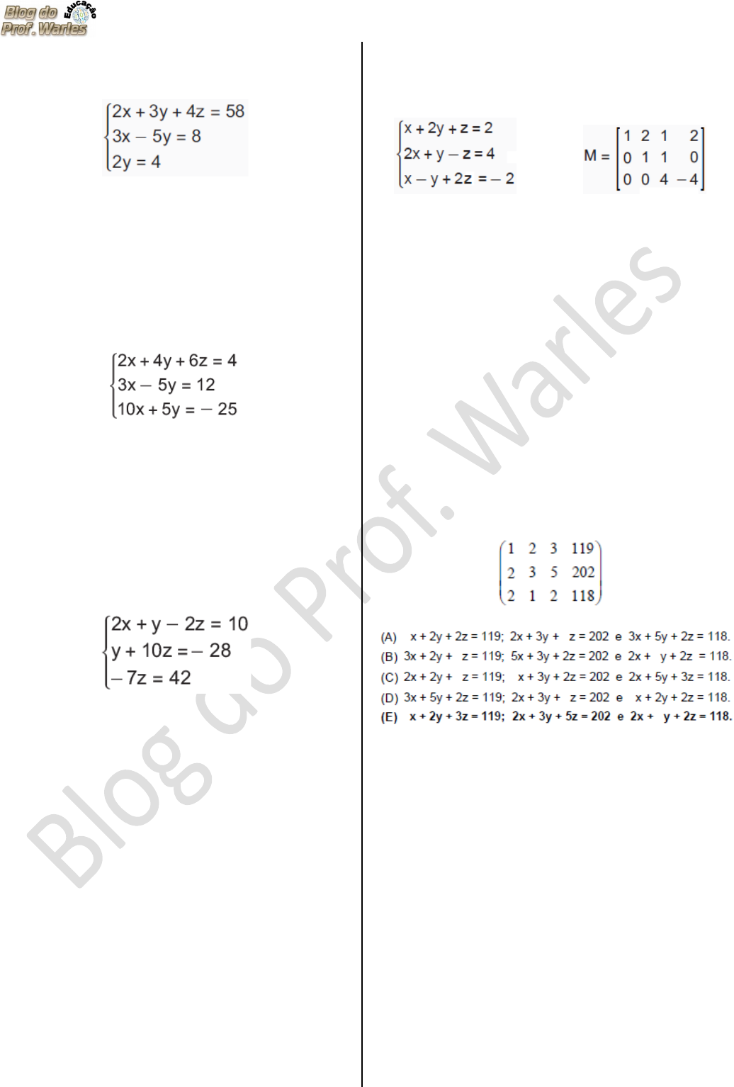 D31 –Determinar a solução de um sistema linear associando-o à uma matriz. ------------------------------------------------------------------- (SAEPE). Observe o sistema de equações lineares abaixo. A solução desse sistema é o terno ordenado A) (2, 3, 0). B) (3, – 5, 2). C) (4, 0, 0). D) (6, 2, 10). E) (58, 8, 4). ------------------------------------------------------------------- (SAEPE). Observe o sistema linear abaixo. Qual é a solução desse sistema? A) (2, 4, 6) B) (– 1, – 3, 3) C) (15, 24, 6) D) (4, 12, – 25) E) (13, 65, 390) ------------------------------------------------------------------- (SAEPE). Observe o sistema linear representado abaixo. Qual é o conjunto solução desse sistema? A) S = {(– 33, – 88, – 6)} B) S = {(– 17, 32, – 6)} C) S = {(10, – 28, 42)} D) S = {(12, 12, 24)} E) S = {(55, – 88, 6)} ------------------------------------------------------------------- (SAEP). Os ingressos para uma peça de teatro tinham dois valores: o valor integral, R$ 50,00, e o valor de meia-entrada, R$ 25,00. Ao todo, foram vendidos 150 ingressos para essa peça, o que gerou uma receita de R$ 6 000,00. Qual foi a quantidade de ingressos de meia-entrada vendidos para essa peça de teatro? A) 30 B) 40 C) 60 D) 75 E) 80 ------------------------------------------------------------------- (SAEPI). A matriz M é a forma escalonada do sistema a seguir: A solução desse sistema é o terno A) (0, 1, 0). B) (1, – 3, – 4). C) (1, 1, – 1). D) (1, 2, 1). E) (2, 0, 4). ------------------------------------------------------------------- Isabel, Helena e Carla saíram às compras e adquiriram mercadorias iguais, porém, em quantidades diferentes. Isabel comprou uma sandália, duas saias e três camisetas, gastando um total de R$ 119,00. Helena comprou duas sandálias, três saias e cinco camisetas, gastando um total de R$ 202,00. Carla comprou duas sandálias, uma saia e duas camisetas, gastando um total de R$ 118,00. Para determinar os preços x, y e z da sandália, da saia e da camiseta, respectivamente, resolve-se o sistema dado por: O sistema associado a essa matriz é: (Resp. E) ------------------------------------------------------------------- Uma loja vende certo componente eletrônico, que é fabricado por três marcas diferentes X, Y e Z. Um levantamento sobre as vendas desse componente, realizado durantes três dias consecutivos revelou que: · No 1º dia, foram vendidos dois componentes da marca X, um da marca Y e um da marca Z, resultando um total de vendas igual a R$ 150,00; · No 2º dia, foram vendidos quatro componentes da marca X, três da marca Y e nenhum da marca Z, num total de R$ 240,00; · No último dia, não houve vendas da marca X, mas foram vendidos cinco da marca Y e três da marca Z, totalizando R$ 350,00. Para determinar os preços dos componentes da marca X, Y e Z, respectivamente, resolve-se o sistema dado por: O sistema associado a essa matriz é: (A) ; ; (B) ; ; (C) ; ; (D) ; ; (E) ; ; ------------------------------------------------------------------- Em um restaurante são servidos três tipos de salada: x, y e z. Num dia de movimento, observaram-se os clientes M, N e K. · O cliente M serviu-se de 200g de salada x, 300g da y e 100g da z e pagou R$ 5,50 pelo seu prato. · O cliente N fez seu prato com 150g da salada x, 250g da y e 200g da z e pagou R$ 5,85. · Já o cliente K serviu-se de 120g da salada x, 200g da y e 250g da z e pagou R$ 5,76. Para determinar os preços dos componentes da salada x, y e z, respectivamente, resolve-se o sistema dado por: O sistema associado a essa matriz é: (A) ; ; (B) ; ; (C) ; ; (D) ; ; (E) ; ; ------------------------------------------------------------------- A matriz está associada ao sistema: (A) (B) (C) (D) (E) ------------------------------------------------------------------- A solução do sistema é: (A) (–1, –2, 1) (B) (1, 2, –1) (C) (1, 0, 1) (D) (–1, 2, 1) (E) (–1, 0, 1) ------------------------------------------------------------------- (Enceja 2005). A loja COMPROU GANHOU apresentou as quantidades vendidas do Produto A e do Produto B, por meio da tabela abaixo: No mês seguinte, as quantidades vendidas dos mesmos produtos foram reduzidas pela metade. A matriz que representa esta situação é (resp. B) ------------------------------------------------------------------- (1ª P.D – 2012). Observe o sistema a seguir: Das alternativas a seguir a que representa a solução correta do sistema é (A) (2, 1, 3) (B) (–2, 1, –3) (C) (2, –1, 3) (D) (–2, –1, –3) (E) (2, 1, –3) ------------------------------------------------------------------- (Saerj). Um funcionário do depósito separou as peças guardadas por peso, marcando com a mesma cor as peças de pesos iguais. O dono do depósito observou três pedidos e os seus respectivos pesos: um pedido contendo uma peça amarela, uma azul e uma verde pesou 100 g; outro pedido contendo duas peças amarelas, uma azul e três verdes pesou 200 g; e um pedido contendo uma peça amarela, duas azuis e quatro verdes pesou 250 g. Com essas informações, o dono construiu um sistema de equações e conseguiu, então, calcular o peso de cada peça. Um sistema que permite calcular o peso de cada peça é (Resp. A) ------------------------------------------------------------------- (SPAECE). A solução do sistema linear é A) (5, 3 ,1) B) (2, 1, 0) C) (5, 4, 2) D) (4, 3, 1) E) (9, 8, 6). ------------------------------------------------------------------- (SAEPE). A solução do sistema , em , é A) {(1, 3, 3)} B) {(– 31, – 10, – 3)} C) {(31, – 10, – 3)} D) {(– 1, 4, 4)} E) {(– 1, 2, 3)} ------------------------------------------------------------------- (SAEPE). Resolva o sistema abaixo. Qual é a solução desse sistema? A) (-1, 1, 3) B) (1, 0, 3) C) (-1, 3, 3) D) (0, 1, 2) E) (-1, 2,1) ------------------------------------------------------------------- (PROEB). Veja o sistema linear abaixo. A solução desse sist