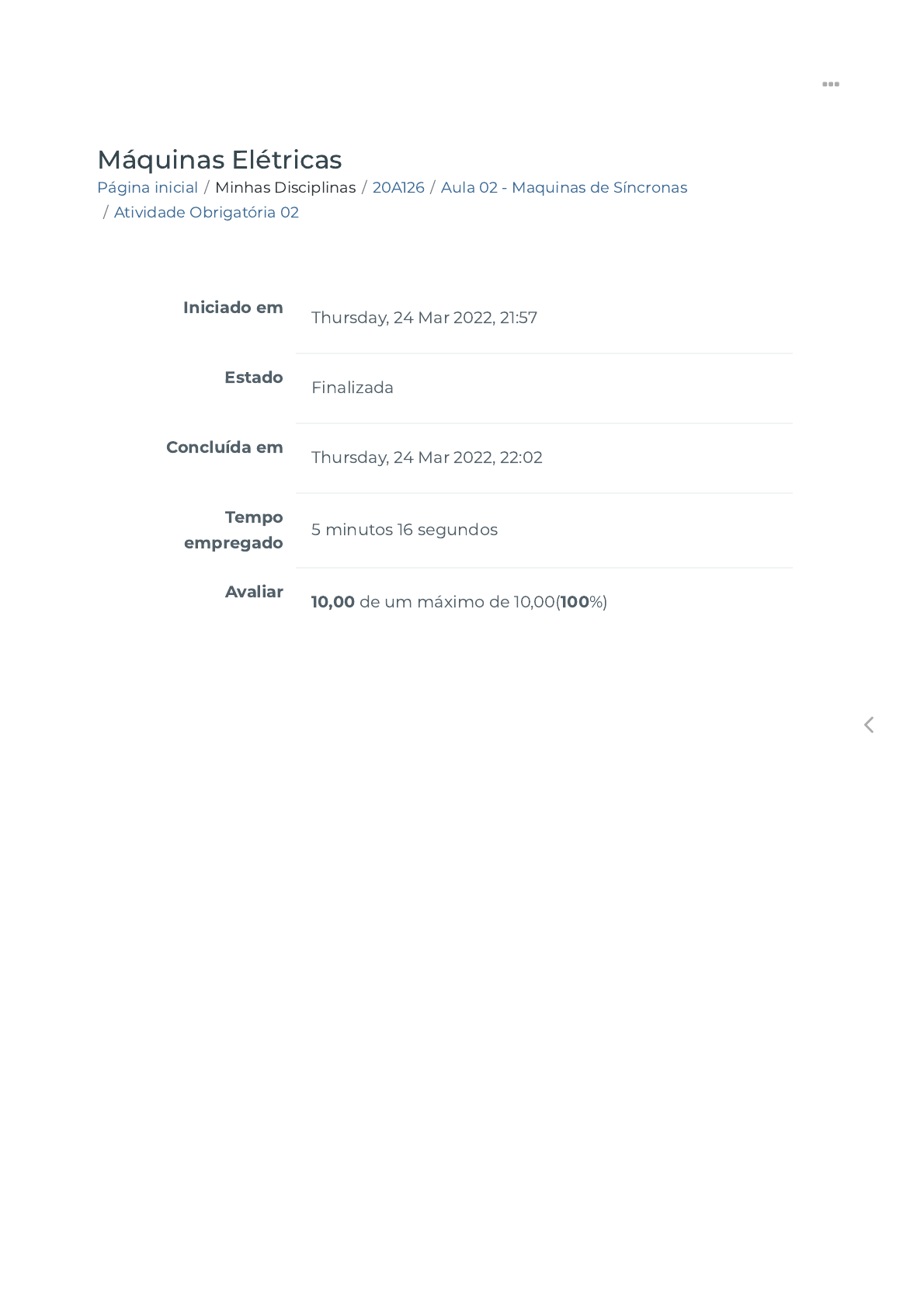 24/03/2022 22:02 Atividade Obrigatória 02 https://ava.politecnicabr.com.br/mod/quiz/review.php?attempt=2803222 1/6 Página inicial / Minhas Disciplinas / 20A126 / Aula 02 - Maquinas de Síncronas / Atividade Obrigatória 02 Máquinas Elétricas Iniciado em Thursday, 24 Mar 2022, 21:57 Estado Finalizada Concluída em Thursday, 24 Mar 2022, 22:02 Tempo empregado 5 minutos 16 segundos Avaliar 10,00 de um máximo de 10,00(100%) https://ava.politecnicabr.com.br/ https://ava.politecnicabr.com.br/course/view.php?id=963 https://ava.politecnicabr.com.br/course/view.php?id=963#section-3 https://ava.politecnicabr.com.br/mod/quiz/view.php?id=32509 https://ava.politecnicabr.com.br/ 24/03/2022 22:02 Atividade Obrigatória 02 https://ava.politecnicabr.com.br/mod/quiz/review.php?attempt=2803222 2/6 Questão 1 Correto Atingiu 2,00 de 2,00 Em uma indústria, uma máquina síncrona é instalada para melhorar o fator de potência da instalação. Sabendo que nessa indústria, existem 800kVA de motores de indução, com fator de potência igual a 0,82 em atraso. A potência para a máquina síncrona a ser instalada é 500kVA, com fator de potência unitário. Qual o fator de potência da indústria após a instalação da máquina síncrona? (considerar duas casas decimais. Escolha uma opção: a. 0,03 b. 1,39 c. 1,63 d. 0,93 e. 0,39 https://ava.politecnicabr.com.br/ 24/03/2022 22:02 Atividade Obrigatória 02 https://ava.politecnicabr.com.br/mod/quiz/review.php?attempt=2803222 3/6 Questão 2 Correto Atingiu 2,00 de 2,00 Considere um motor acionando uma carga de 20CV, tal que sua e�ciência para esta condição de carga é 93%. O fator de potência de operação é 0,89 e deseja-se corrigi-lo para 0,93. Qual a potência reativa de capacitores necessária em KVAr? (considerar duas casas decimais). Escolha uma opção: a. 2,85 b. 0,35 c. 3,85 d. 1,85 e. 0,85 https://ava.politecnicabr.com.br/ 24/03/2022 22:02 Atividade Obrigatória 02 https://ava.politecnicabr.com.br/mod/quiz/review.php?attempt=2803222 4/6 Questão 3 Correto Atingiu 2,00 de 2,00 Considere uma máquina síncrona de 4 pólos sendo acionada a 1800 rpm por uma máquina motriz. Se o número de espiras de um enrolamento da máquina for igual a 250, o fator de enrolamento igual a 0,9 e o �uxo pó pólo igual a 10-3 Wb, qual a tensão gerada nesse enrolamento em V? (considerar duas casas decimais) Escolha uma opção: a. 49,49 b. 69,94 c. 59,49 d. 39,49 e. 59,94 https://ava.politecnicabr.com.br/ 24/03/2022 22:02 Atividade Obrigatória 02 https://ava.politecnicabr.com.br/mod/quiz/review.php?attempt=2803222 5/6 Questão 4 Correto Atingiu 2,00 de 2,00 Considere uma máquina síncrona com 8 pólos. Se a fonte de alimentação deste motor for uma fonte de tensão 110V/50Hz, qual a velocidade de rotação deste motor? Escolha uma opção: Questão 5 Correto Atingiu 2,00 de 2,00 Uma máquina síncrona é uma máquina elétrica cuja rotação é proporcional à frequência da rede à qual está conectado. Escolha uma opção: 750m/s 750km/h 750rpm 750A Verdadeiro Falso https://ava.politecnicabr.com.br/ 24/03/2022 22:02 Atividade Obrigatória 02 https://ava.politecnicabr.com.br/mod/quiz/review.php?attempt=2803222 6/6 © 2022 - Escola Politécnica Brasileira Entre em Contato https://www.politecnicabr.com.br 0800 084 2627 indisponível devido a pandemia de COVID-19, use outro canal! 0800 084 2627 comercial@politecnicabr.com.br Links Úteis Dicas da nossa Diretora Acadêmica Planner de Estudos Declaração de Matrícula Orientações do AVA Abertura de Ticket Fale com o Tutor Cronograma de Estudos Manual de Estágio Manual de Competência Siga-nos nas redes sociais https://ava.politecnicabr.com.br/mod/quiz/0 https://www.politecnicabr.com.br/ mailto:comercial@politecnicabr.com.br https://soundcloud.com/user-501638417/sets/escola-politecnica-brasileira https://storage.googleapis.com/sirius-pubstore/semestre_plannerdeestudo%20poli.pdf https://storage.googleapis.com/sirius-pubstore/declaracao_matricula.pdf https://storage.googleapis.com/sirius-pubstore/orientacoes_ava.pdf https://storage.googleapis.com/sirius-pubstore/abertura_ticket.pdf https://storage.googleapis.com/sirius-pubstore/fale_com_tutor.pdf https://storage.googleapis.com/sirius-pubstore/cronograma_estudos.pdf https://storage.googleapis.com/sirius-pubstore/manual_estagio.pdf https://storage.googleapis.com/sirius-pubstore/manual_competencia.pdf https://www.facebook.com/politecnicabr https://www.instagram.com/politecnicabr_oficial https://ava.politecnicabr.com.br/
