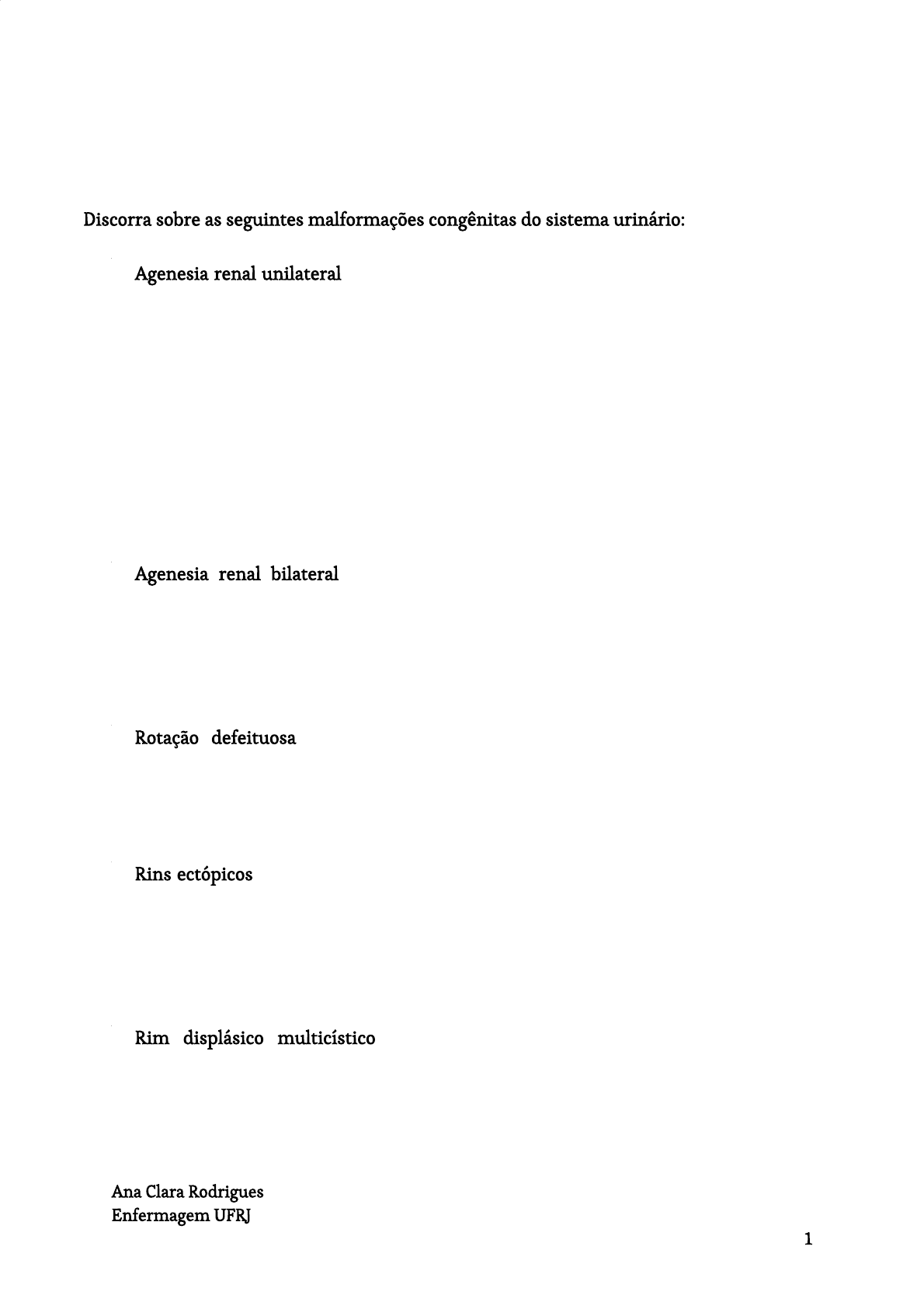 Embriologi� d� sistem� urinári� Discorra sobre as seguintes malformações congênitas do sistema urinário: 1. Agenesia renal unilateral - corresponde a uma malformação frequente, ocorrendo em um a cada mil nascidos, proveniente de algum defeito precoce durante o período embrionário que impede a formação correta dos dois rins,muitos casos resultam da involução intrauterina completa de um rim displásico multicístico. Em geral, é acompanhada por agenesia ureteral com ausência do trígono ipsilateral e do orifício ureteral. No entanto, a glândula adrenal ipsilateral não é afetada. Não é necessário nenhum tratamento,a hipertrofia compensatória do rim solitário mantém a função renal normal. Como os rins compartilham uma origem embriológica comum com os ductos deferentes e o útero, meninos podem ter agenesia do canal deferente e as meninas podem ter anomalias uterinas. 2. Agenesia renal bilateral - Está associada ao oligoidrâmnio devido a pouca ou nenhuma urina excretada na cavidade amniótica,essa condição ocorre em aproximadamente um em cada três mil nascimentos e é três vezes mais comum em homens e incompatível com a vida pós-natal.A falha na penetração do divertículo metanéfrico no blastema metanéfrico resulta na ausência do desenvolvimento renal. 3. Rotação defeituosa - Se os rins não sofrem rotação,o hilo fica posicionado anteriormente (posição embrionária). Se o hilo se posiciona posteriormente,então a rotação foi excessiva; se ele se posiciona lateralmente, ocorre uma rotação medial. A rotação anormal dos rins está frequentemente associada aos rins ectópicos. 4. Rins ectópicos - A ectopia renal refere-se a um rim situado em qualquer local que não seja a fossa renal,origina-se da falta de migração do rim na vida embrionária da pelve até a sua posição definitiva e da falta de rotação lateromedial que acompanha a ascensão.O rim ectópico pode ser pélvico, ilíaco, abdominal, intratorácico, contralateral ou cruzado. 5. Rim displásico multicístico - Nessa condição, há uma unidade renal não funcionante que consiste em cistos não comunicantes com interposição de tecido sólido composto de fibrose, túbulos primitivos e focos de cartilagem. Em geral, também há atresia ureteral. Ana Clara Rodrigues Enfermagem UFRJ 1 6. Duplicações do trato urinário - resulta da divisão precoce do broto ureteral,a divisão pode ser parcial ou completa e o tecido metanéfrico pode ser dividido em duas partes, cada uma com sua própria pelve renal e ureter. porém mais frequentemente, as duas partes compartilham alguns lobos como resultado do entrelaçamento dos túbulos coletores.Em casos raros, um ureter se abre na bexiga e o outro é ectópico, penetrando na vagina, na uretra ou no vestíbulo.Essa anomalia é resultado do desenvolvimento de dois brotos ureterais. Um dos brotos,em geral, tem posicionamento normal,enquanto o broto anormal se move para baixo, junto com o ducto mesonéfrico. Assim, ele tem uma entrada baixa, anormal, na bexiga, na uretra, na vagina ou na região epididimal 7. Ureter ectópico - .A ectopia ureteral é uma anomalia congênita, resultante de uma falha na diferenciação dos ductos mesonéfricos e metanéfricos durante a embriogênese, caracterizada por uma localização anormal do segmento terminal, de um ou de ambos os ureteres, fora da região do trígono vesical. Nos homens, um ureter ectópico pode se abrir no colo da bexiga, na parte prostática da uretra, nos ductos deferentes, no utrículo da próstata ou na vesícula seminal. Nas mulheres, um ureter ectópico pode penetrar no colo da bexiga, na uretra, na vagina ou no vestíbulo da vagina. 8. Malformações do úraco - Um remanescente da luz geralmente persiste na parte inferior do úraco nas crianças.Remanescentes do revestimento epitelial do úraco podem originar os cistos do úraco,a extremidade inferior patente do úraco pode se dilatar para formar um seio do úraco que se abre na bexiga,a luz na parte superior do úraco pode também permanecer e formar um seio do úraco que se abre no umbigo. 9. Megacistis congênita - resulta de uma desordem congênita do divertículo metanéfrico,que pode estar associada a uma dilatação da pelve renal e cálices renais com pontas obtusas. 10. Extrofia da bexiga - A extrofia da bexiga é uma anomalia severa que afeta predominantemente os homens,caracteriza-se pela exposição e protusão da parede posterior da bexiga, é causada pelo fechamento incompleto da parte inferior da parede abdominal anterior. Ana Clara Rodrigues Enfermagem UFRJ 2