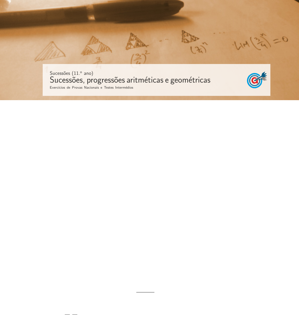 Sucessões (11.o ano) Sucessões, progressões aritméticas e geométricas Exerćıcios de Provas Nacionais e Testes Intermédios 1. Seja (un) a sucessão definida por un = 2n + 1 Determine, sem recorrer à calculadora, a soma dos primeiros duzentos termos de ordem ı́mpar da sucessão (un) Exame – 2021, Ép. especial 2. Seja (un) uma progressão aritmética. Sabe-se que, relativamente a (un), a soma do sexto termo com o vigésimo é igual a −5 e que o décimo nono termo é igual ao quádruplo do sétimo termo. Determine a soma dos dezasseis primeiros termos desta progressão. Exame – 2021, 2.a Fase 3. Seja (vn) uma progressão geométrica. Sabe-se que v5 = 4 e que v8 = 108 Qual é o valor de v6? (A) 12 (B) 24 (C) 48 (D) 60 Exame – 2021, 1.a Fase 4. Seja (un) a sucessão definida por un = 2 + (−1)n+1 n Determine, sem recorrer à calculadora, quantos termos de ordem ı́mpar da sucessão (un) pertencem ao intervalo [ 83 41 , 67 33 ] Exame – 2021, 1.a Fase mat.absolutamente.net 5. Considere uma progressão geométrica não monótona (un) Sabe-se que u3 = 1 12 e que u18 = 4u20 Determine uma expressão do termo geral de (un) Apresente essa expressão na forma a× bn, em que a e b são números reais. Exame – 2020, Ép. especial 6. Considere a sucessão (vn) definida, por recorrência, por vn = v1 = 2 vn+1 = 1 vn , para qualquer número natural n Qual das afirmações seguintes é verdadeira? (A) A sucessão (vn) é uma progressão aritmética. (B) A sucessão (vn) é uma progressão geométrica. (C) A sucessão (vn) é monótona. (D) A sucessão (vn) é limitada. Exame – 2020, Ép. especial 7. De uma progressão aritmética (un) sabe-se que o sétimo termo é igual ao dobro do segundo e que a soma dos doze primeiros termos é igual a 57 Sabe-se ainda que 500 é termo da sucessão (un) Determine a ordem deste termo. Exame – 2020, 2.a Fase 8. Seja (vn) a sucessão definida por vn = n se n < 10 1 + 1 n se n ≥ 10 Qual das afirmações seguintes é verdadeira? (A) A sucessão (vn) tem limite nulo. (B) A sucessão (vn) é divergente. (C) A sucessão (vn) é limitada. (D) A sucessão (vn) é monótona. Exame – 2020, 2.a Fase 2/5 https://mat.absolutamente.net/joomla/index.php/recursos/fichas-de-trabalho/matematica-a#sucess%C3%B5es mat.absolutamente.net 9. Considere a sucessão (un) de termo geral un = 8n− 4 n + 1 Estude a sucessão (un) quanto à monotonia. Exame – 2020, 1.a Fase 10. Considere a sucessão (un) de termo geral un = (−1)n+1 n + 1 Determine a menor ordem a partir da qual todos os termos da sucessão (un) são maiores do que –0,01 Exame – 2019, Ép. especial 11. Sejam a e b dois números reais diferentes de zero. Sabe-se que 2, a e b são três termos consecutivos de uma progressão geométrica. Sabe-se ainda que a− 2, b e 2 são três termos consecutivos de uma progressão aritmética. Determine a e b Exame – 2019, 2.a Fase 12. Seja r um número real maior do que 1 Sabe-se que r é a razão de uma progressão geométrica de termos positivos. Sabe-se ainda que, de dois termos consecutivos dessa progressão, a sua soma é igual a 12 e a diferença entre o maior e o menor é igual a 3 Determine o valor de r Exame – 2019, 1.a Fase 13. Considere a sucessão (un) de termo geral un = n + 5 n + 3 Estude a sucessão (un) quanto à monotonia. Exame – 2018, Ép. especial 14. De uma progressão aritmética (un) sabe-se que o terceiro termo é igual a 4 e que a soma dos doze primeiros termos é igual a 174 Averigue se 5371 é termo da sucessão (un) Exame – 2018, 2.a Fase 3/5 https://mat.absolutamente.net/joomla/index.php/recursos/fichas-de-trabalho/matematica-a#sucess%C3%B5es mat.absolutamente.net 15. Seja a um número real. Sabe-se que a, a + 6 e a + 18 são três termos consecutivos de uma progressão geométrica. Relativamente a essa progressão geométrica, sabe-se ainda que a soma dos sete primeiros termos é igual a 381 Determine o primeiro termo dessa progressão. Exame – 2018, 1.a Fase 16. Seja (un) uma sucessão real em que todos os termos são positivos. Sabe-se que, para todo o número natural n, un+1 un < 1 Qual das afirmações seguintes é verdadeira? (A) A sucessão (un) é limitada. (B) A sucessão (un) é uma progressão aritmética. (C) A sucessão (un) é crescente. (D) A sucessão (un) é um infinitamente grande. Exame – 2017, Ép. especial 17. Seja (un) a sucessão definida por un = ( 1 2 )1−n Qual das afirmações seguintes é verdadeira? (A) A sucessão (un) é uma progressão geométrica de razão 1 2 (B) A sucessão (un) é uma progressão geométrica de razão 2 (C) A sucessão (un) é uma progressão aritmética de razão 1 2 (D) A sucessão (un) é uma progressão aritmética de razão 2 Exame – 2017, 2.a Fase 18. Seja (un) a sucessão definida por un = n se n ≤ 20 (−1)n se n > 20 Qual das afirmações seguintes é verdadeira? (A) A sucessão (un) é monótona crescente. (B) A sucessão (un) é monótona decrescente. (C) A sucessão (un) é limitada. (D) A sucessão (un) é um infinitamente grande. Exame – 2017, 1.a Fase 4/5 https://mat.absolutamente.net/joomla/index.php/recursos/fichas-de-trabalho/matematica-a#sucess%C3%B5es mat.absolutamente.net 19. De uma progressão geométrica (un), monótona crescente, sabe-se que u4 = 32 e que u8 = 8192 Qual é o quinto termo da sucessão (un)? (A) 64 (B) 128 (C) 256 (D) 512 Exame – 2016, 2.a Fase 20. De uma progressão geométrica (an), sabe-se que o terceiro termo é igual a 1 4 e que o sexto termo é igual a 2 Qual é o valor do vigésimo termo? (A) 8192 (B) 16 384 (C) 32 768 (D) 65 536 Exame – 2015, Ép. especial 21. Qual das expressões seguintes é termo geral de uma sucessão monótona e limitada? (A) (−1)n (B) (−1)n.n (C) − 1 n (D) 1 + n2 Exame – 2015, 2.a Fase 22. Seja a um número real. Considere a sucessão (un) definida por u1 = a un+1 = −3un + 2, ∀n ∈ N Qual é o terceiro termo desta sucessão? (A) 6a + 4 (B) 9a− 4 (C) 6a− 4 (D) 9a + 4 Exam