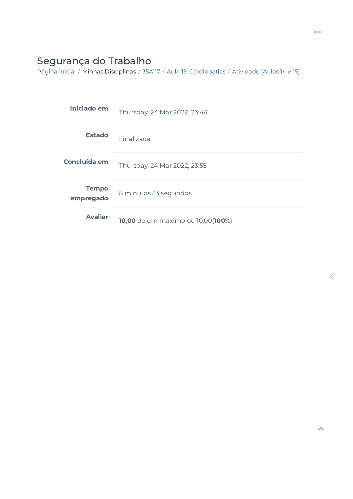 24/03/2022 23:55 Atividade (Aulas 14 e 15) https://ava.politecnicabr.com.br/mod/quiz/review.php?attempt=2803605 1/12 Página inicial / Minhas Disciplinas / 35A117 / Aula 15: Cardiopatias / Atividade (Aulas 14 e 15) Segurança do Trabalho Iniciado em Thursday, 24 Mar 2022, 23:46 Estado Finalizada Concluída em Thursday, 24 Mar 2022, 23:55 Tempo empregado 8 minutos 33 segundos Avaliar 10,00 de um máximo de 10,00(100%) https://ava.politecnicabr.com.br/ https://ava.politecnicabr.com.br/course/view.php?id=1039 https://ava.politecnicabr.com.br/course/view.php?id=1039#section-17 https://ava.politecnicabr.com.br/mod/quiz/view.php?id=25537 https://ava.politecnicabr.com.br/ 24/03/2022 23:55 Atividade (Aulas 14 e 15) https://ava.politecnicabr.com.br/mod/quiz/review.php?attempt=2803605 2/12 Questão 1 Correto Atingiu 1,00 de 1,00 Marque a alternativa correta sobre doenças ocupacionais: Escolha uma opção: a. Tuberculose cutânea - consequência de dermites crônicas de longa duração, provocadas por exposição a alcatrão, asfalto, para�nas, petróleo, fuligem, creosoto, óleos minerais, compostos arsenicais, sol (radiação ultravioleta) e radiações (raios X, alfa, beta e gama). b. Dermites ou dermatites irritativas - provocada por substância em contato com a pele, provocando de imediato: ardência, mácula (vermelhidão), edema, vesículas. Causadas por fertilizantes amoniacais, aditivos para alimentos de animais, plantas e herbicidas. c. Piodermites - con�itos emocionais têm sido os causadores pelo surgimento ou agravo. d. Exemplos de Eczemas de contato ou alérgicos: foliculite, furúnculo, impetigo, que são pequenas bolhas, a paroníquia bacteriana e a erisipela, apresentam secreção purulenta. https://ava.politecnicabr.com.br/ 24/03/2022 23:55 Atividade (Aulas 14 e 15) https://ava.politecnicabr.com.br/mod/quiz/review.php?attempt=2803605 3/12 Questão 2 Correto Atingiu 1,00 de 1,00 Assinale (V) Verdadeiro e (F) Falso, quanto os tipos de lesões. ( ) Pústula - Saliência epidérmica, uma tumefação, que é uma elevação da pele que contém em seu interior líquido purulento, apresenta processo de in�amatório. ( ) Mácula - Grande bolha possuindo em seu interior um líquido seroso-cítrico, acima de 20 cm. ( ) Vesícula - Alteração severa do tecido, sua cicatrização pode ser de longo prazo, comumente conhecida como ferida ou escara. ( ) Pápula - Saliência tumefata e endurecida e perceptível à palpação, seu tamanho é variado. Escolha uma opção: a. V, F, F, V. b. F, V, V, F. c. V, F, V, V. d. V, F, F, F. e. F, F, F, V. https://ava.politecnicabr.com.br/ 24/03/2022 23:55 Atividade (Aulas 14 e 15) https://ava.politecnicabr.com.br/mod/quiz/review.php?attempt=2803605 4/12 Questão 3 Correto Atingiu 1,00 de 1,00 Assinale (V) Verdadeiro ou (F) Falso, referente a cardiopatias. ( ) O termo “infarto” quer dizer “obstrução”. O �uxo sanguíneo cessa e os vasos coronários �cam ocluídos e atinge um colapso no �uxo colateral, esse processo leva ao infarto do músculo do coração. A musculatura cardíaca, por sua vez, é denominada miocárdio; portanto, infarto agudo do miocárdio. ( ) Trombogênese é a coagulação sanguínea e está relacionada com fatores dietéticos de curta duração e eventos que afetam o estilo de vida. ( ) O termo “hipertensão arterial sistêmica” indica que há uma pressão nas artérias de forma generalizada, em todo o corpo, fazendo com que o sistema exerça uma mensagem rápida para entrar em equilíbrio. O mecanismo da elevação arterial é simples, pois na ingestão de “sal”, o organismo pede água para diluir essa substância, com isso aumenta também o volume de líquido no corpo. Escolha uma opção: a. V, F, F. b. V, V, F. c. V, F, V. d. V, V, V. e. F, V, V. https://ava.politecnicabr.com.br/ 24/03/2022 23:55 Atividade (Aulas 14 e 15) https://ava.politecnicabr.com.br/mod/quiz/review.php?attempt=2803605 5/12 Questão 4 Correto Atingiu 1,00 de 1,00 Os bovinos, caprinos, equinos, ovinos suínos, e outros animais podem transmitir parasitas, vírus, protozoários ou fungos que agridem a pele dos trabalhadores que o manipulam. Existem fatores que favorecem os desenvolvimentos ou agravo das dermatoses: Escolha uma opção: a. Todas as alternativas corretas. b. Concentração do agente agressor, a presença do agente agressor, em menor ou maior escala, determina a intensidade da dermatose. c. A higiene pessoal contribui signi�cativamente para a diminuição ou impedimento de agentes patológicos. Pontos favoráveis com a assepsia das mãos, roupas limpas, remoção de produtos químicos. d. Pessoas alérgicas estão mais predispostas a lesões do tipo eczematoso. e. Estado nutricional, de�ciências vitamínicas e proteicas, distúrbios emocionais, infecções crônicas. https://ava.politecnicabr.com.br/ 24/03/2022 23:55 Atividade (Aulas 14 e 15) https://ava.politecnicabr.com.br/mod/quiz/review.php?attempt=2803605 6/12 Questão 5 Correto Atingiu 1,00 de 1,00 Assinale (V) Verdadeiro e (F) Falso. ( ) A dermatose ocupacional é vista como um processo cutâneo mórbido, é acometida pela ação de vírus no desempenho das atividades, num período de sensibilização às reações orgânicas. ( ) Dermatoses são alterações cutâneas apresentadas diante de uma exposição externa por substâncias químicas. Em determinadas situações, há constatação da correlação entre causa e efeito. O pro�ssional de saúde deve veri�car se a patologia existia antes do início das atividades laborais e solicitar o afastamento, esses são os primeiros passos para investigar a probabilidade de contato com as substâncias. ( ) Erupção cutânea apresenta como obstrução das glândulas sudoríparas, principalmente regiões cobertas pela roupa. Inicialmente aparecem pequenas pápulas, que são pequenas elevações na epiderme sobre a pele avermelhada, evoluindo para vesículas contendo líquido cítrico claro. ( ) A epiderme pode desen