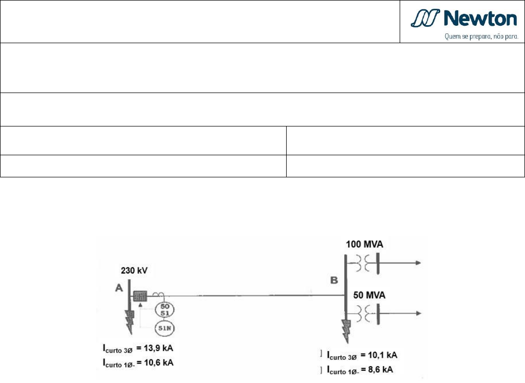 Dado o diagrama abaixo: No sistema elétrico abaixo os relés de fase são do tipo IAC52B101A e o de Neutro IAC52B3A. O TC é do tipo de alta reatância com classe de exatidão de 10%, fator de sobrecorrente de FS=15. A impedância interna do secundário do TC é de 0,35 ohms. Os relés estão distanciados de 150 m dos TCs e a fiação é a de cobre de 16 mm². 1. Dimensionar o TC pela ABNT; 2. Calcular a corrente de ajuste do rele de fase 51; 3. Calcular a corrente de ajuste do rele de neutro 50 como sendo múltiplo do TAP do rele 51; 4. Calcular corrente de ajuste do relé de neutro (51N) IAC52B3A, de modo a suportar um desequilíbrio de 30%; 5. Calcular a carga máxima do TC para uma corrente nominal in= 5A; Instituto de Ciências Exatas Newton de Paiva - Unidade Buritis I Lista de Exercício: Nº 5 – Valor: 05 Pontos Professor: Edgard Pereira Cardoso Disciplina: Proteção do Sistema Elétrico de Potência Curso: Engenharia Elétrica Data da entrega: 30/11/2021 Aluno (a): RA: