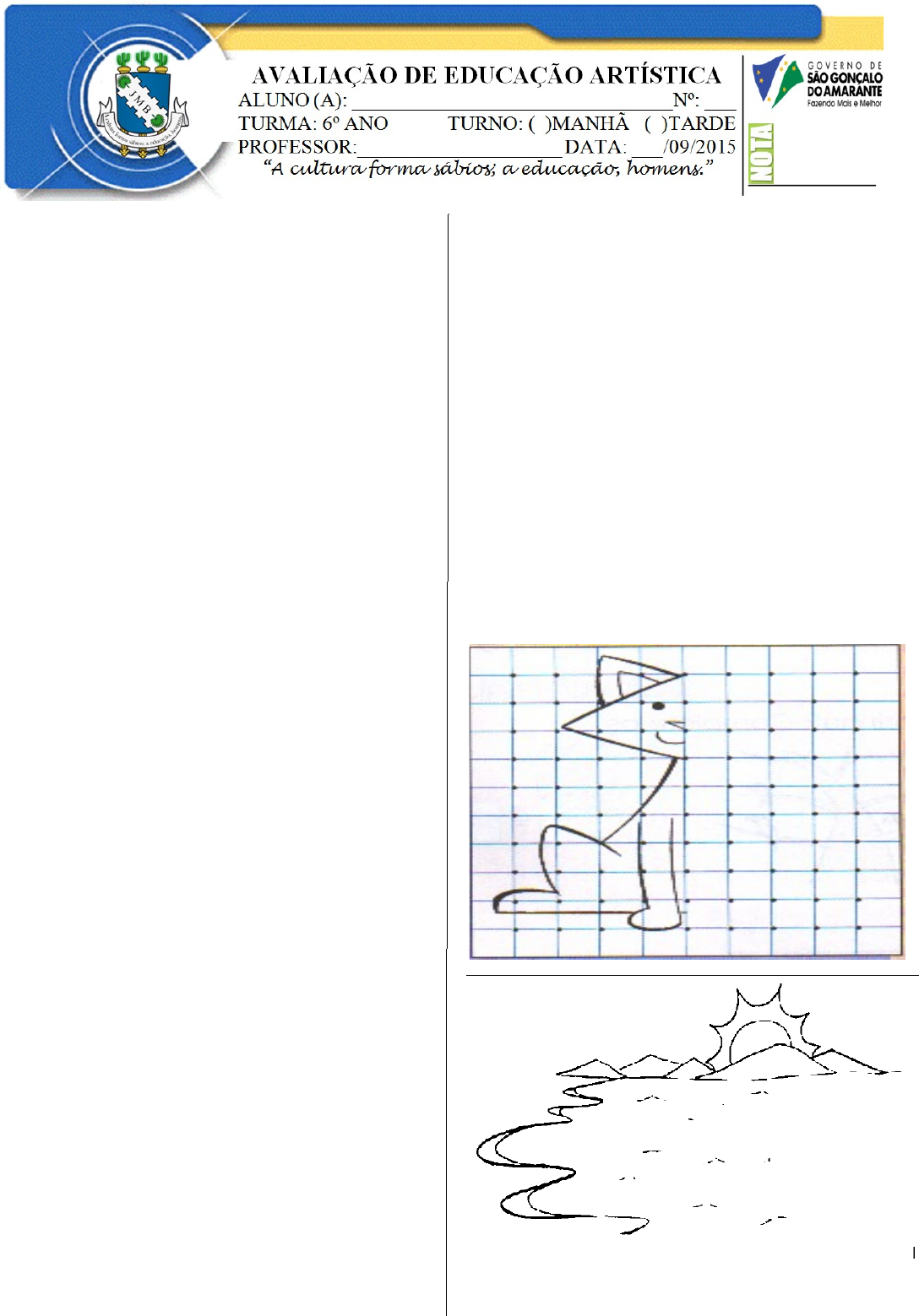 Leia o texto para responder as próximas 3 questões: ARTES VISUAIS O mundo da arte é concreto e vivo podendo ser observado, compreendido e apreciado. Através da experiência artística o ser humano desenvolve sua imaginação e criação aprendendo a conviver com seus semelhantes, respeitando as diferenças e sabendo modificar sua realidade. A arte dá e encontra forma e significado como instrumento de vida na busca do entendimento de quem somos, onde estamos e o que fazemos no mundo. Desta maneira, quando o ser humano faz arte, ele cria um objeto artístico que não precisa nos mostrar exatamente como as coisas são no mundo natural ou vivido e sim, como as coisas podem ser, de acordo com a sua visão. A função da arte e o seu valor, portanto, não estão no retrato fiel da realidade, mas sim, na representação simbólica do mundo humano. Para existir a arte são precisos três elementos: o artista, o observador e a obra de arte. O ser humano, ao longo de seu desenvolvimento, tem procurado encontrar formas de registrar essa imaginação ou realidade captada, através de pinturas, desenhos, esculturas, gravuras ou filmes, ou seja, através de representações imagéticas. A principal diferença entre imagem e representação imagética é que imagem é tudo aquilo que nosso sentido da visão pode captar registrando tanto o que é realidade quanto imaginação, e representação imagética são imagens carregadas de significados organizados ou não de maneira consciente – com valores artísticos. Hoje em dia, além das formas tradicionais (desenho, pintura, escultura, gravura, arquitetura), existe o cinema, a televisão, o computador e a Internet. Através dessas novas tecnologias surgiram também várias manifestações artísticas que são produzidas basicamente utilizando-se das suas possibilidades e inovações. Através da TV encontramos várias manifestações de produções artísticas, como, por exemplo, telenovelas, seriados, filmes ou desenhos animados. Estes ligados diretamente às artes cênicas, porém utilizando mecanismo de representação imagética das artes visuais, como o vídeo. Nesse caso, são linguagens artísticas que se fundem, se unem. Podemos denominar essa linguagem artística como “audiovisual” – união de som e de imagem. Outras manifestações com elementos artísticos que estão presentes nas imagens do nosso cotidiano são as publicações gráficas como os jornais, as revistas, os livros, os outdoors, os panfletos, entre outras. Azevedo Junior 1ª) Quais os elementos necessários para que possa existir Arte? ____________________________________________________________________________________________ 2ª) O que acontece quando o ser humano faz Arte? ________________________________________________________________________________________________________________________________________________________________________________________ 3ª) Cite diferentes manifestações artísticas encontradas na TV, segundo o texto? ________________________________________________________________________________________________________________________________________________________________________________________ 4ª) Complete o desenho com a metade que falta. 5ª) Pinte a figura após a conclusão do desenho. 6ª) O artesanato de tradição é uma habilidade compartilhada por grupos sociais específicos, geralmente de baixo poder econômico, que transmitem de geração a geração uma técnica e um repertório determinados. É exemplo de arte popular o item (A) (B) (C) (D)