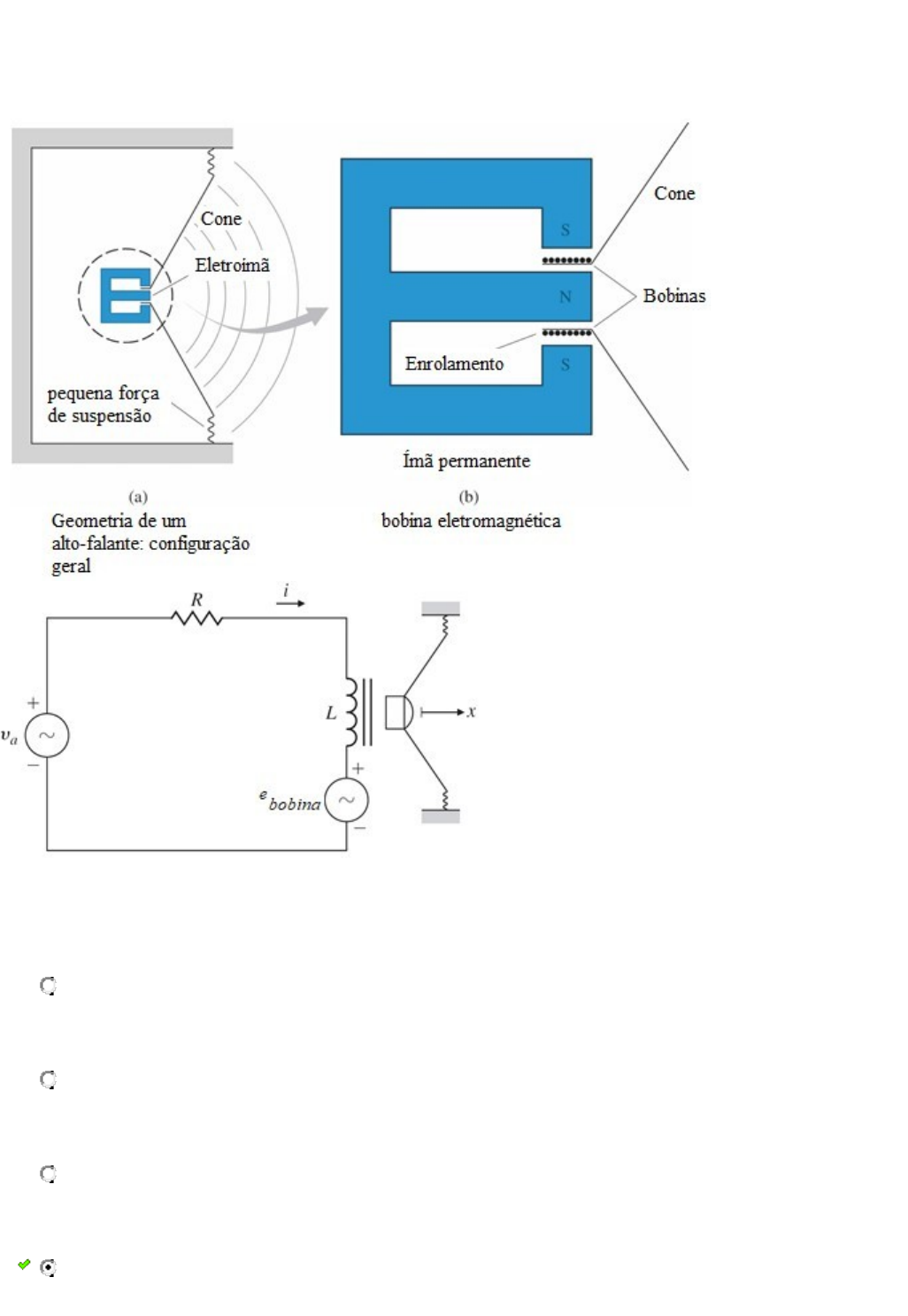 Considere a figura do alto-falante e o circuito do mesmo, mostrados nas figuras a seguir. Encontre as equações diferenciais relacionando a tensão de entrada va com o deslocamento x do cone, e a função de transferência. Assuma que a resistência R e a indutância L sejam eficientes. Fonte: adaptadas de Franklin et al. (2013) Ld2idt2+Ri=va−0,63x˙;X(s)Va(s)=0,63s[(Ms+b)(Ls+R)+0,632]Ld2idt2+Ri=va−0,63ẋ;X(s)Va(s)=0,63s[(Ms+b)(Ls+R)+0,632] Ldidt+Ri=va−0,63x˙;X(s)Va(s)=0,63[(Ms+b)(Ls+R)+0,632]Ldidt+Ri=va−0,63ẋ;X(s)Va(s)=0,63[(Ms+b)(Ls+R)+0,632] Ldidt+Ri=va−0,63x˙;X(s)Va(s)=0,63s[(Ms+b)(L+R)+0,632]Ldidt+Ri=va−0,63ẋ;X(s)Va(s)=0,63s[(Ms+b)(L+R)+0,632] Ldidt+Ri=va−0,63x˙;X(s)Va(s)=0,63s[(Ms+b)(Ls+R)+0,632]Ldidt+Ri=va−0,63ẋ;X(s)Va(s)=0,63s[(Ms+b)(Ls+R)+0,632] Ldidt+Ri2=va−0,63x˙;X(s)Va(s)=0,63s[(Ms+b)(Ls+R)+0,632]Ldidt+Ri2=va−0,63ẋ;X(s)Va(s)=0,63s[(Ms+b)(Ls+R)+0,632] Explicação: