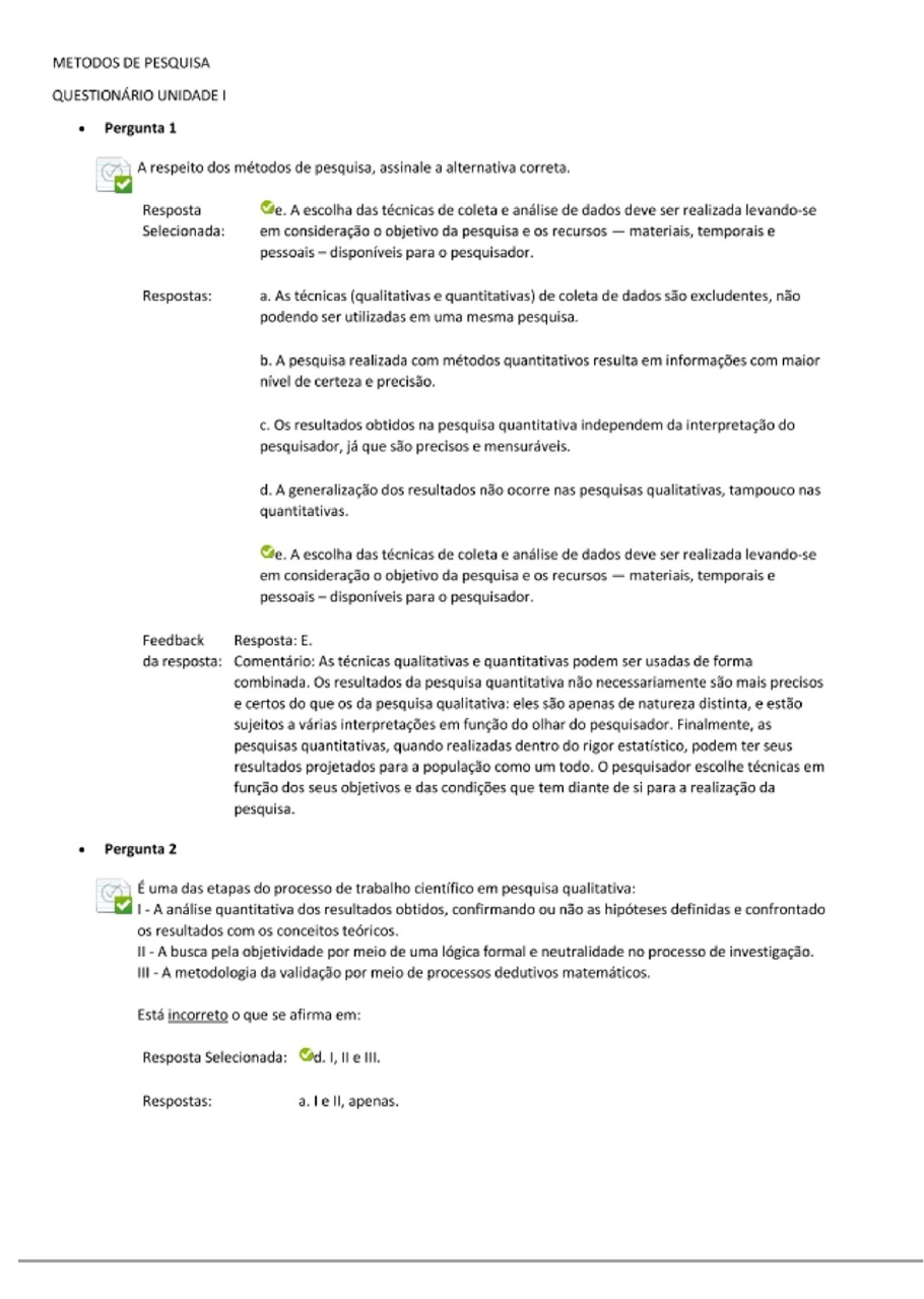 Metodos de Pesquisa_Questionário Unid I_UNIP METODOS DE PESQUISA QUESTIONÁRIO UNIDADE I • Pergunta 1 A respeito dos métodos de pesquisa, assinale a alternativa correta. Resposta Selecionada: e. A escolha das técnicas de coleta e análise de dados deve ser realizada levando-se em consideração o objetivo da pesquisa e os recursos — materiais, temporais e pessoais – disponíveis para o pesquisador. Respostas: a. As técnicas (qualitativas e quantitativas) de coleta de dados são excludentes, não podendo ser utilizadas em uma mesma pesquisa. b. A pesquisa realizada com métodos quantitativos resulta em informações com maior nível de certeza e precisão. c. Os resultados obtidos na pesquisa quantitativa independem da interpretação do pesquisador, já que são precisos e mensuráveis. d. A generalização dos resultados não ocorre nas pesquisas qualitativas, tampouco nas quantitativas. e. A escolha das técnicas de coleta e análise de dados deve ser realizada levando-se em consideração o objetivo da pesquisa e os recursos — materiais, temporais e pessoais – disponíveis para o pesquisador. Feedback da resposta: Resposta: E. Comentário: As técnicas qualitativas e quantitativas podem ser usadas de forma combinada. Os resultados da pesquisa quantitativa não necessariamente são mais precisos e certos do que os da pesquisa qualitativa: eles são apenas de natureza distinta, e estão sujeitos a várias interpretações em função do olhar do pesquisador. Finalmente, as pesquisas quantitativas, quando realizadas dentro do rigor estatístico, podem ter seus resultados projetados para a população como um todo. O pesquisador escolhe técnicas em função dos seus objetivos e das condições que tem diante de si para a realização da pesquisa. • Pergunta 2 É uma das etapas do processo de trabalho científico em pesquisa qualitativa: I - A análise quantitativa dos resultados obtidos, confirmando ou não as hipóteses definidas e confrontado os resultados com os conceitos teóricos. II - A busca pela objetividade por meio de uma lógica formal e neutralidade no processo de investigação. III - A metodologia da validação por meio de processos dedutivos matemáticos. Está incorreto o que se afirma em: Resposta Selecionada: d. I, II e III. Respostas: a. I e II, apenas. b. II e III, apenas. c. I, apenas. d. I, II e III. e. III, apenas. Feedback da resposta: Resposta: D. Comentário: A pesquisa qualitativa não envolve análise quantitativa dos resultados obtidos, tampouco a busca pela objetividade por meio da lógica formal ou validação por meio de processos dedutivos matemáticos. • Pergunta 3 Analise as afirmativas abaixo em relação à elaboração de um relatório técnico: I - Um relatório de pesquisa é a exposição escrita na qual se descrevem fatos verificados mediante a investigação e a análise dos dados coletados. II - De um modo geral, podemos dizer que os relatórios são escritos com os objetivos de divulgar os dados técnicos obtidos e analisados, bem como de registrá-los em caráter permanente, disseminando-os entre a comunidade acadêmica e a não acadêmica. III - O relatório é um documento original e inédito, pelo qual se faz a difusão da informação corrente. É elaborado, principalmente, para registrar oposição de ideias em relação a pesquisas já realizadas. Em relação às afirmativas: Resposta Selecionada: a. São corretas apenas as afirmativas I e II. Respostas: a. São corretas apenas as afirmativas I e II. b. É correta apenas a afirmativa II. c. São corretas apenas as afirmativas II e III. d. É correta apenas a afirmativa III. e. São corretas as afirmativas I, II e III. Feedback da resposta: Resposta: A. Comentário: O relatório de uma pesquisa não tem como objetivo o de registrar oposição ou discordância em relação a pesquisas já realizadas. Seu principal propósito é divulgar, junto às comunidades acadêmicas e não acadêmicas, os resultados de uma investigação. • Pergunta 4 Com relação aos instrumentos qualitativos e quantitativos de pesquisa, assinale a alternativa correta. Resposta Selecionada: d. Grupo focal e observação participante caracterizam-se como exemplos de instrumentos qualitativos. Respostas: a. O mérito quantitativo da pesquisa traz consigo uma gama de metodologias dentre as quais destacam-se o uso de estatísticas, entrevistas semiestruturadas e etnografia. b. A análise do discurso e de aspectos subjetivos dos indivíduos é o foco dos instrumentos quantitativos. c. A abordagem qualitativa está direcionada à uma análise objetiva dos fenômenos sociais, em um trabalho de interpretação da realidade mediante o uso de dados numéricos. d. Grupo focal e observação participante caracterizam-se como exemplos de instrumentos qualitativos. e. O uso de questionários com perguntas de respostas múltiplas – em particular, com o uso de escalas – descaracteriza e inviabiliza a construção de uma análise quantitativa. Feedback da resposta: Resposta: D. Comentário: As entrevistas semiestruturadas e a etnografia fazem parte do arsenal de técnicas da pesquisa qualitativa, tal como a análise do discurso e de aspectos subjetivos dos sujeitos; o uso de dados numéricos também é característica dos métodos quantitativos. Os questionários com uso de escalas são frequentes em investigações quantitativas. • Pergunta 5 A revisão de literatura constitui-se na fundamentação teórica do projeto de pesquisa e do trabalho acadêmico, contribuindo para: I - A obtenção de subsídios para a formulação da(s) hipótese(s) da pesquisa e correlação entre as variáveis. II - A obtenção de informações sobre os trabalhos mais recentes realizados sobre o tema. III - A definição do objetivo geral e dos objetivos específicos do projeto de pesquisa ou trabalho acadêmico. Está correto apenas o que se afirma em: Resposta Selecionada: b. I e II. Respostas: a. I. b. I e II. c. III. d.